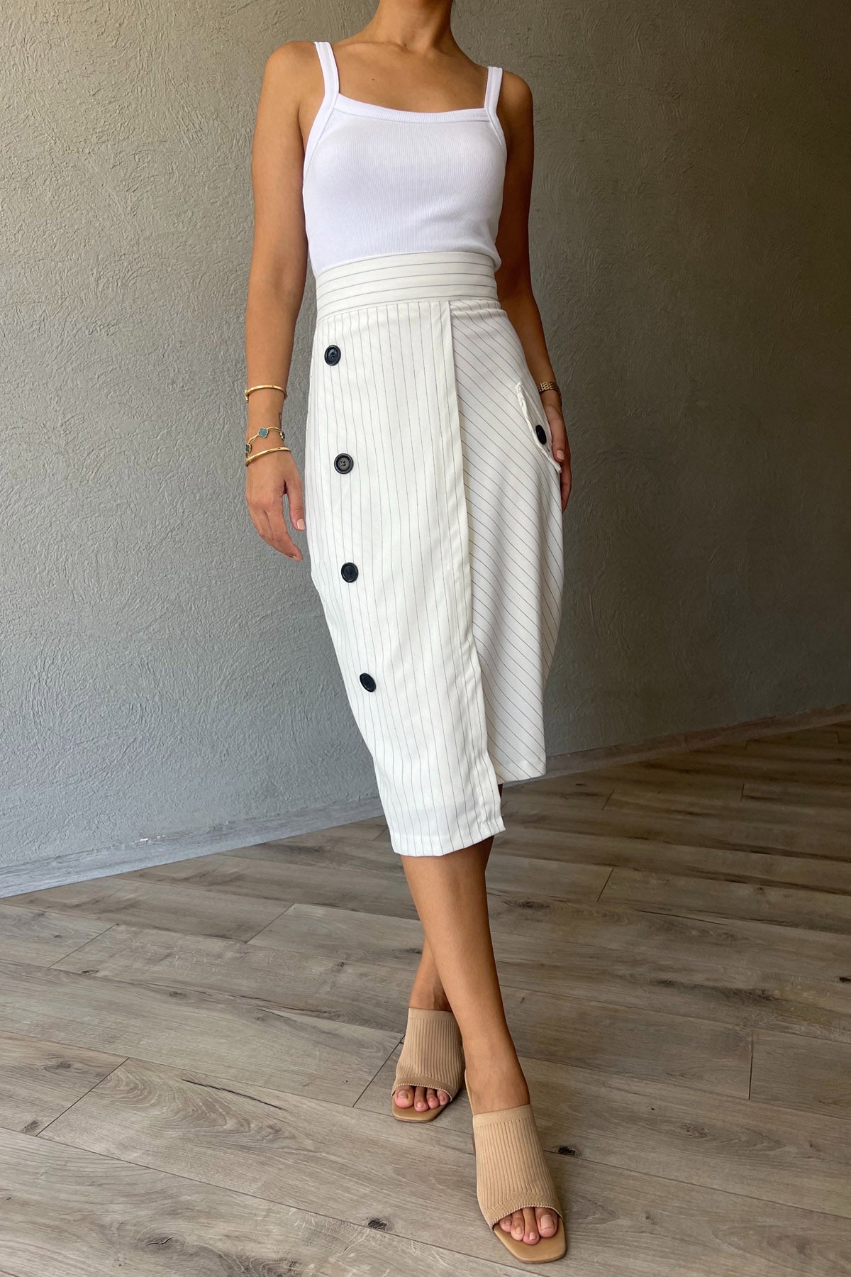 Beyaz Çizgili Midi Boy Etek SY-1642-Beyaz