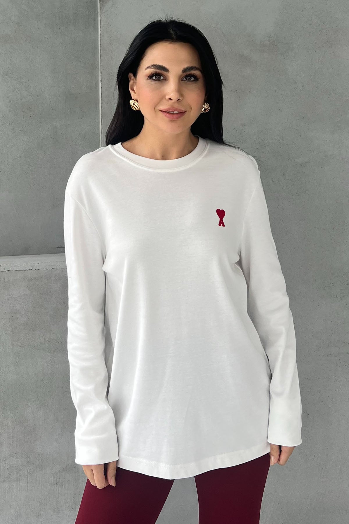 Beyaz Marka Model Kalp Nakışlı Uzun Kollu T-shirt SY-2822-Beyaz