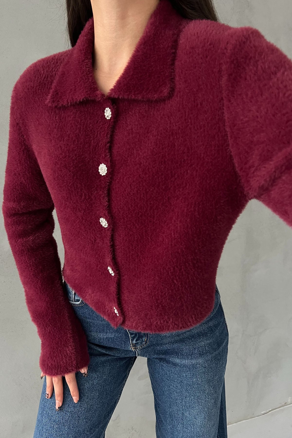 Bordo Çiçek Düğmeli Yumoş Hırka SY-2817-Bordo