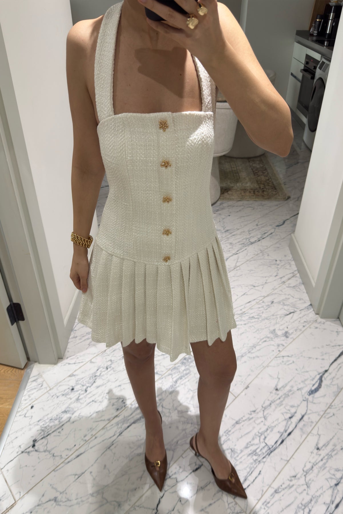 Ekru Gold Düğmeli Tüvit Sisra Mini Elbise SY-3626-Ekru