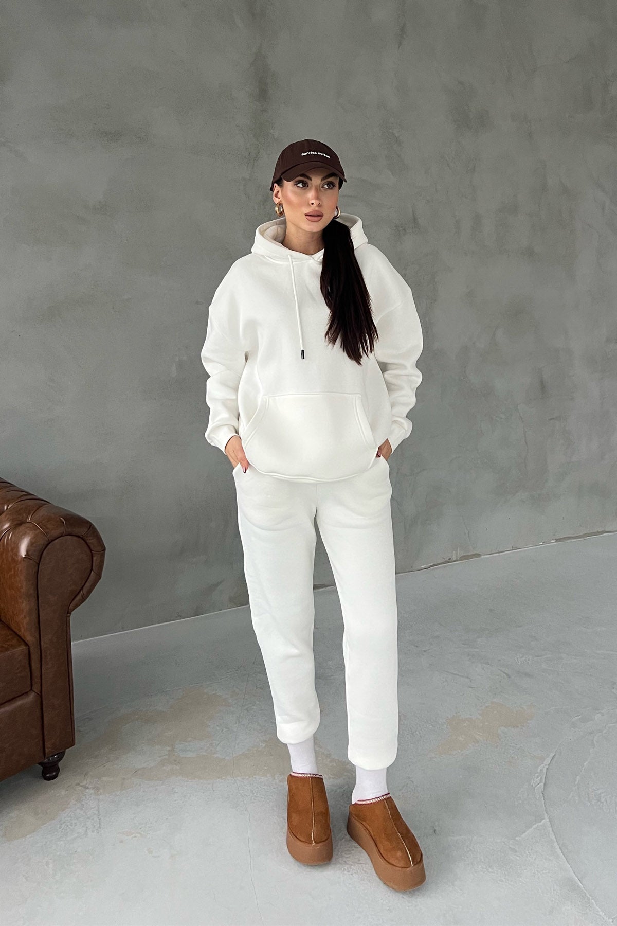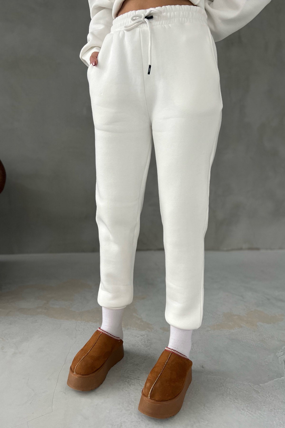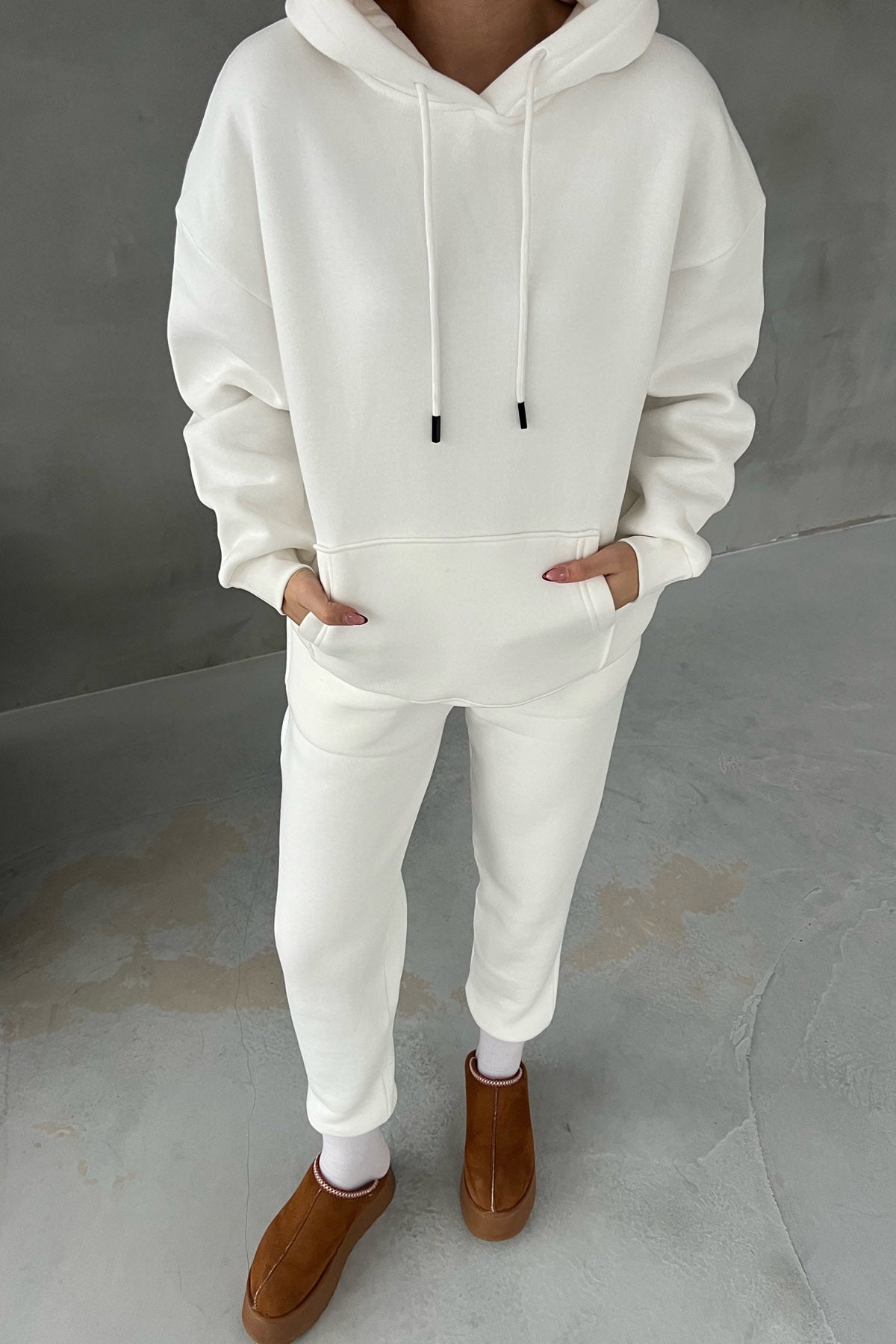 Ürün Özellikleri:Ekru Kapüşonlu Ön Cep Detaylı Eşofman Takımı