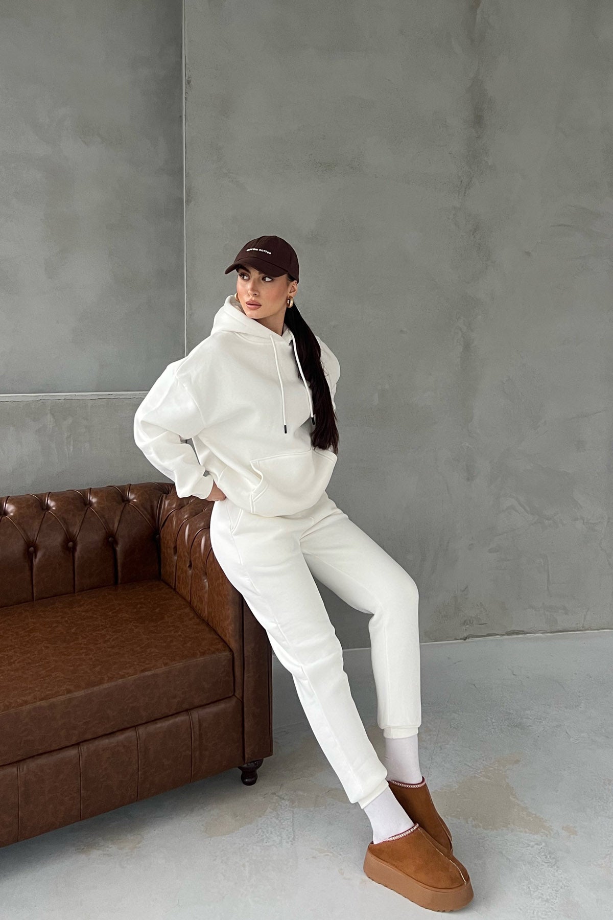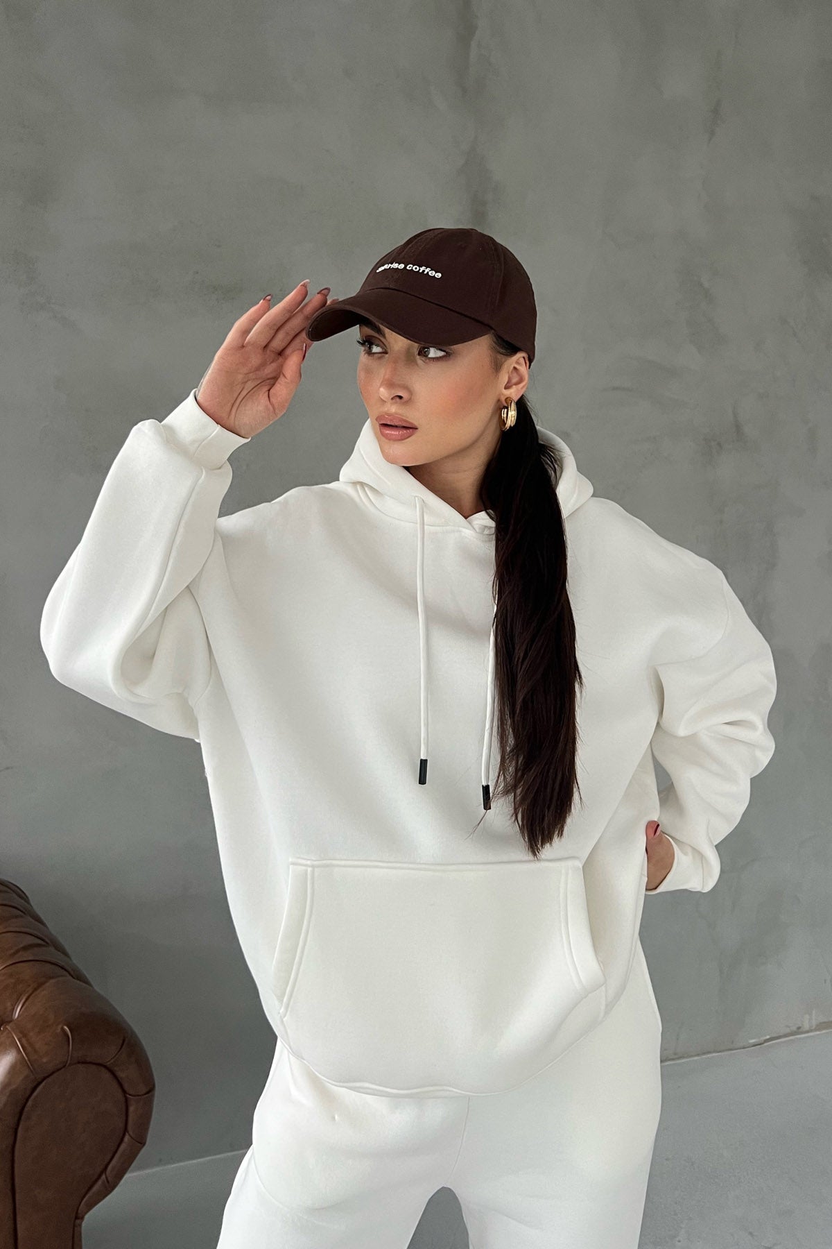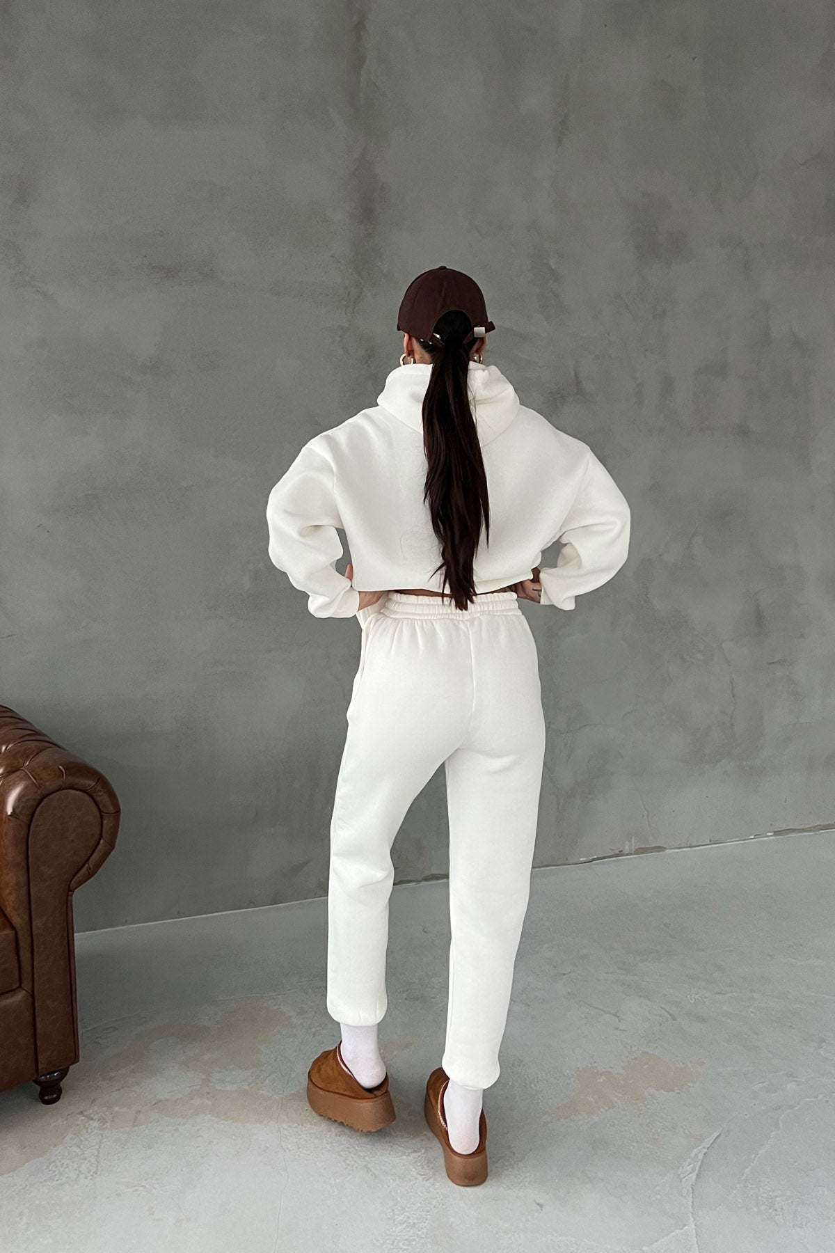 Ürün Özellikleri:Ekru Kapüşonlu Ön Cep Detaylı Eşofman Takımı