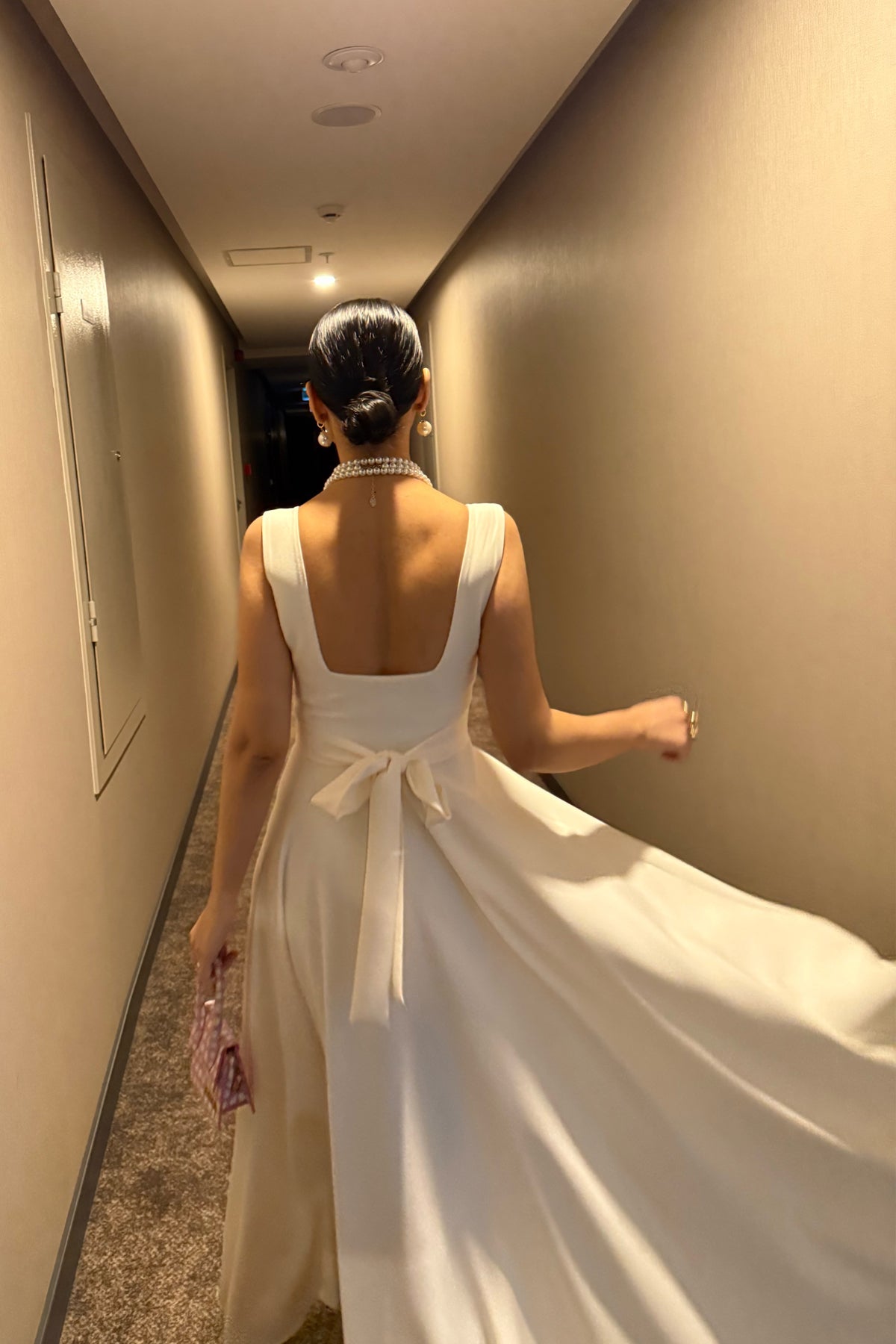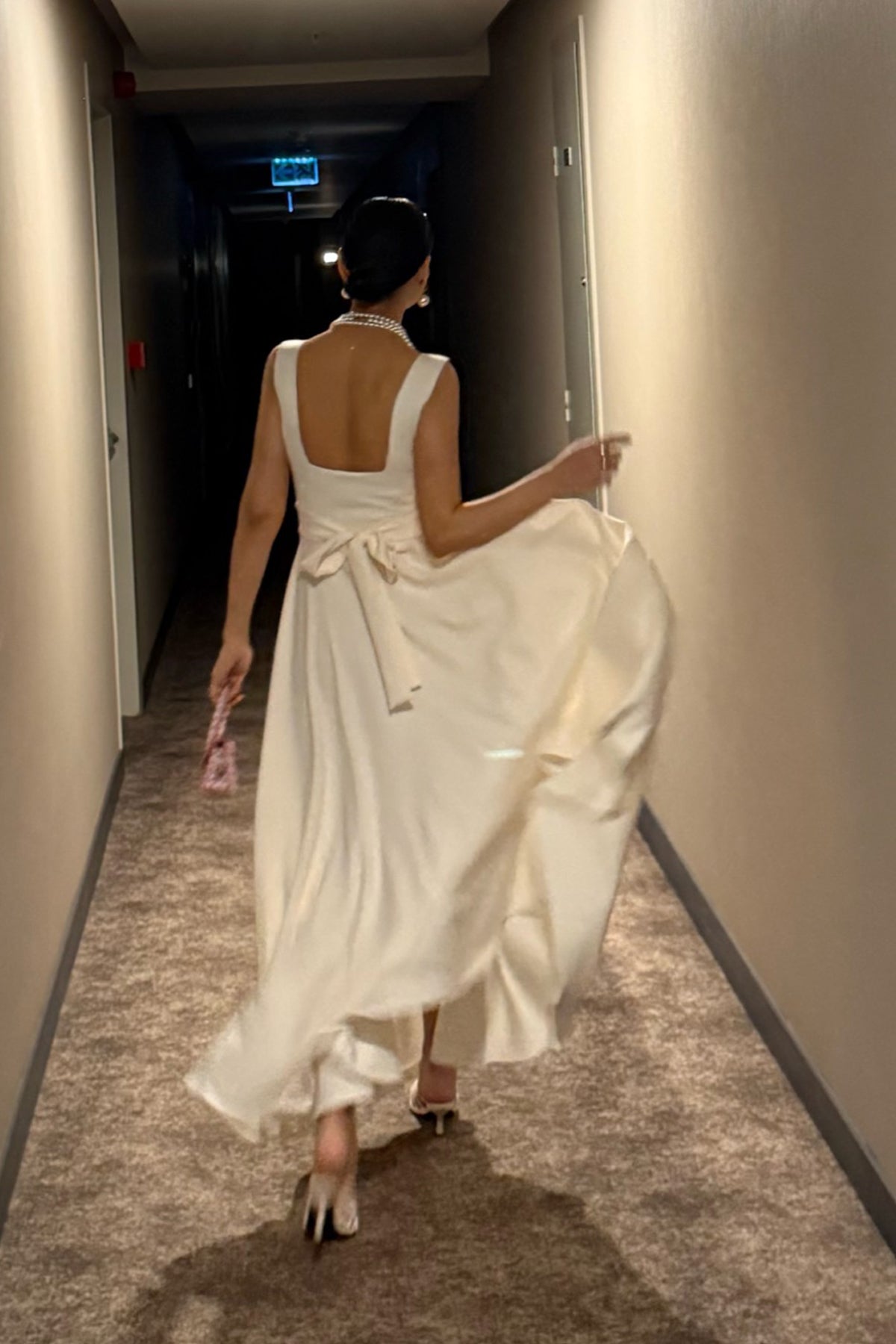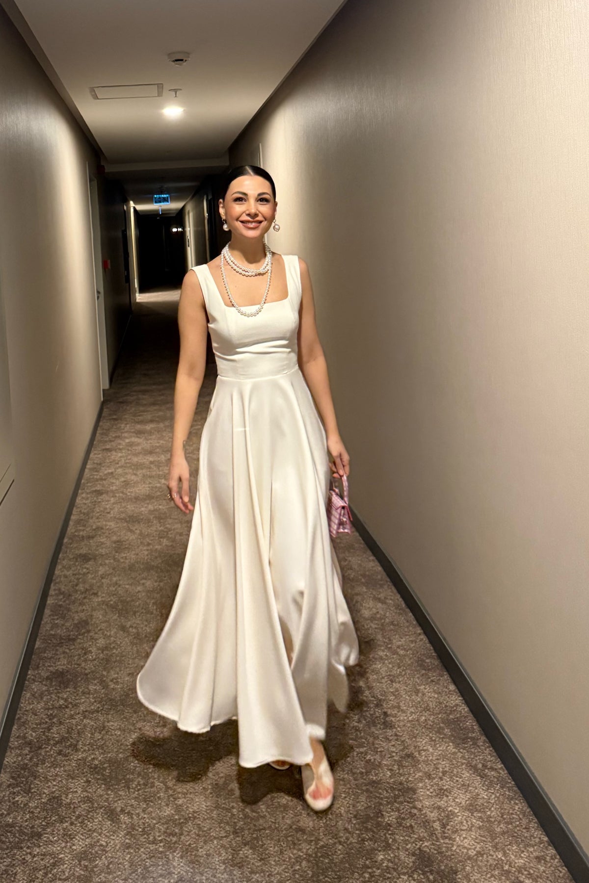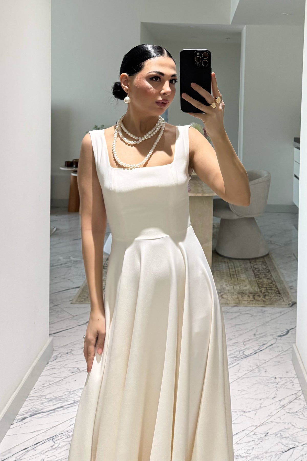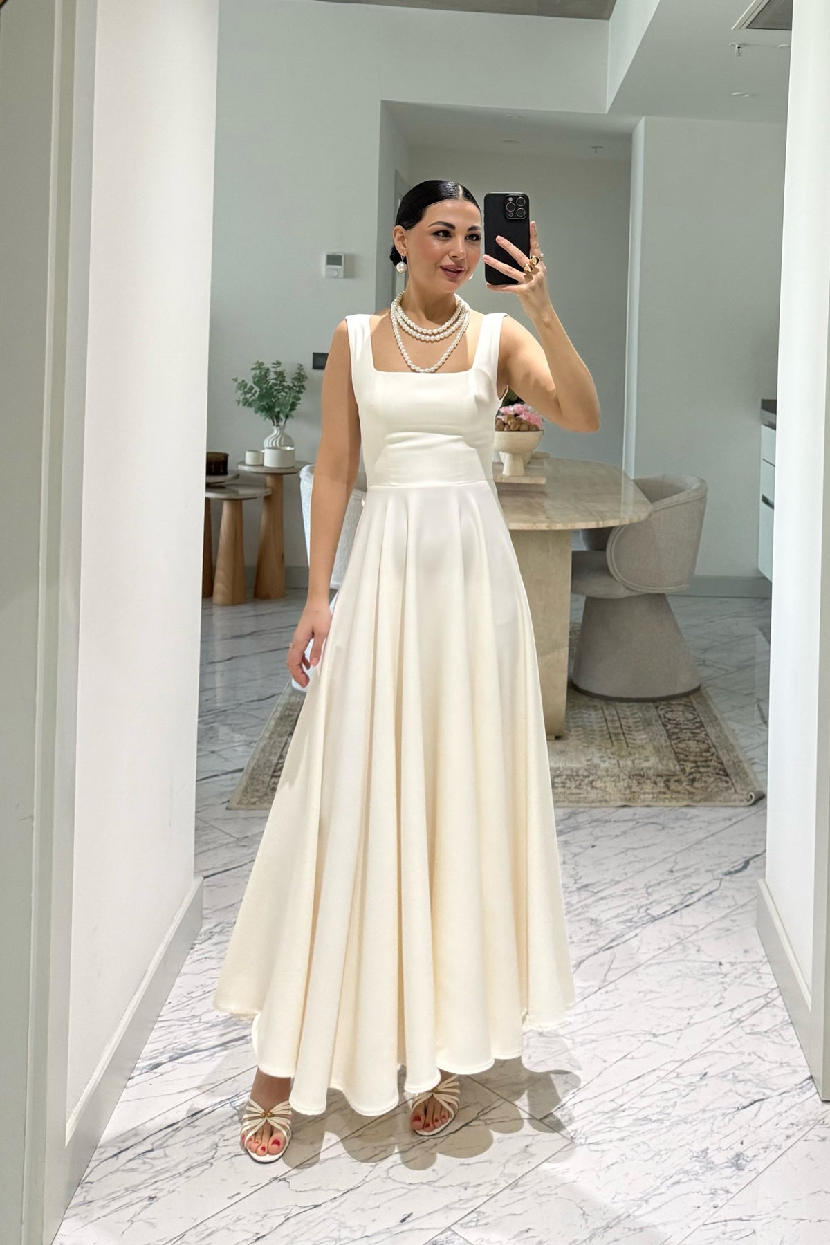Ürün Detayları:Ekru Kare Yaka Füsun Prenses Elbise