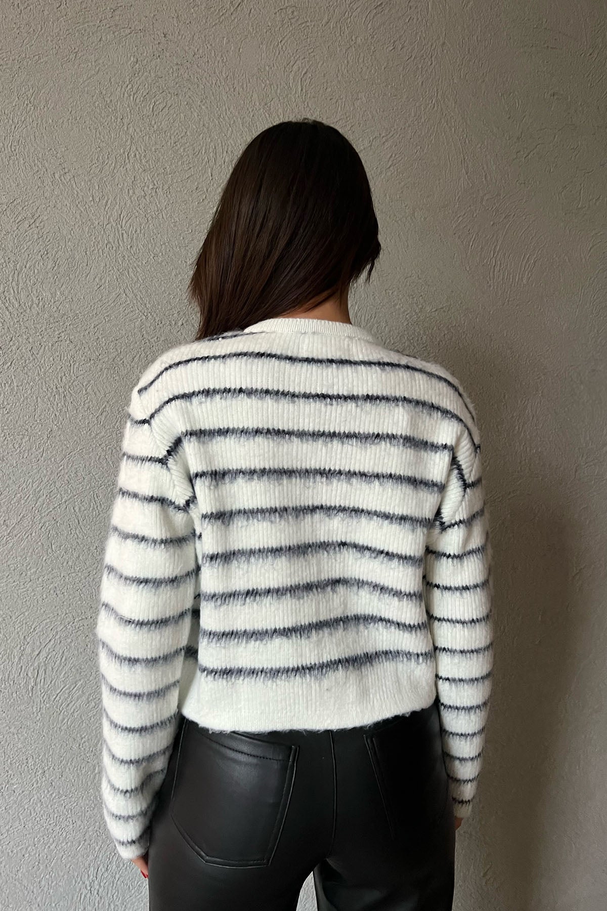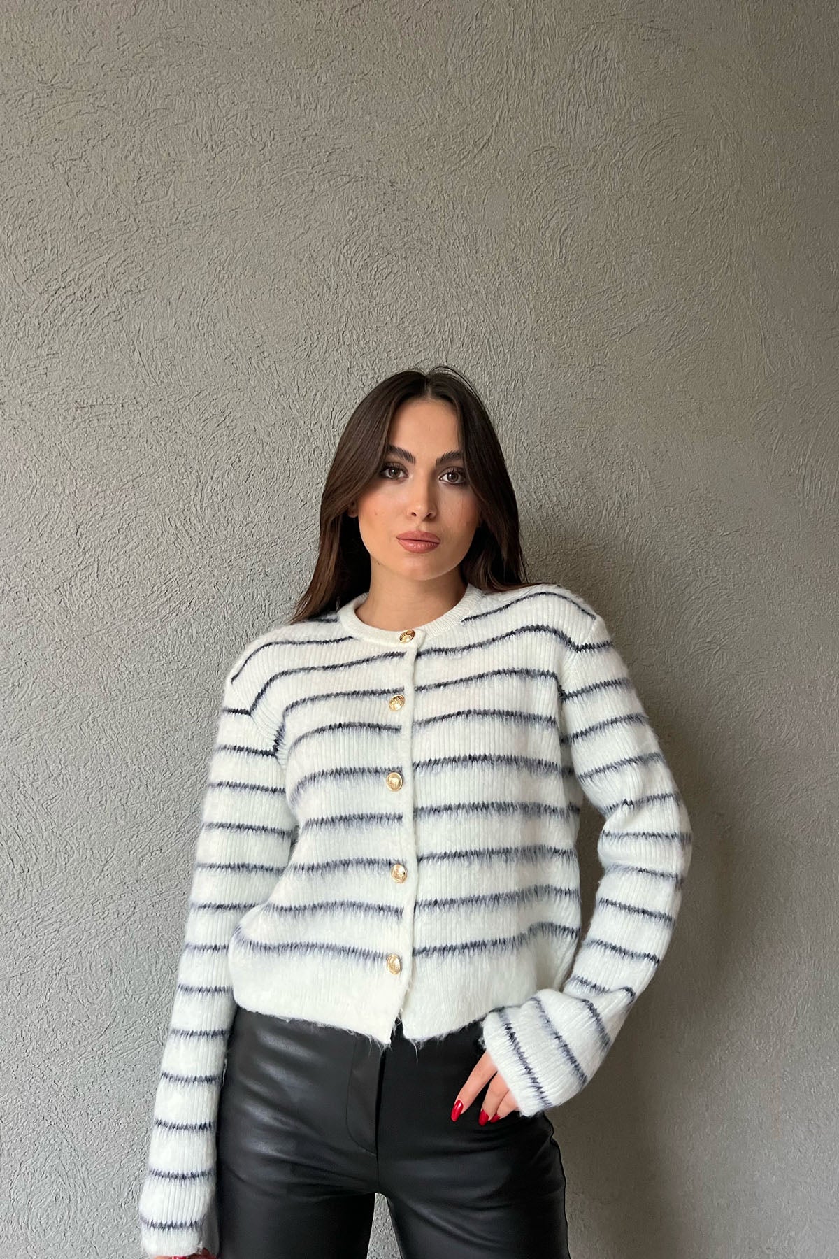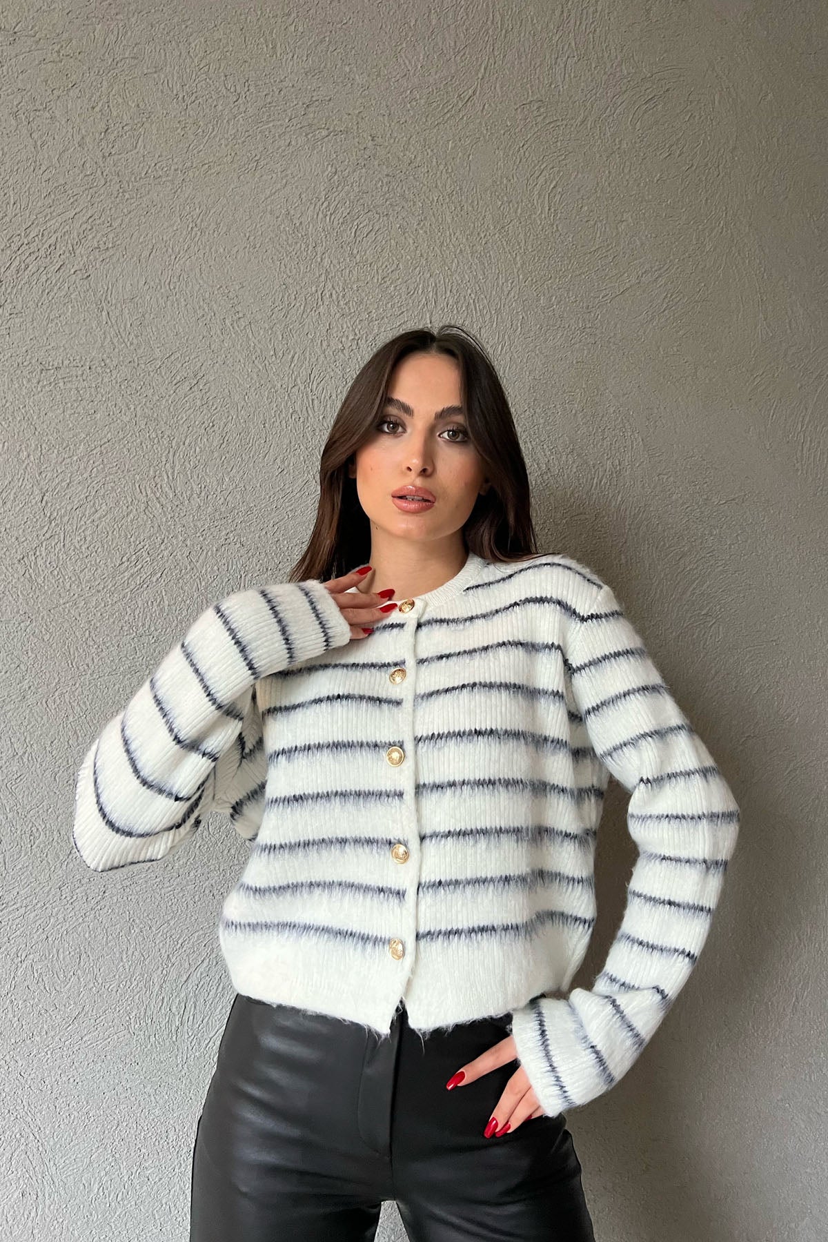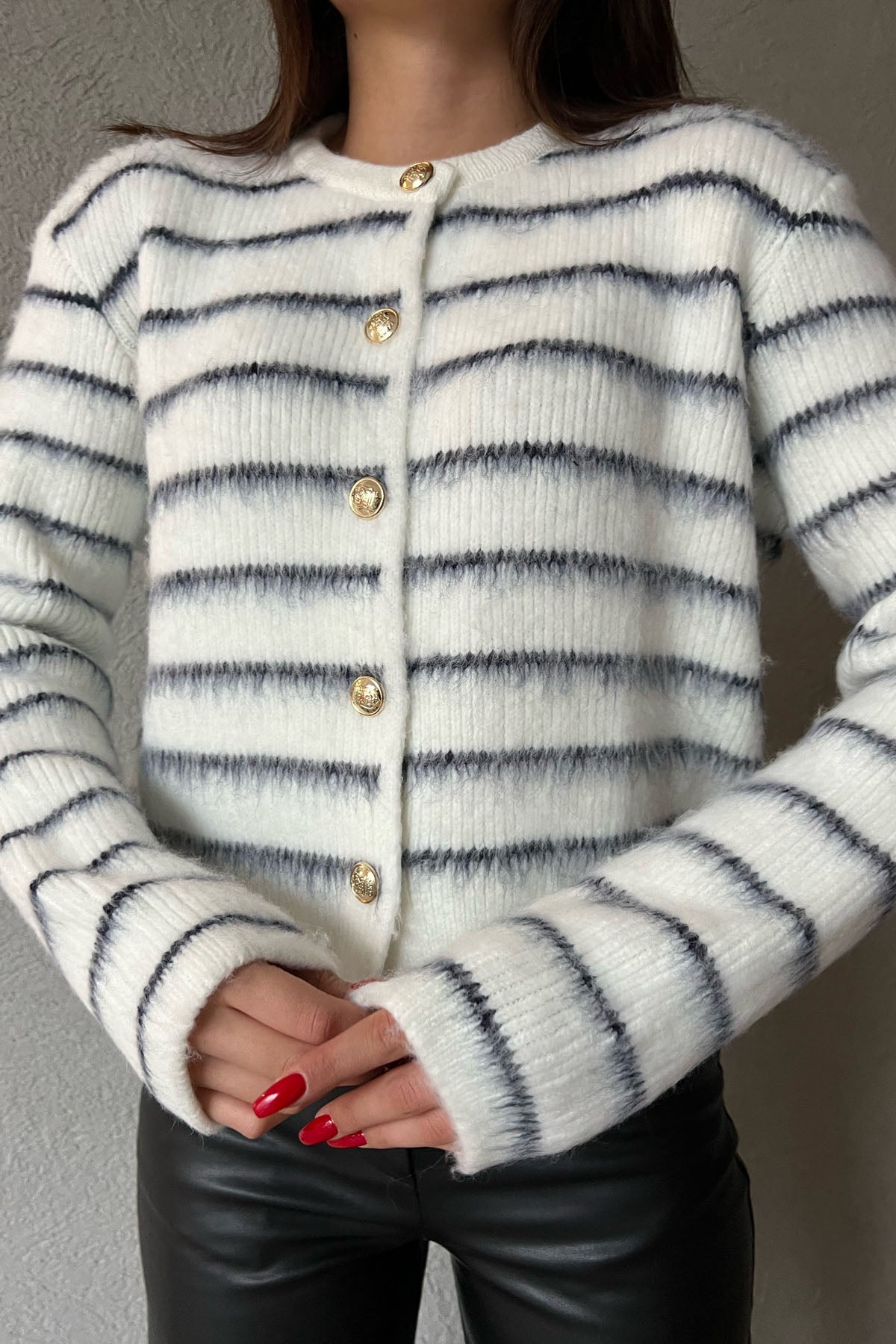 Ekru Lacivert Çizgili Şardonlu Gold Düğmeli Yuvarlak Yaka Hırka SY-1365-Ekru