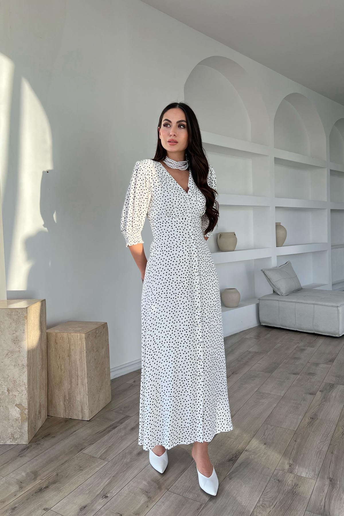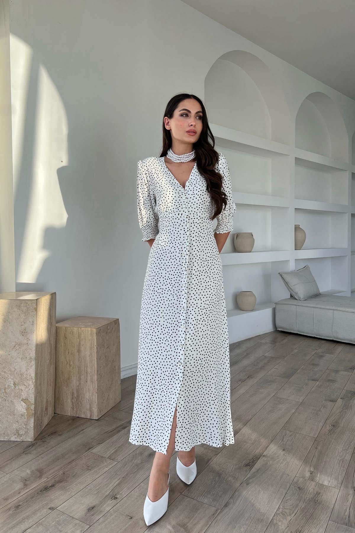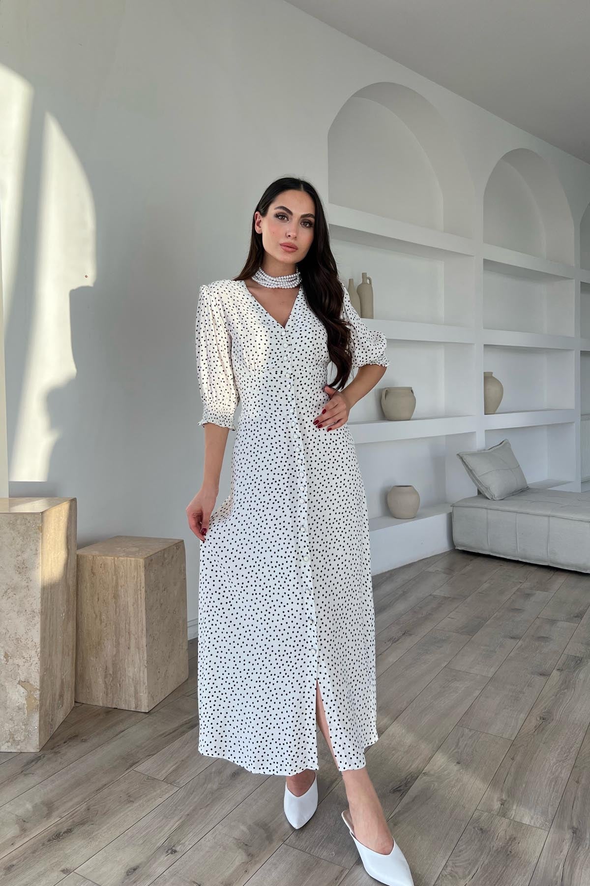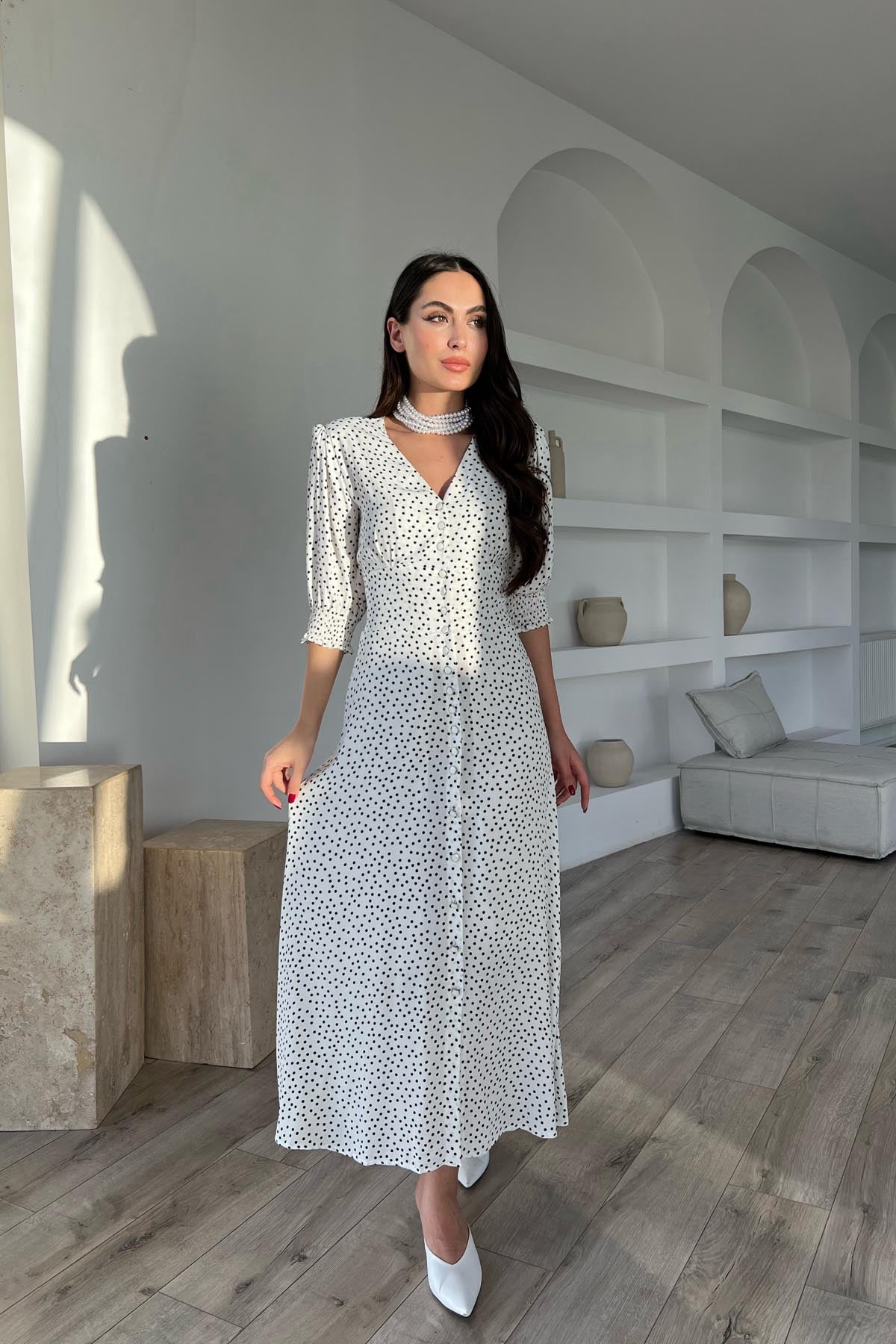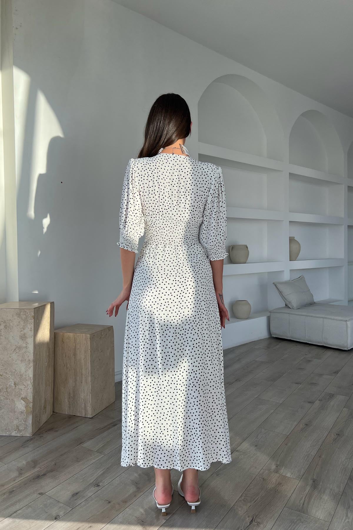 Ürün Detayları ;Ekru Puantiyeli Arka Bel ve Kol Ucu Gipeli Omuzları Vatka Detaylı Midi Boy Elbise