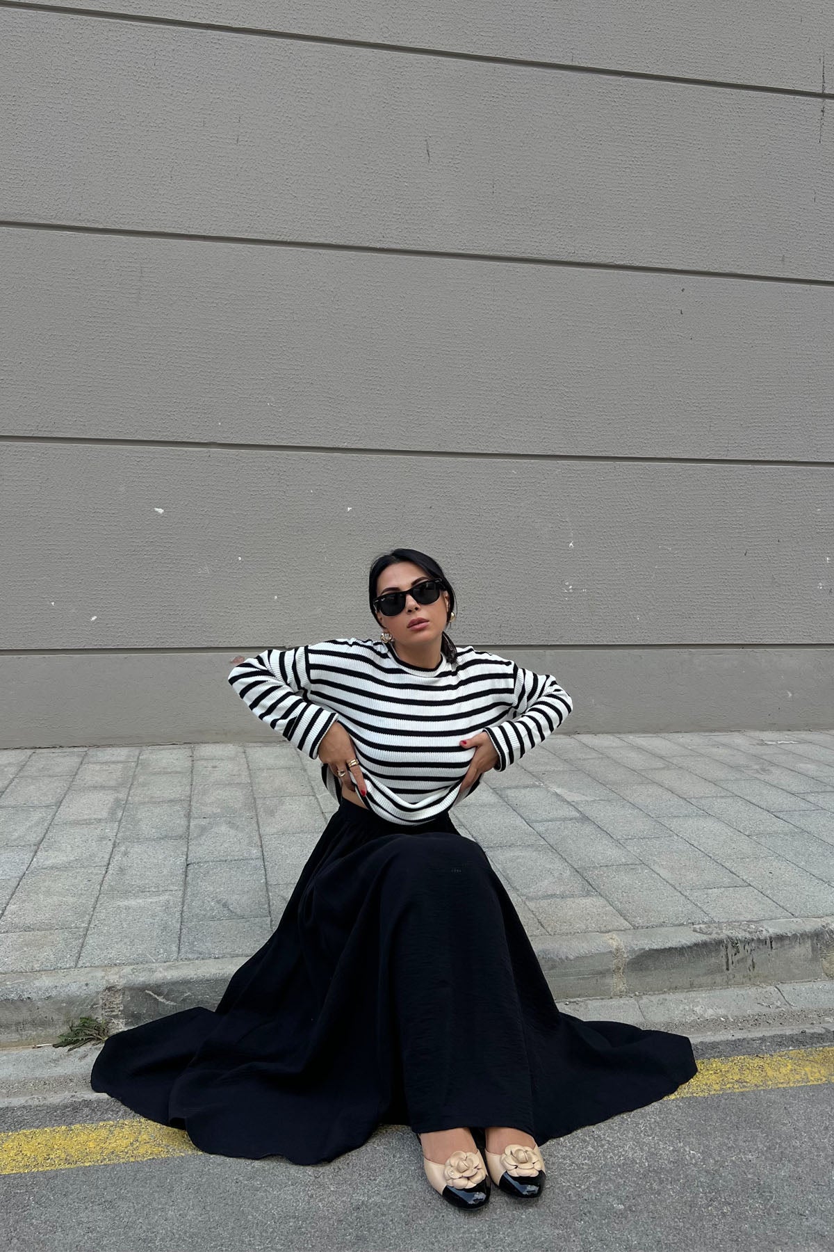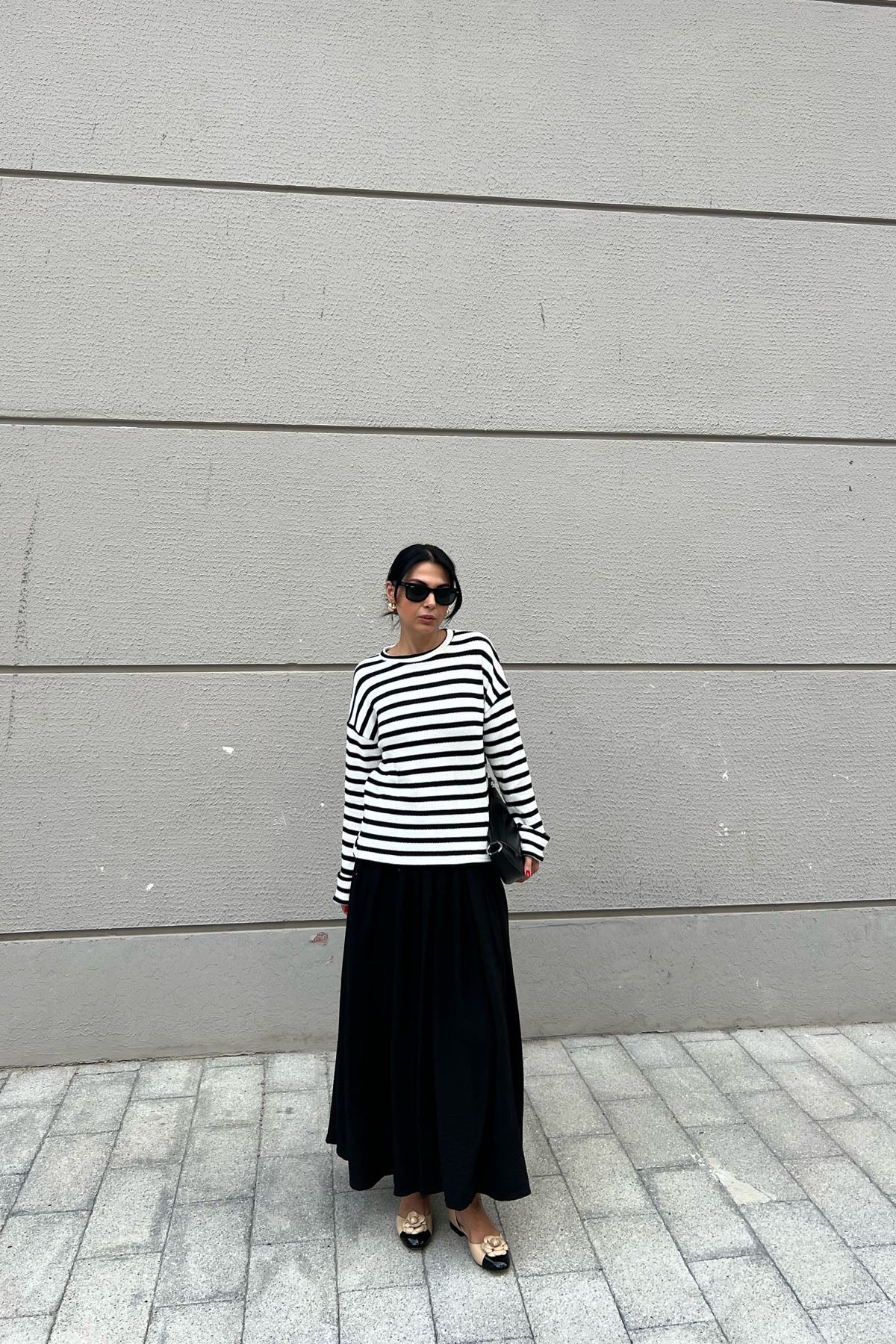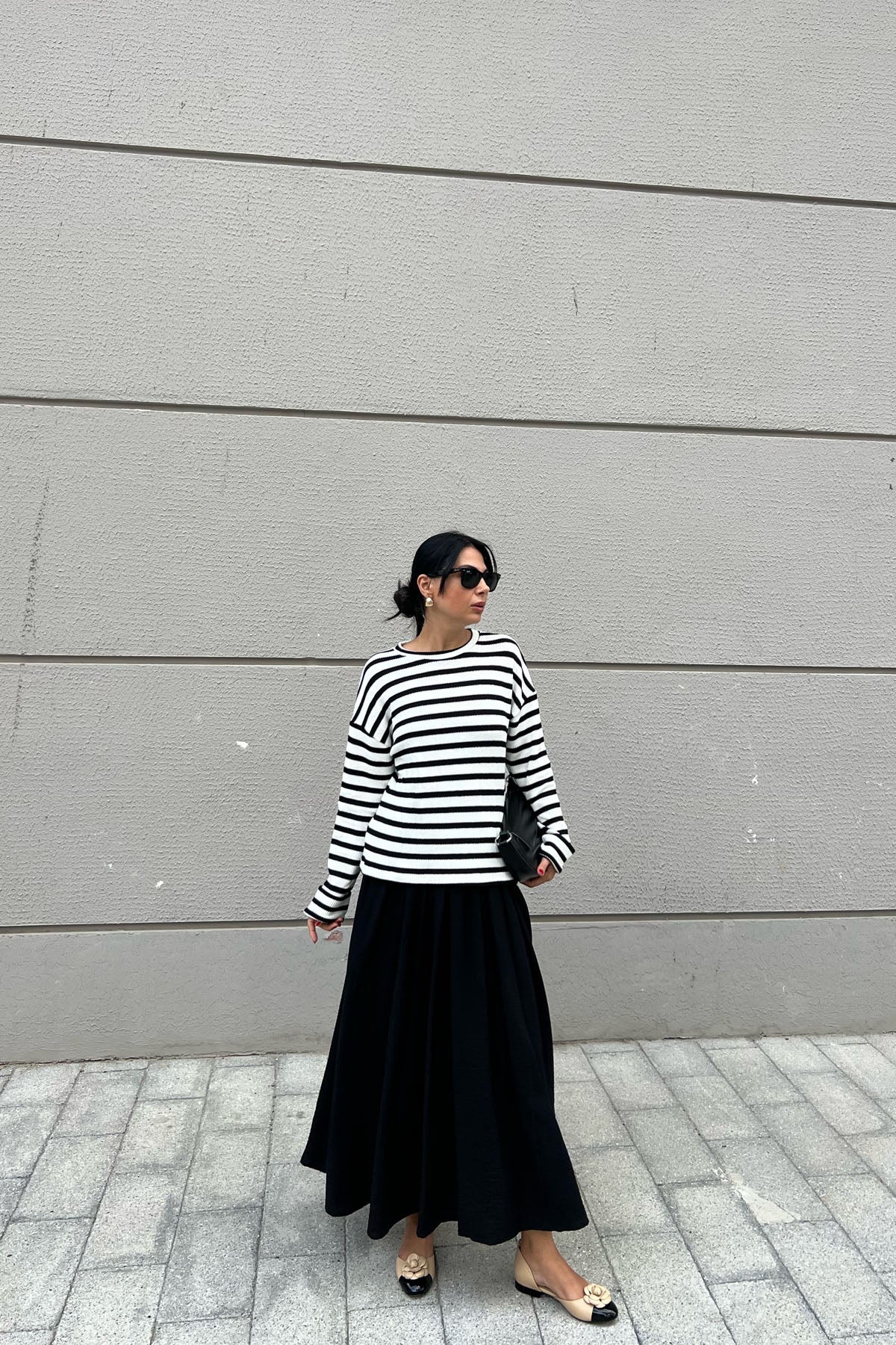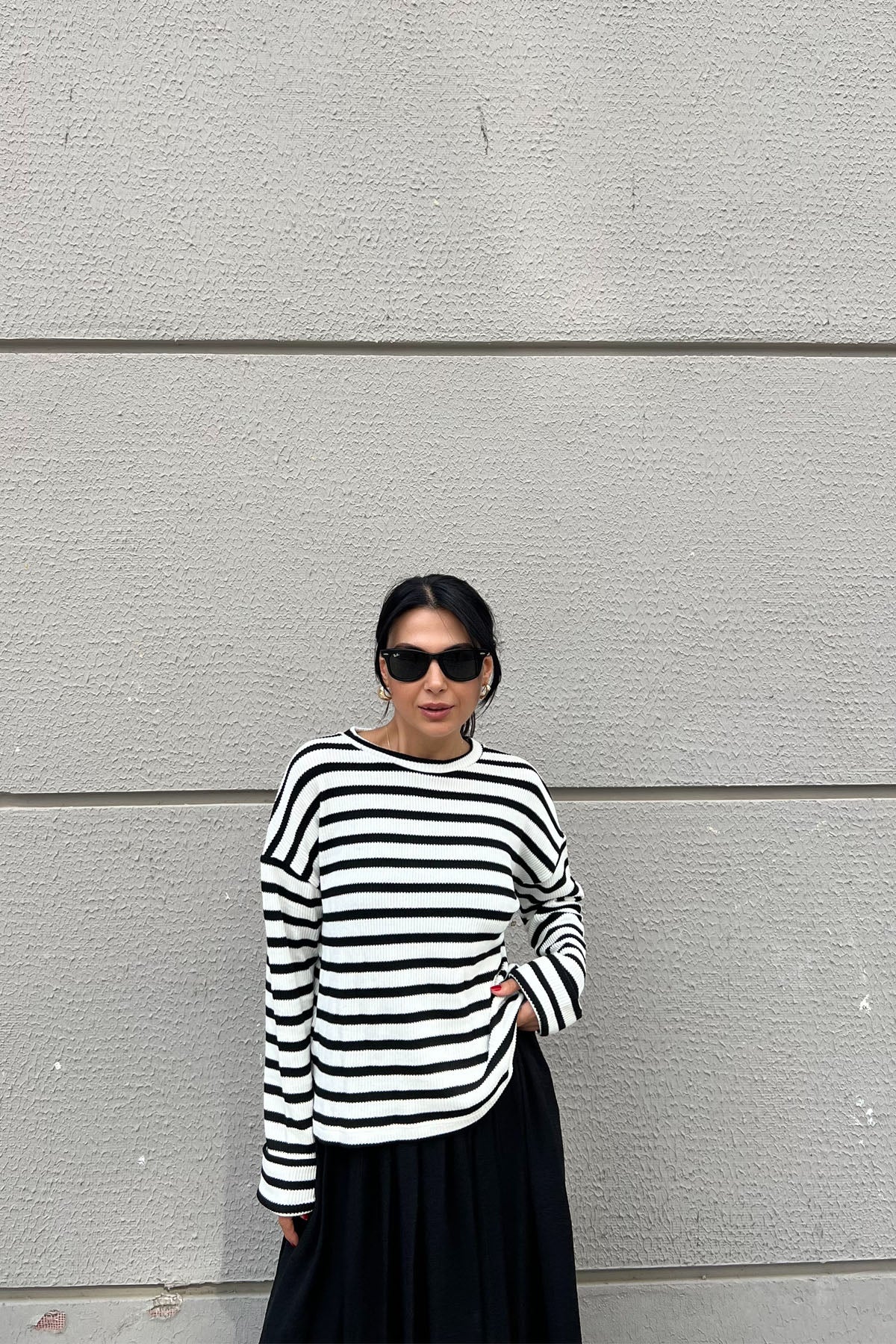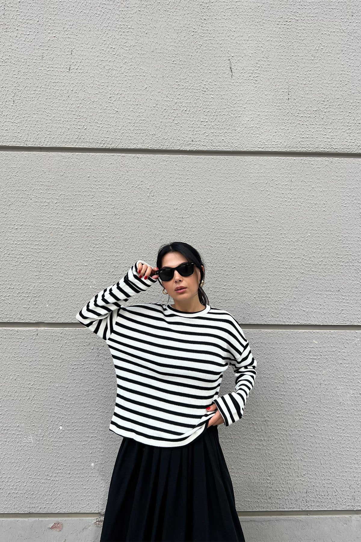 Ekru Siyah Çizgili Kolu Katlama Dikişli Uzun Kollu Triko SY-2505-Ekru