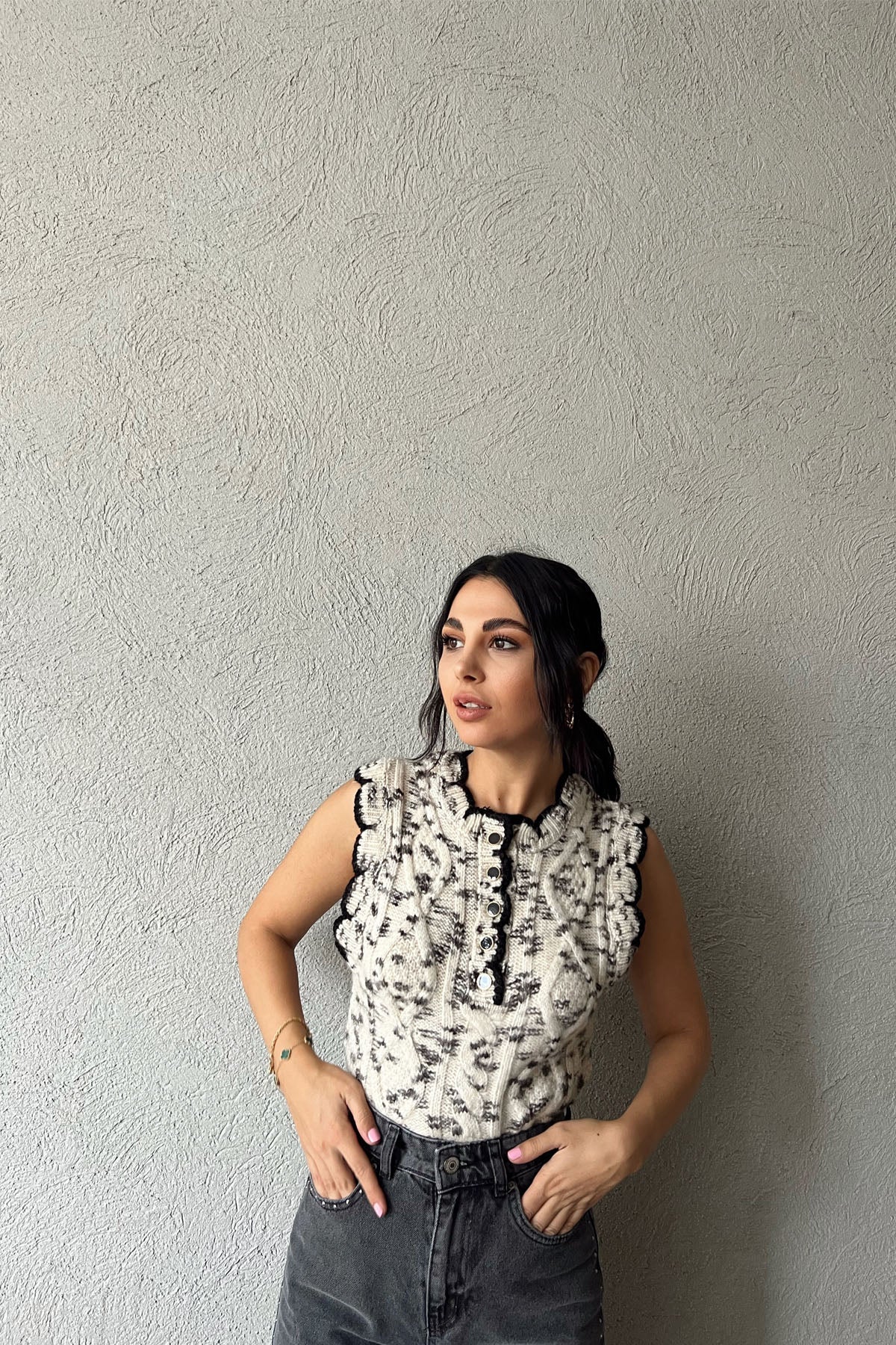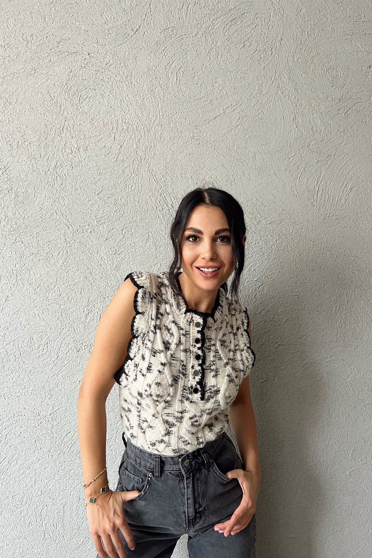 Ekru Siyah Düğme Detaylı Yünlü Yelek SY-1158-Ekru