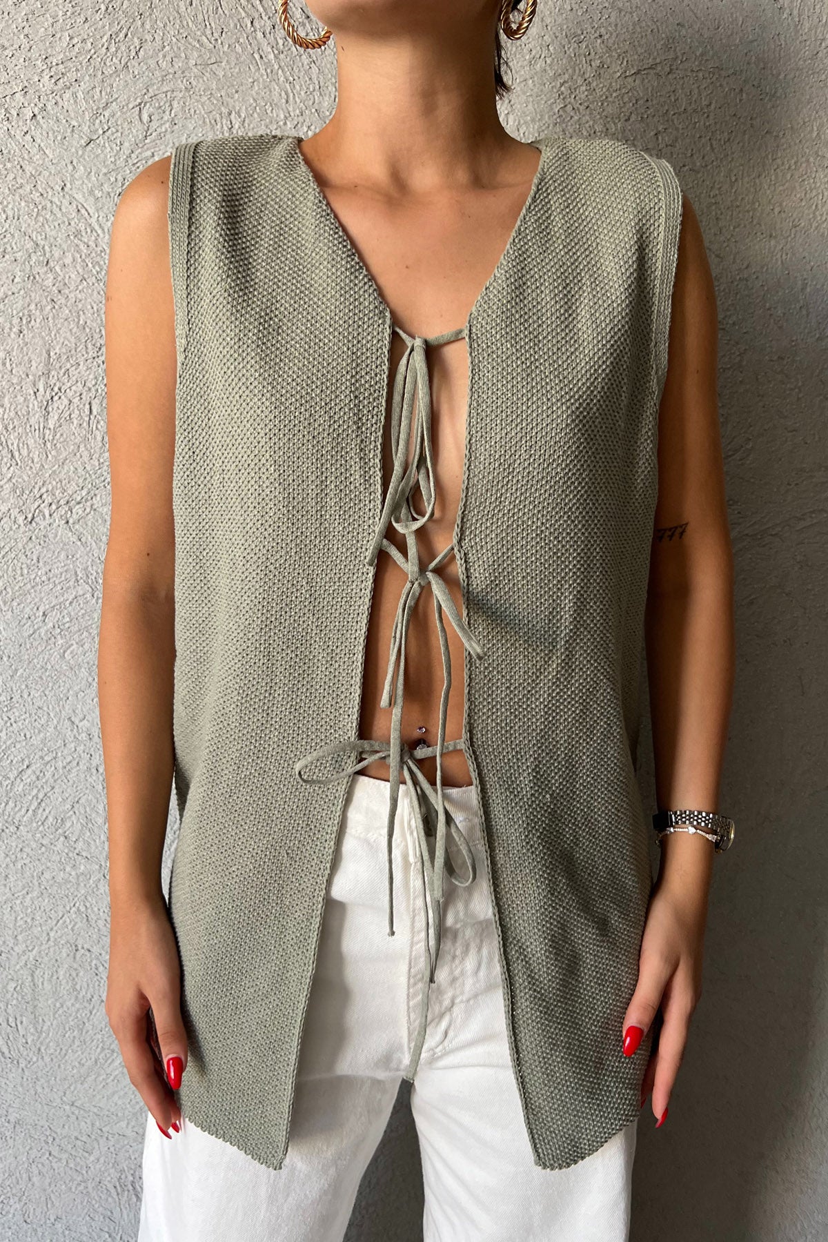 Ürün Detayları ;Haki Bağcıklı Triko Yelek
