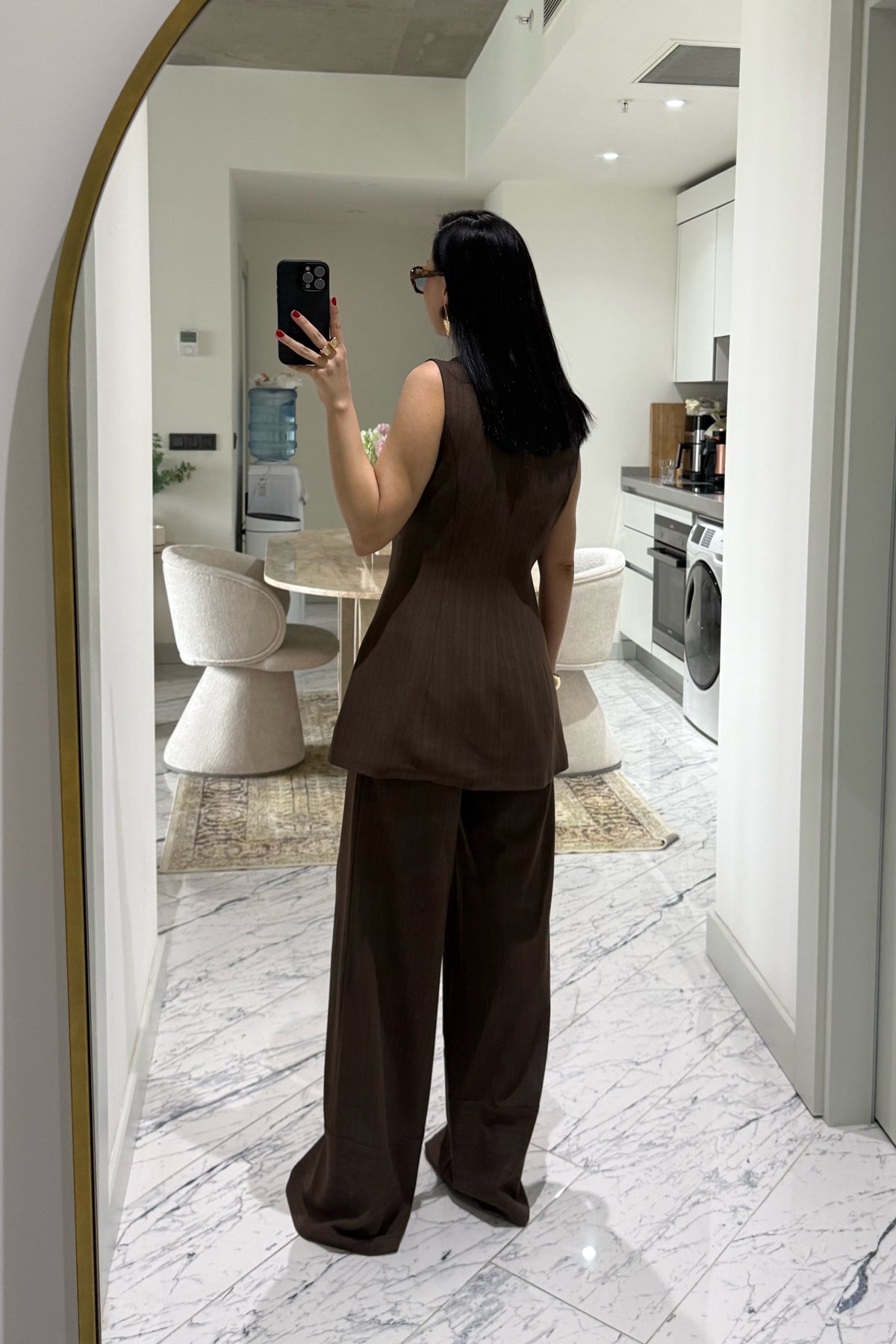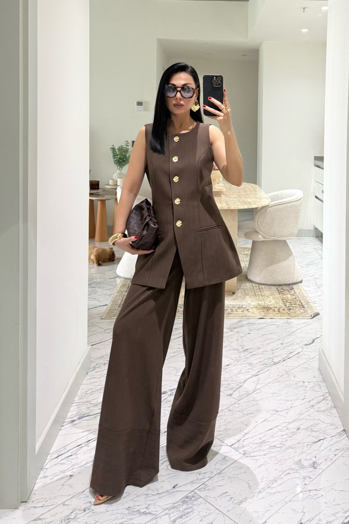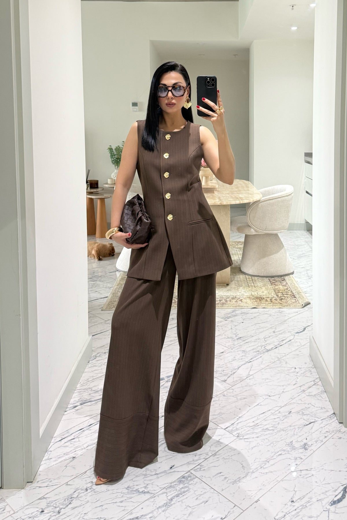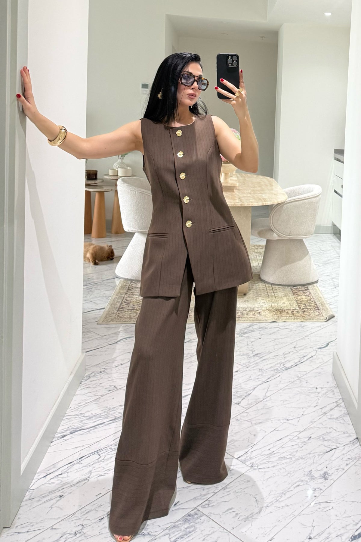 Kahve Çizgili Lidya Bol Paça Ve Yelek Takım SY-3690-Kahve