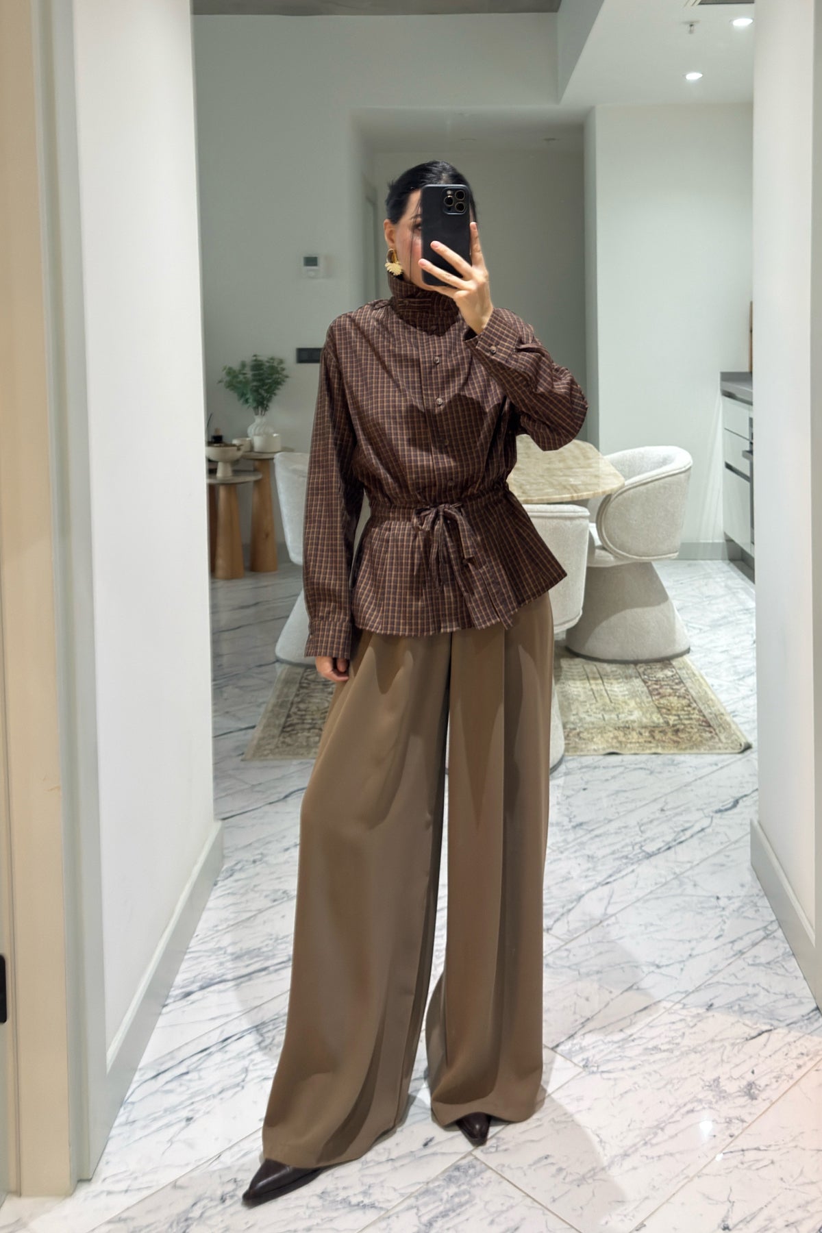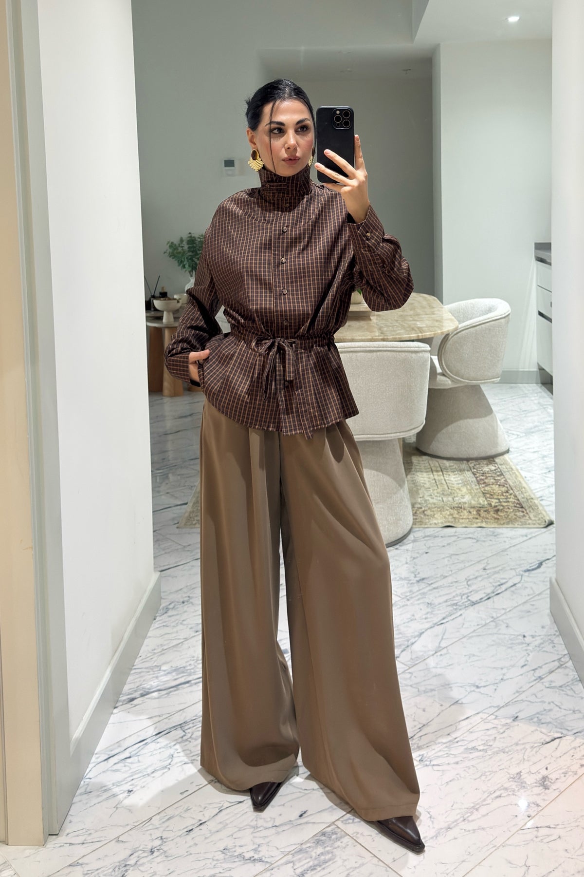 Ürün Detayları:Kahve Dik Yaka Kareli Önden Fiyonklu Gömlek