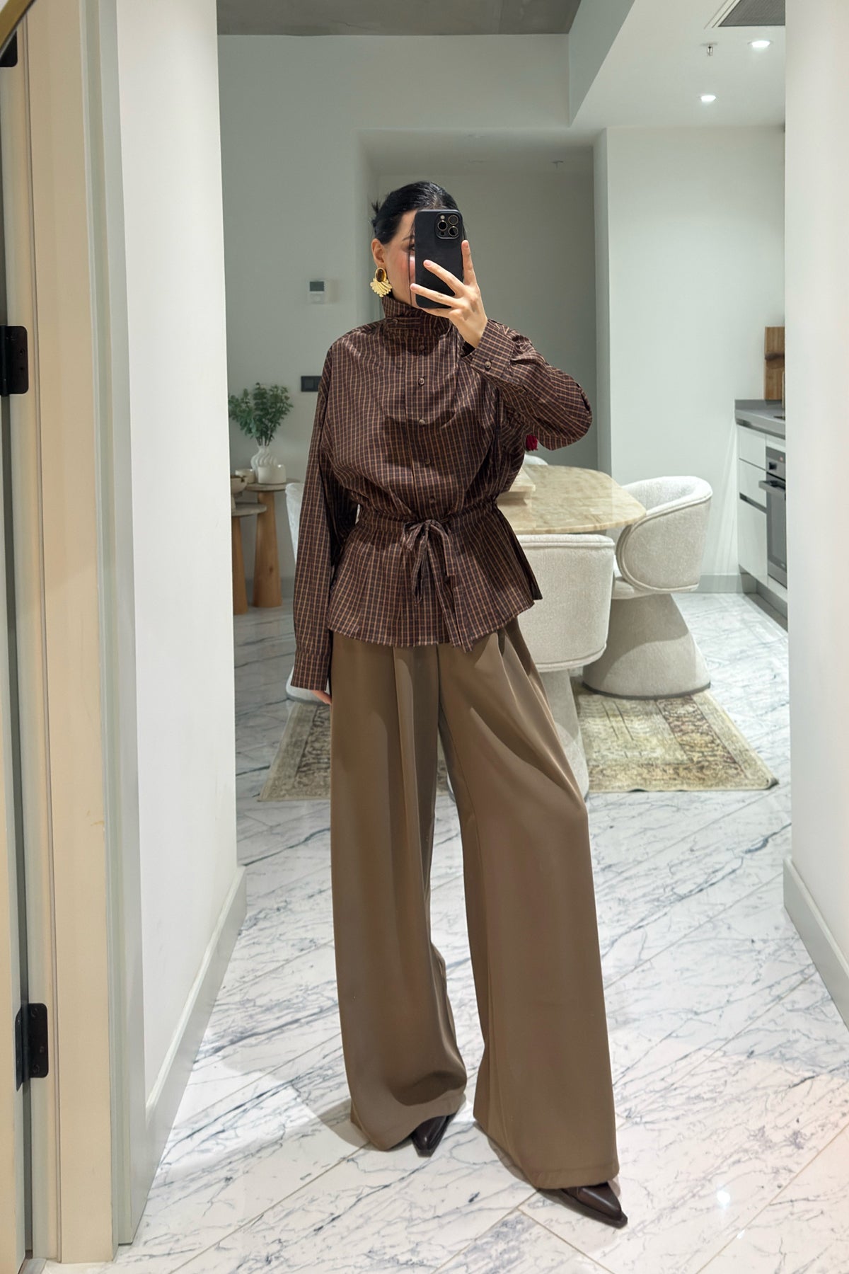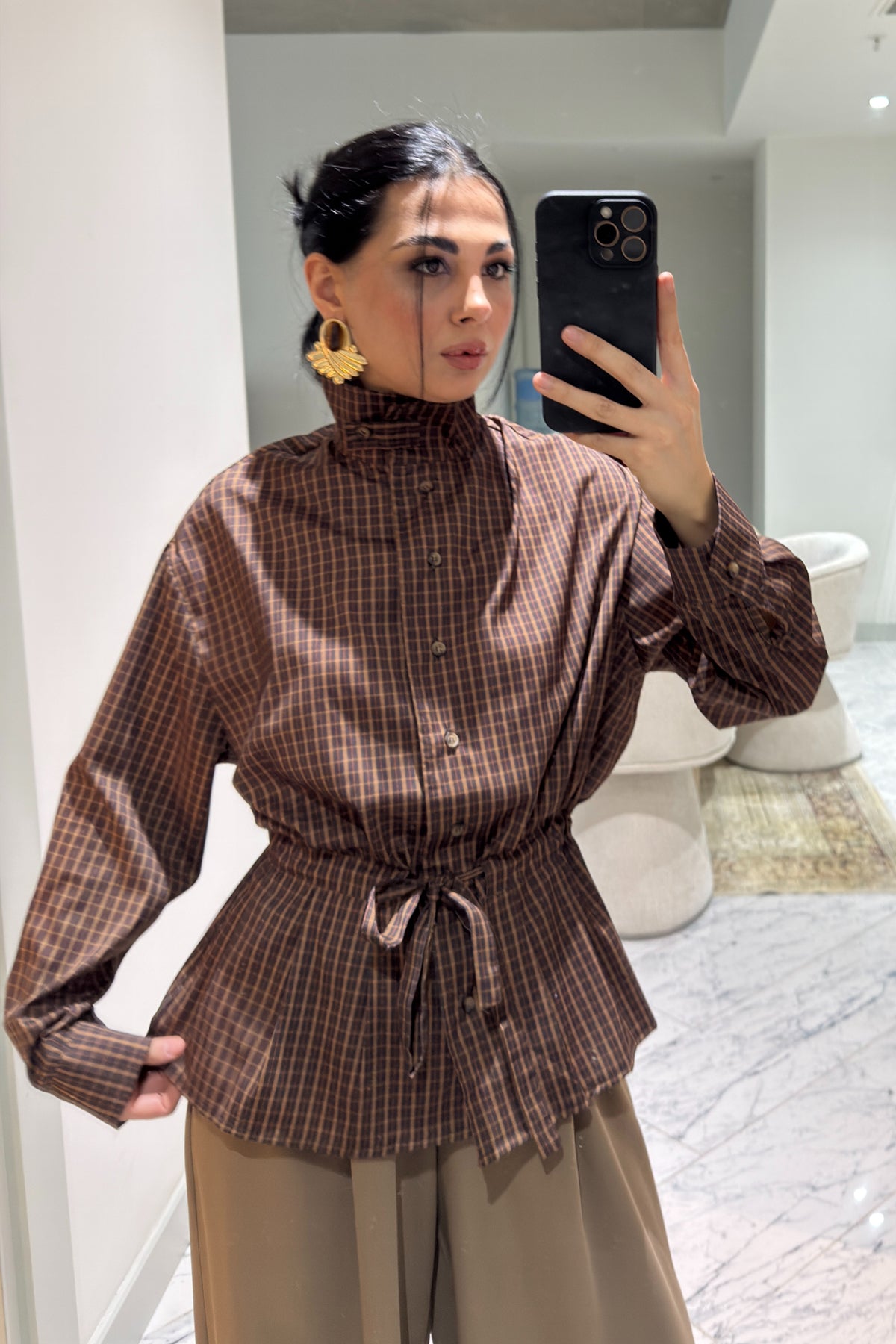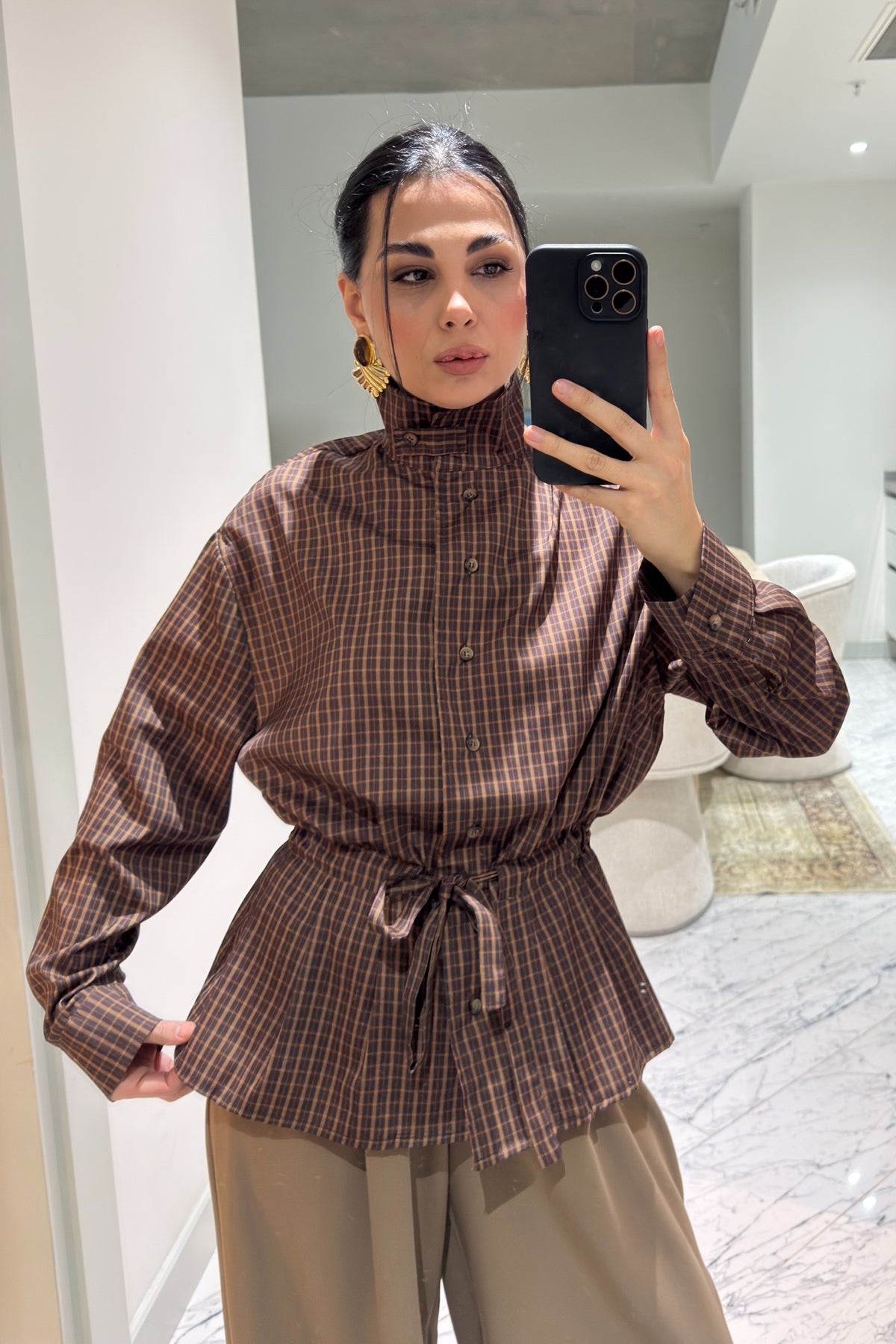 Kahve Dik Yaka Kareli Önden Fiyonklu Gömlek SY-3620-Kahverengi