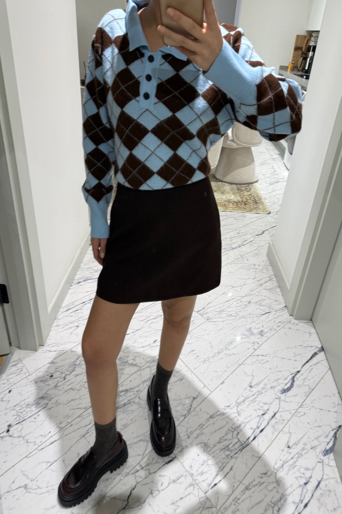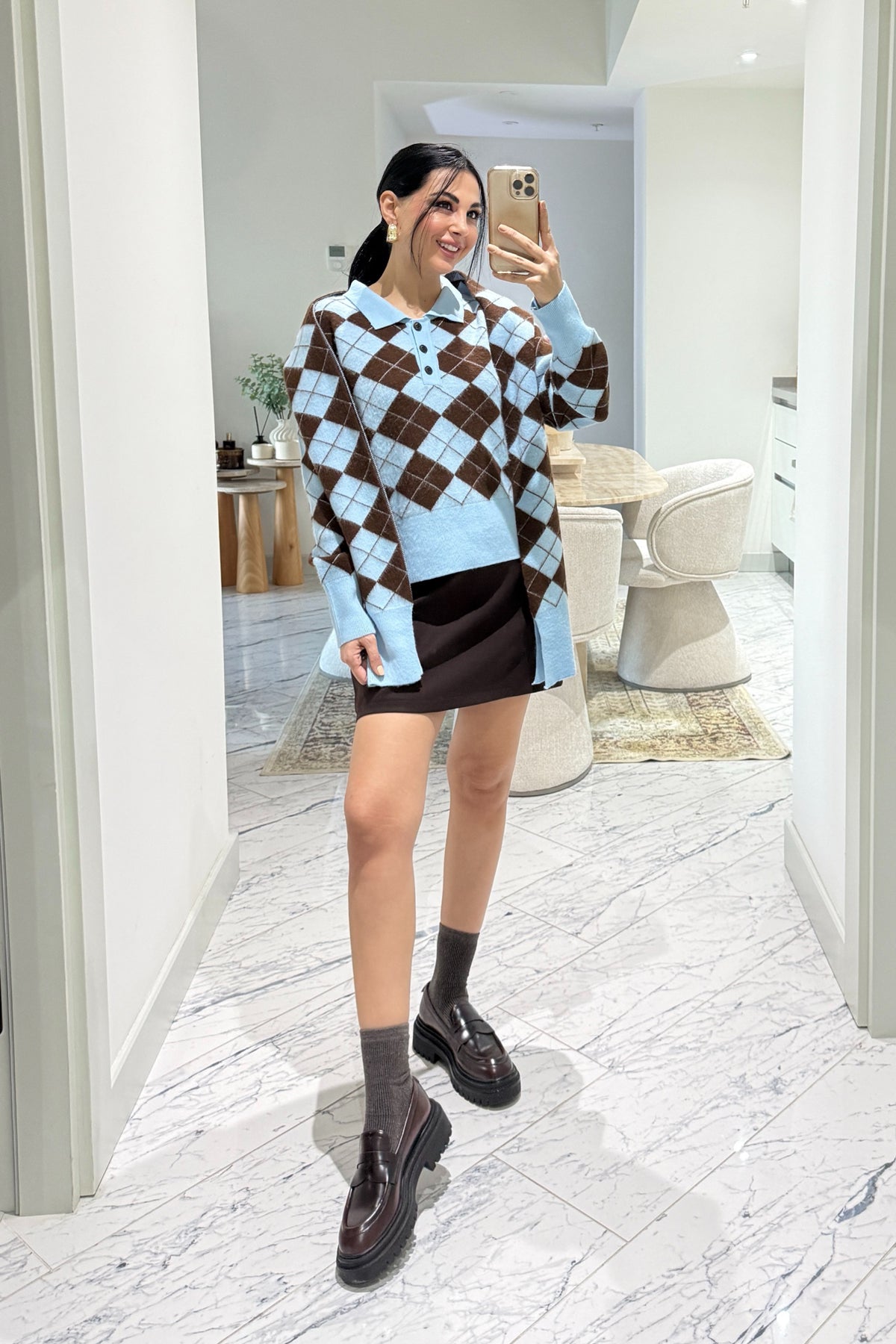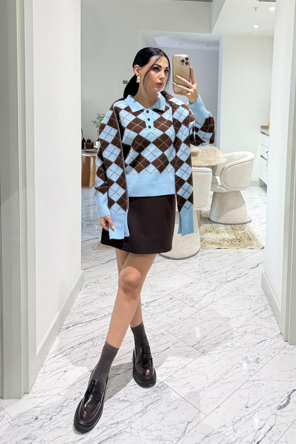 Ürün Detayları :Kendinden Şallı Baklava Desenli Polo Yaka Triko -Kaşkol Kazağa aittir .Tam kalıp tam beden önerilir.Esnektir