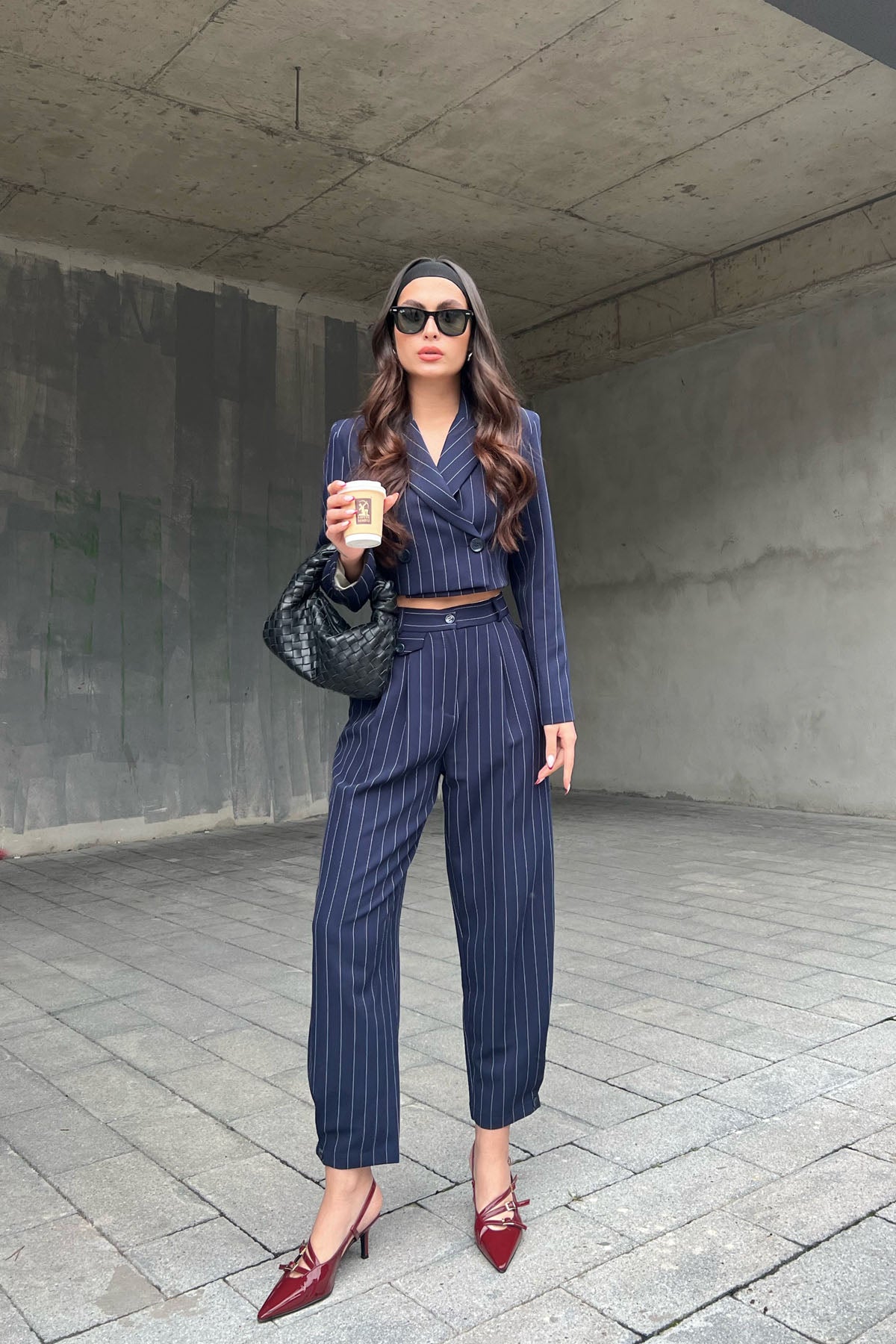 Lacivert Crop Ceket ve Paçası Düğme Detaylı Pantolon Takım SY-0935-Lacivert