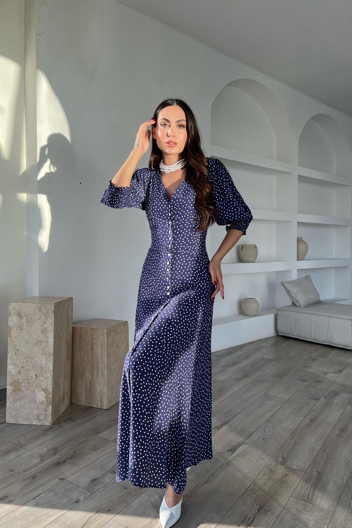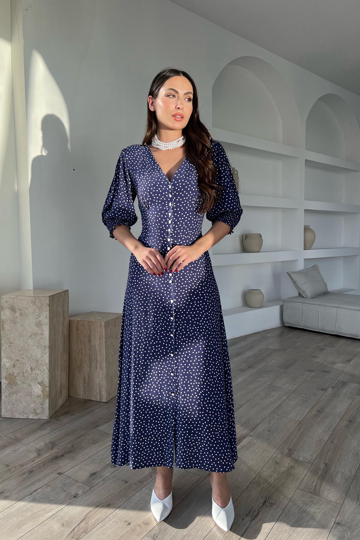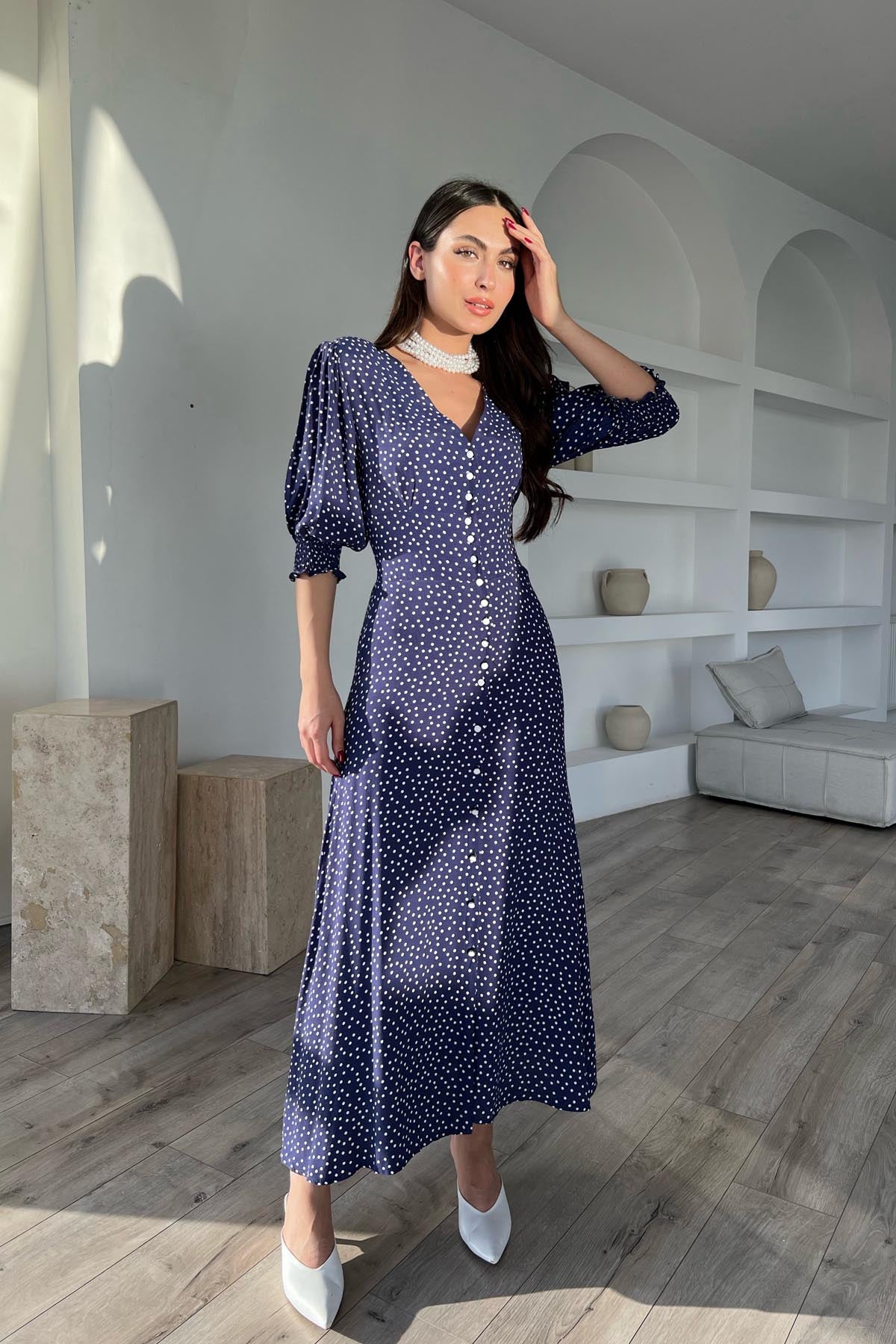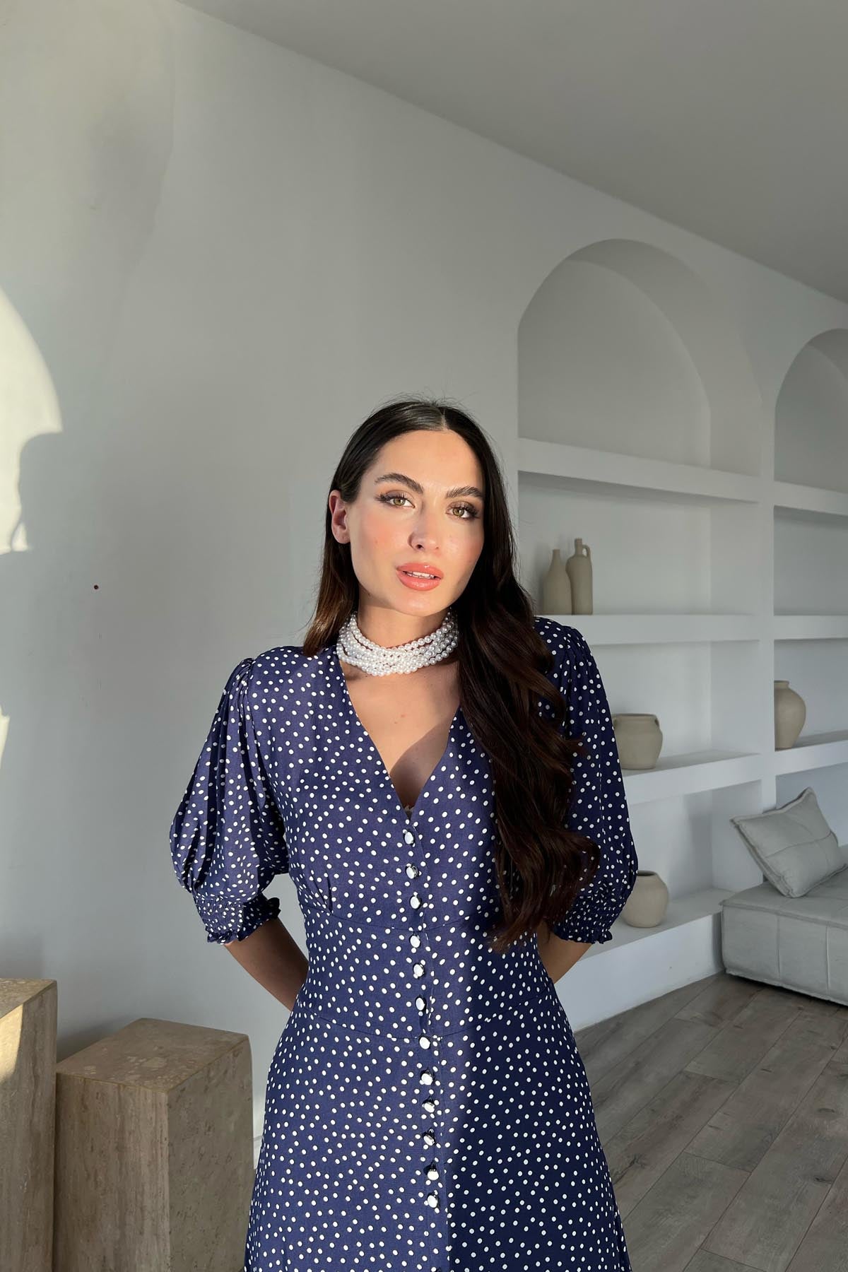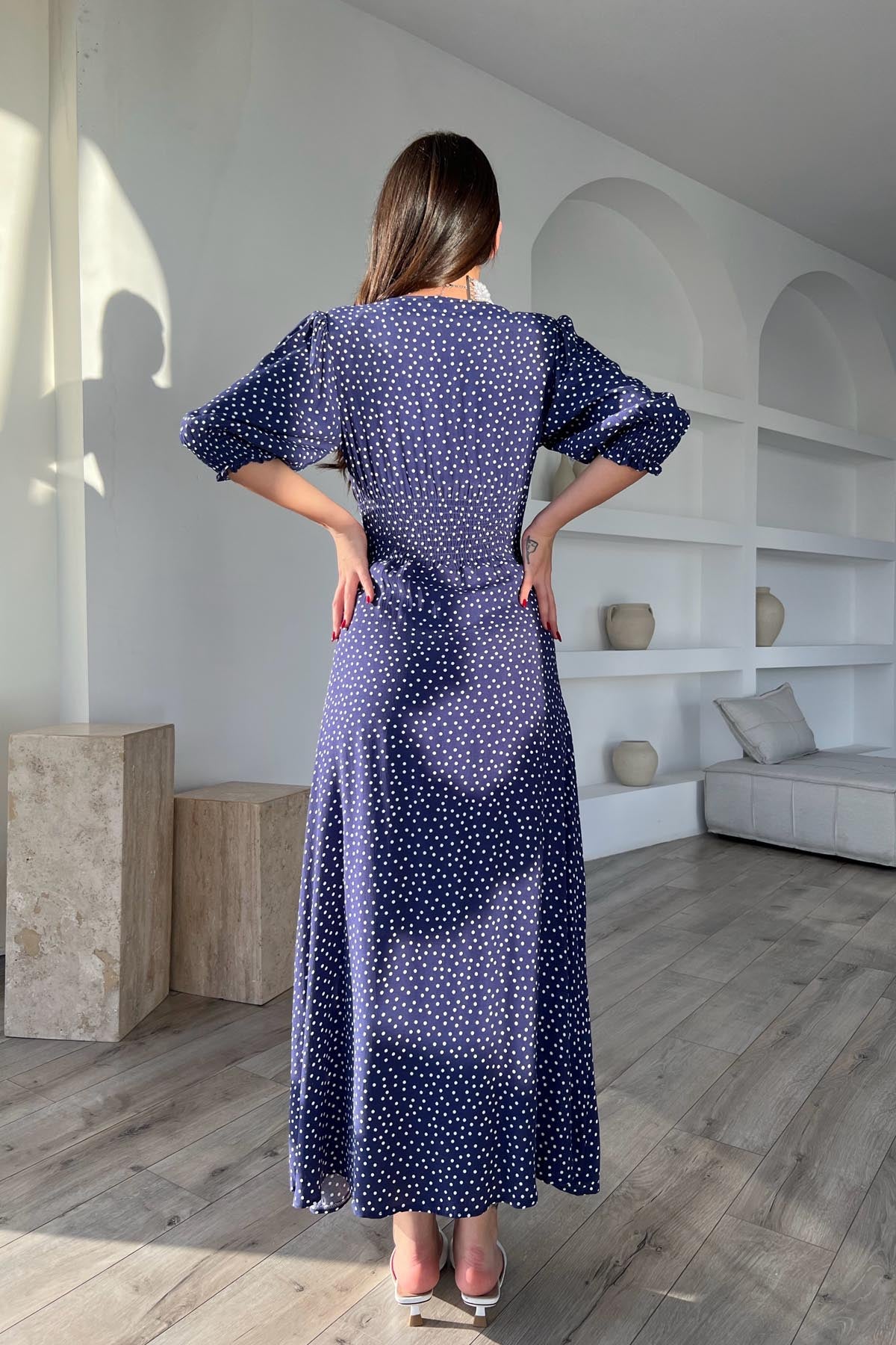 Lacivert Puantiyeli Arka Bel ve Kol Ucu Gipeli Elbise SY-1727-Lacivert