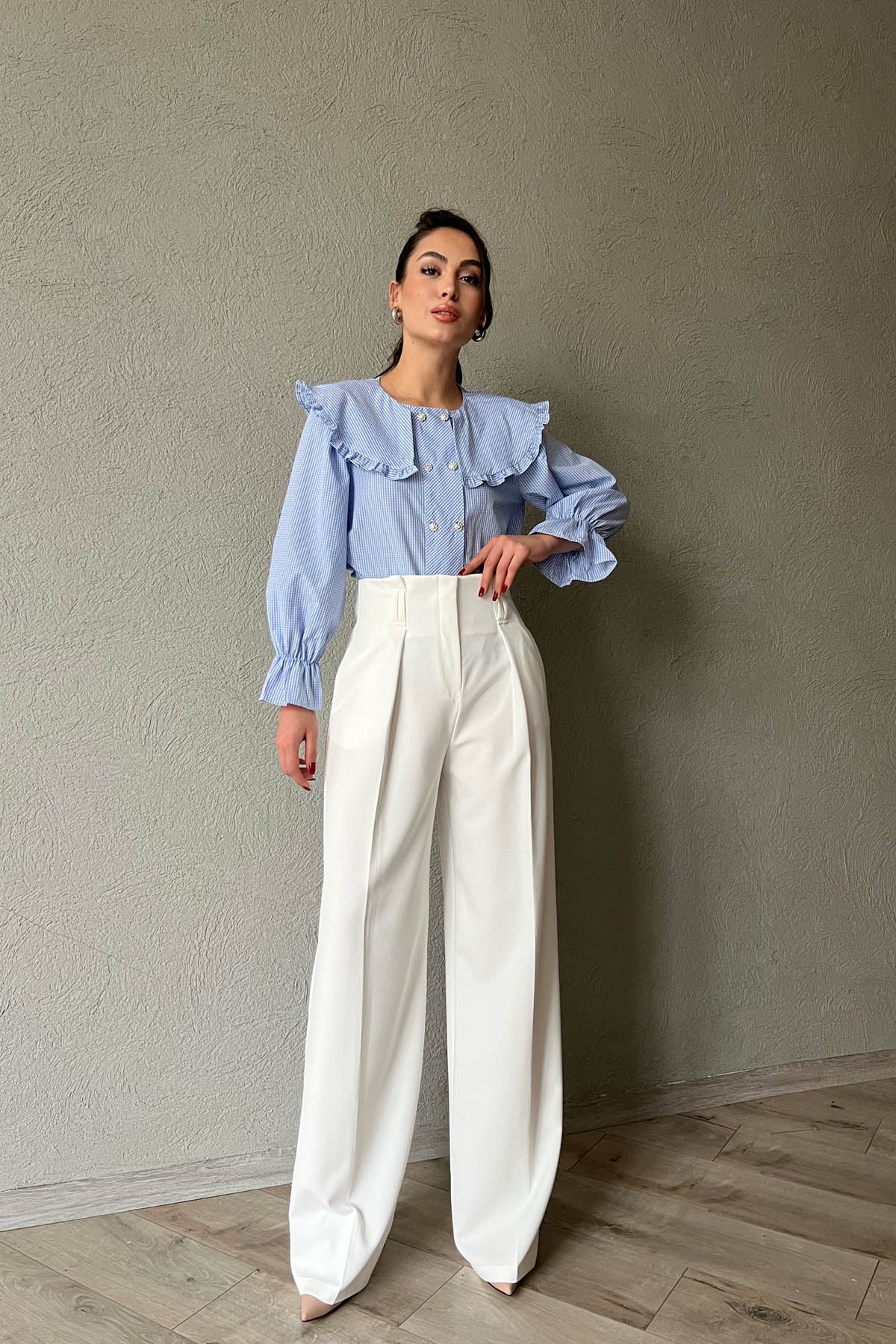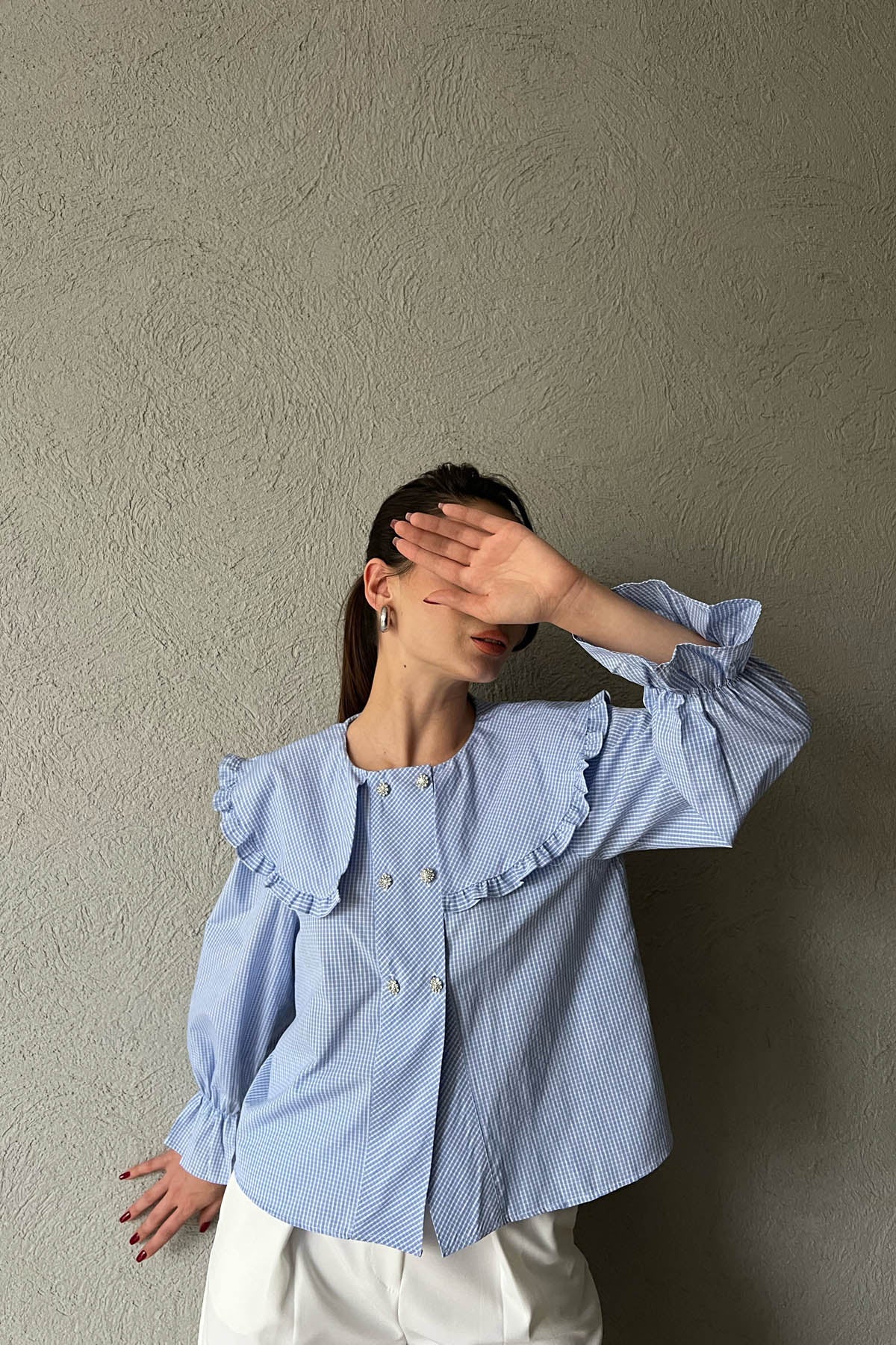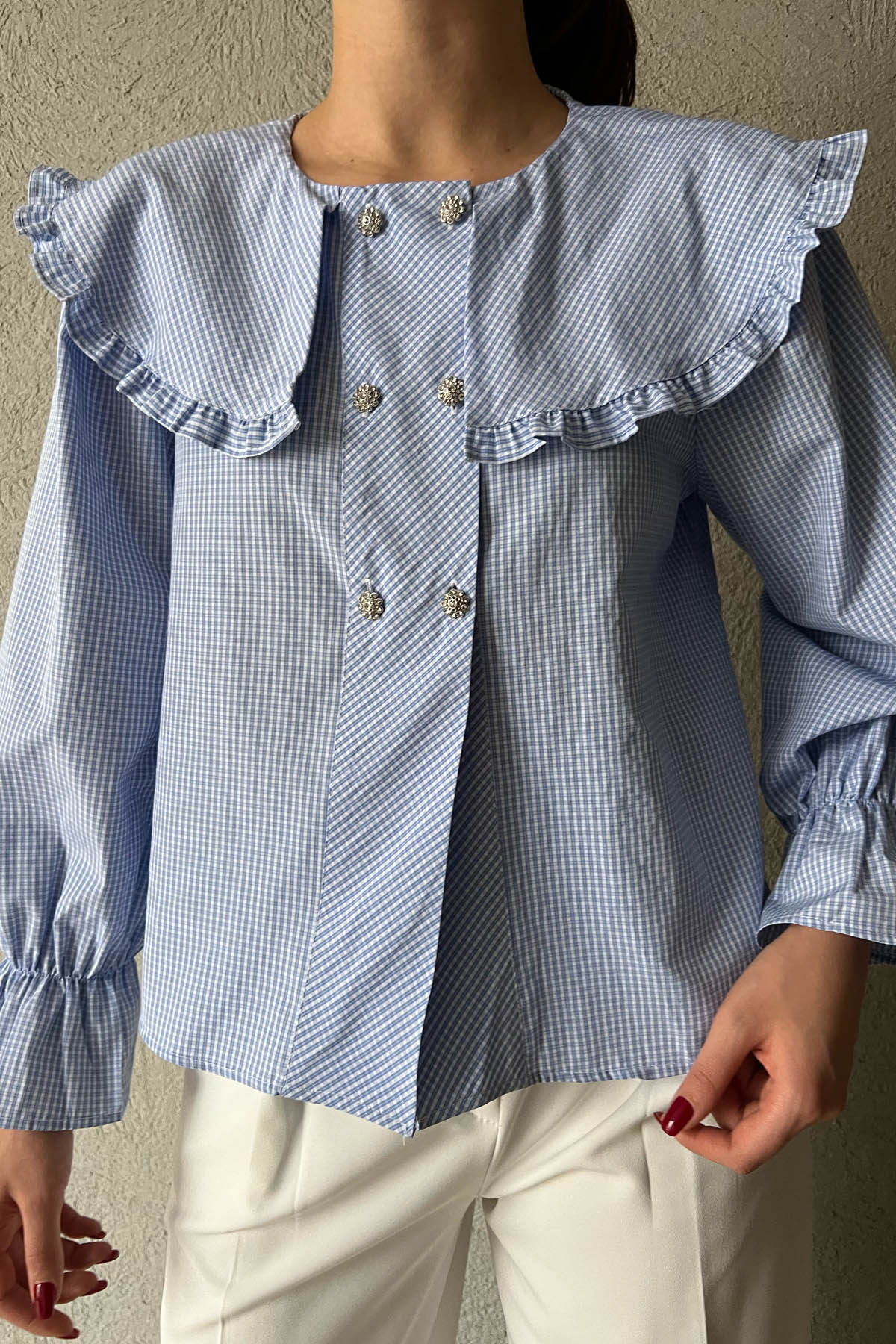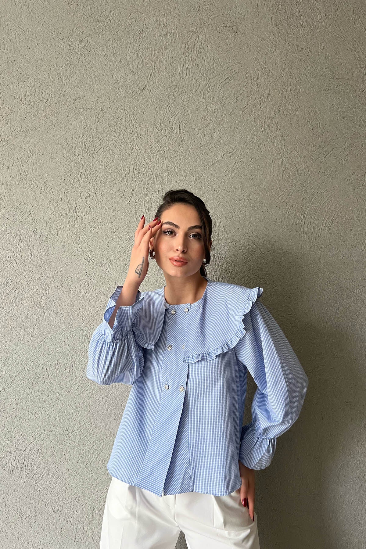 Ürün Detayları ;Mavi Taş Düğme ve Yaka Detaylı ZR Bluz