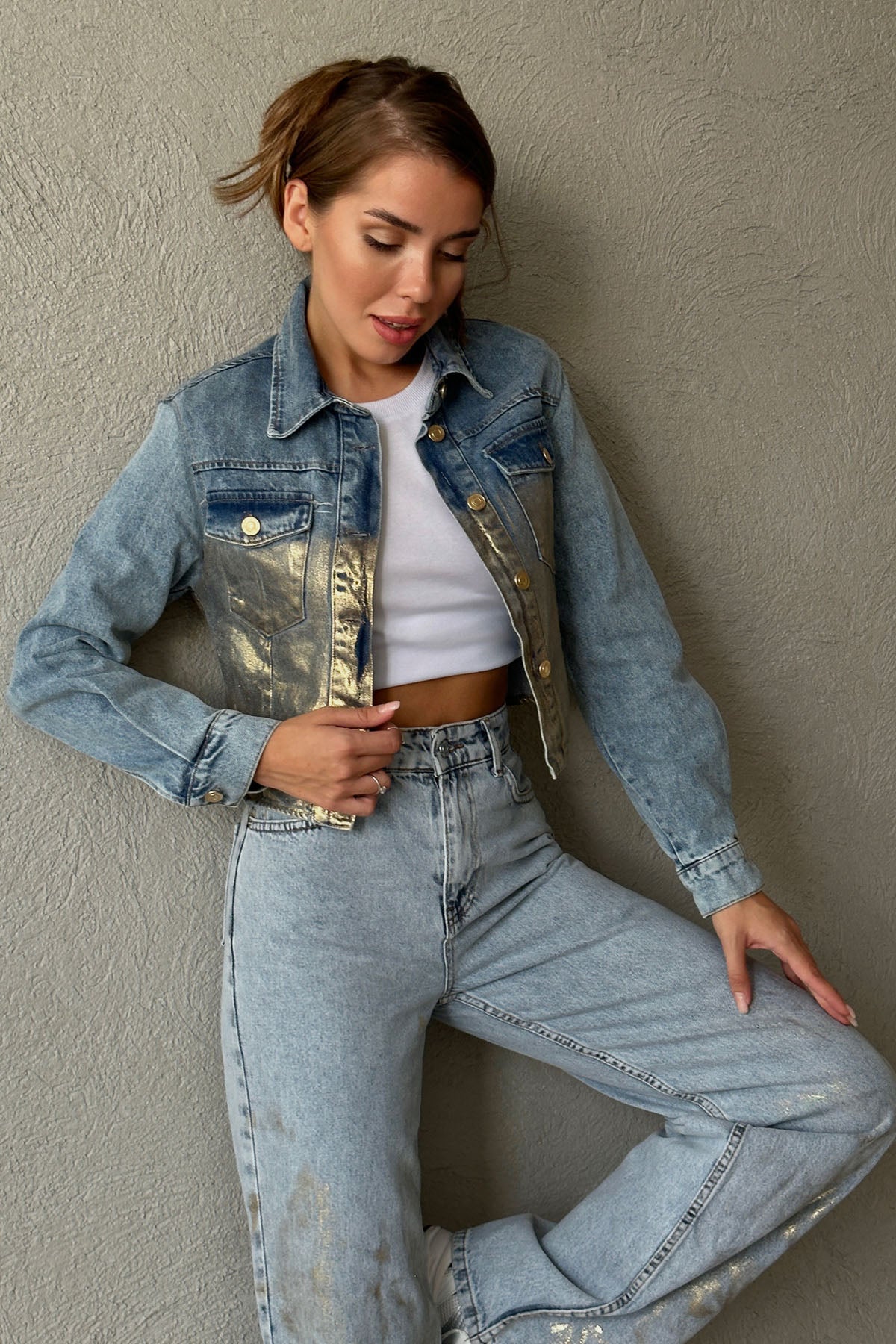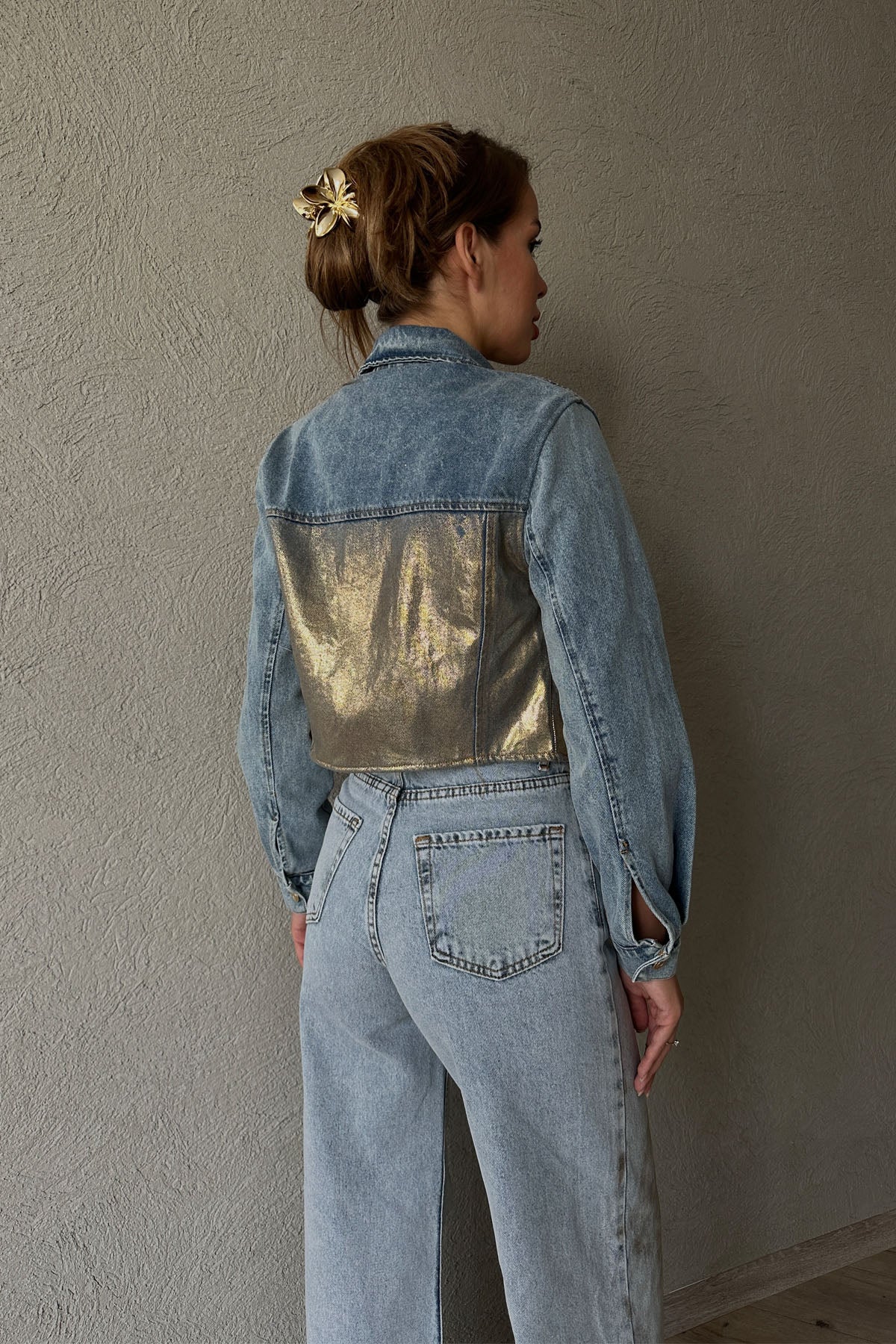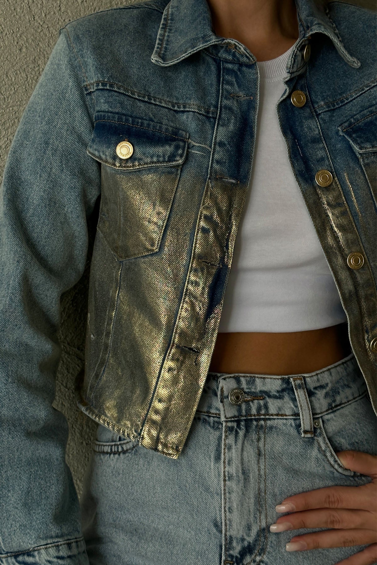 Ürün Detayları : Parlak kumaş detaylı , gold düğmeli kot ceket