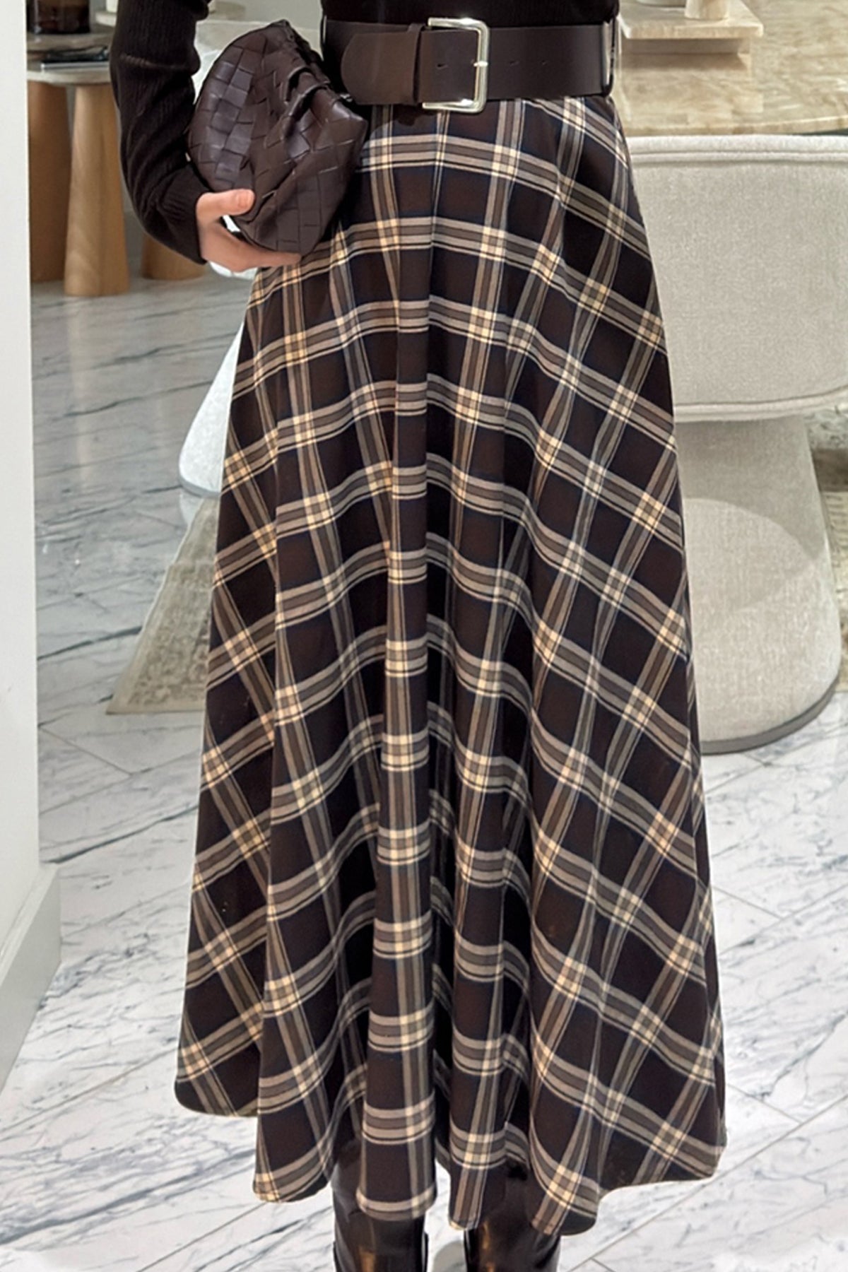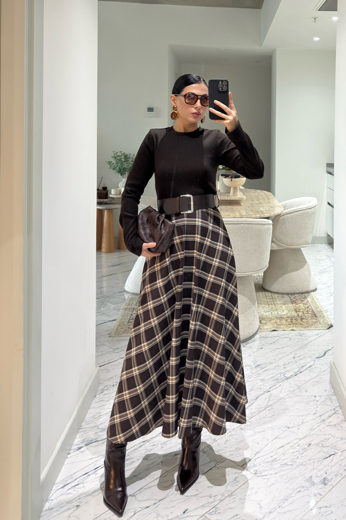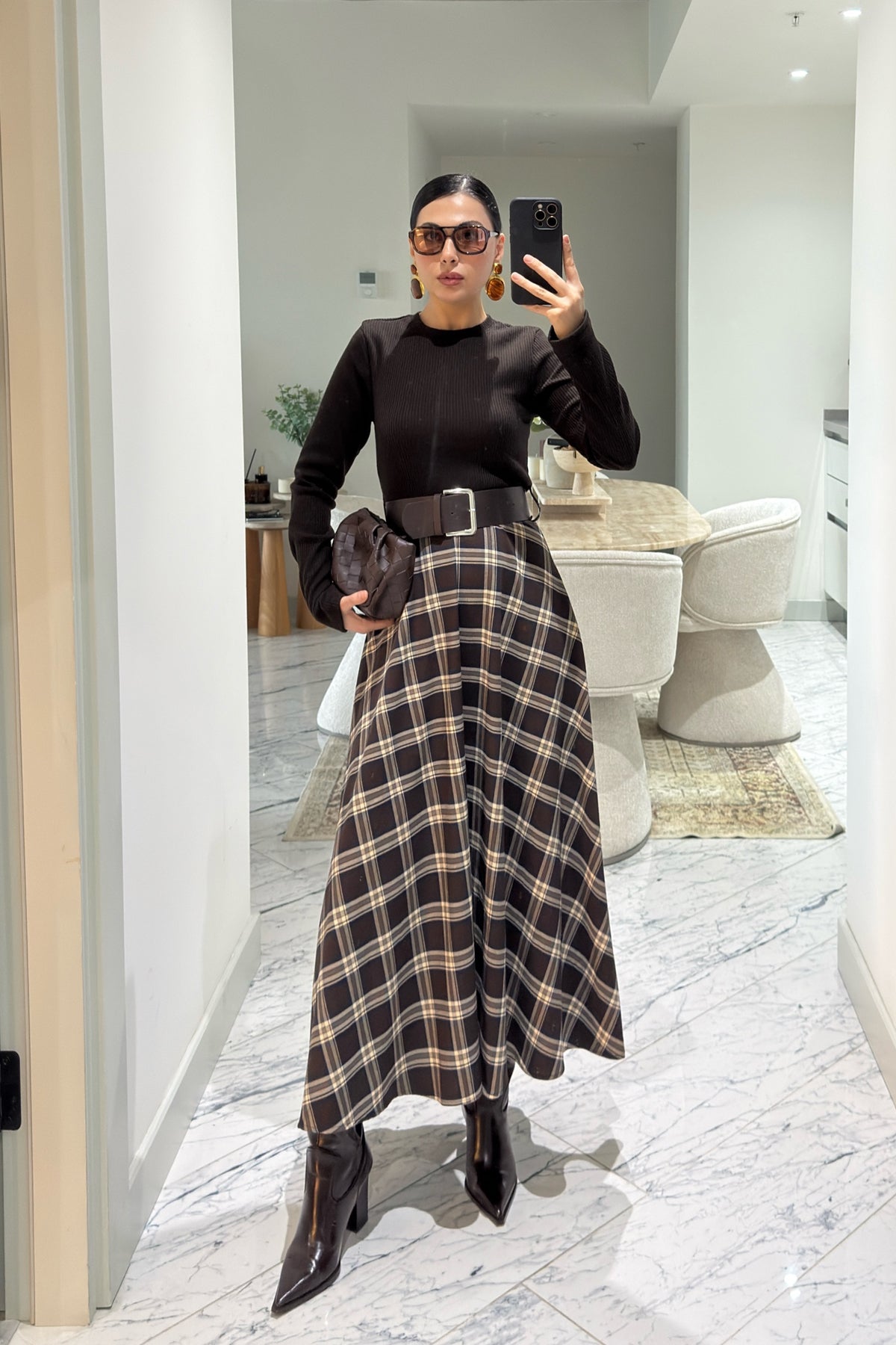 Örme Ekose Detaylı Kemerli Elbise SY-3615-Kahverengi