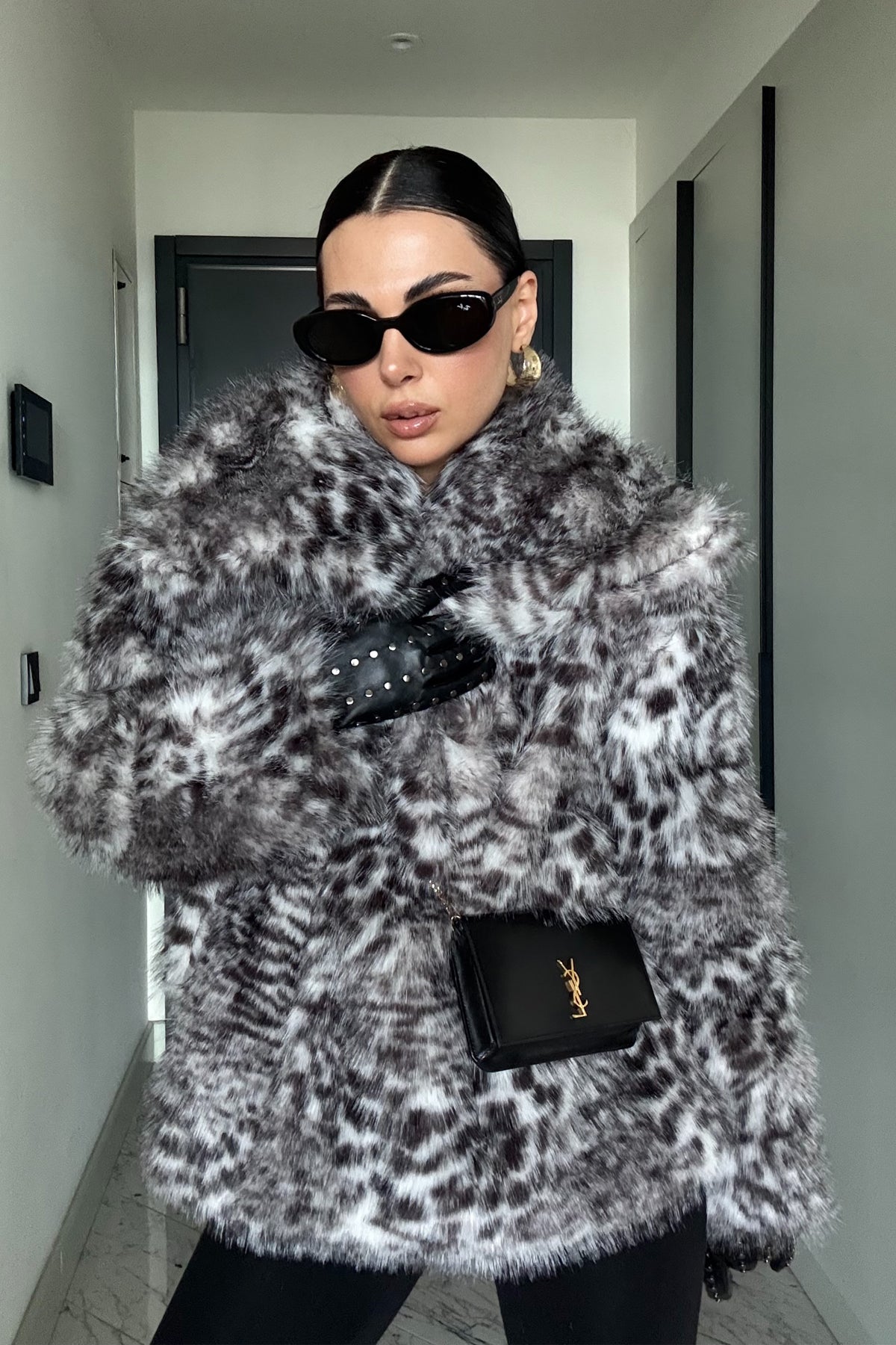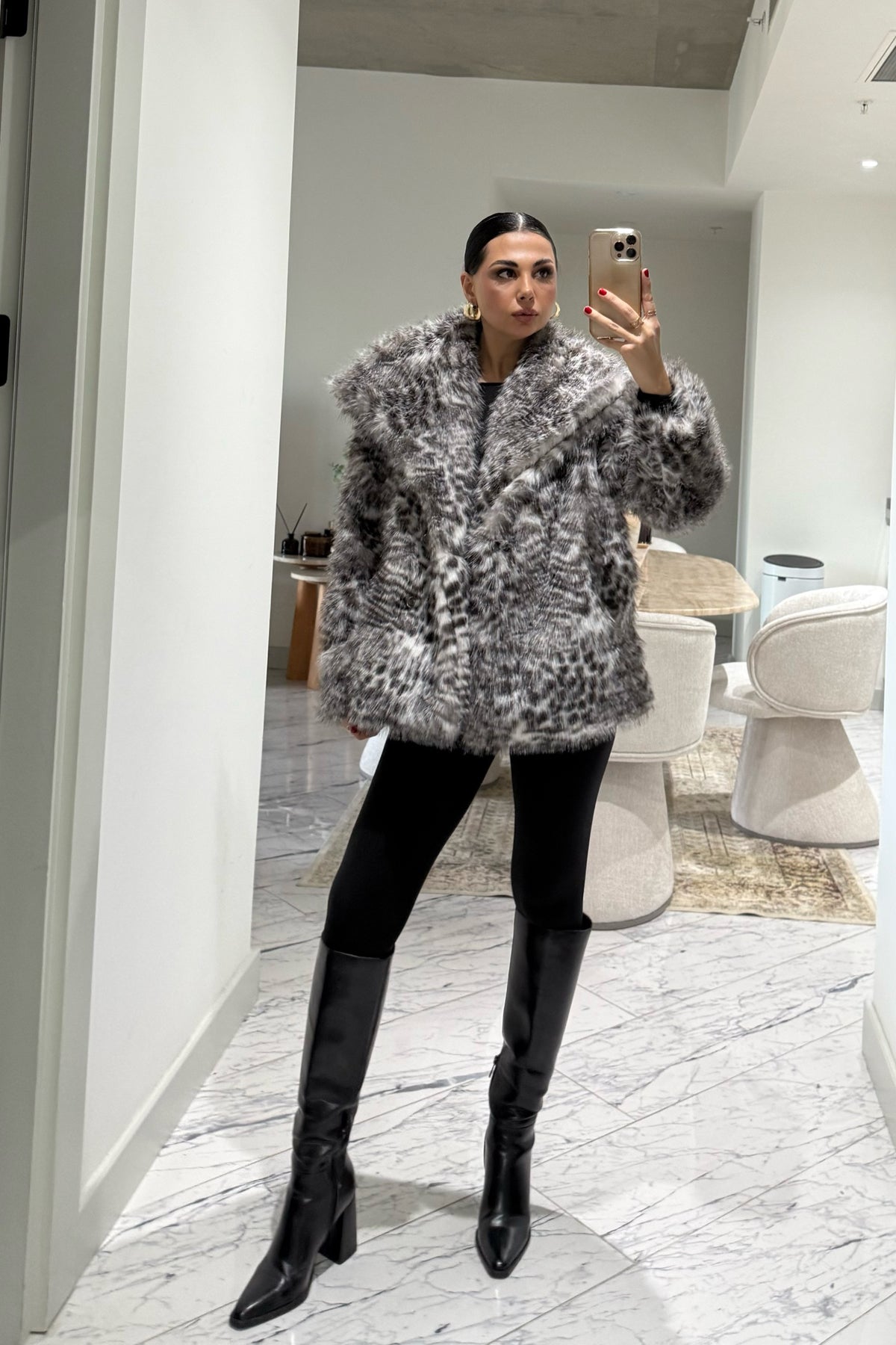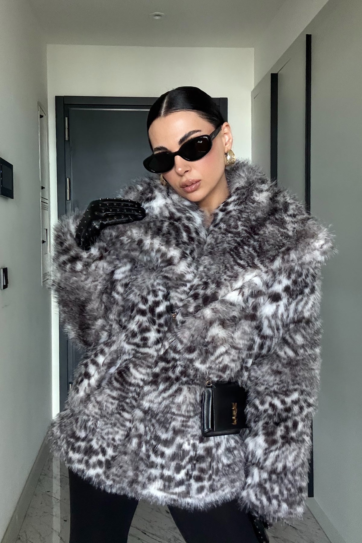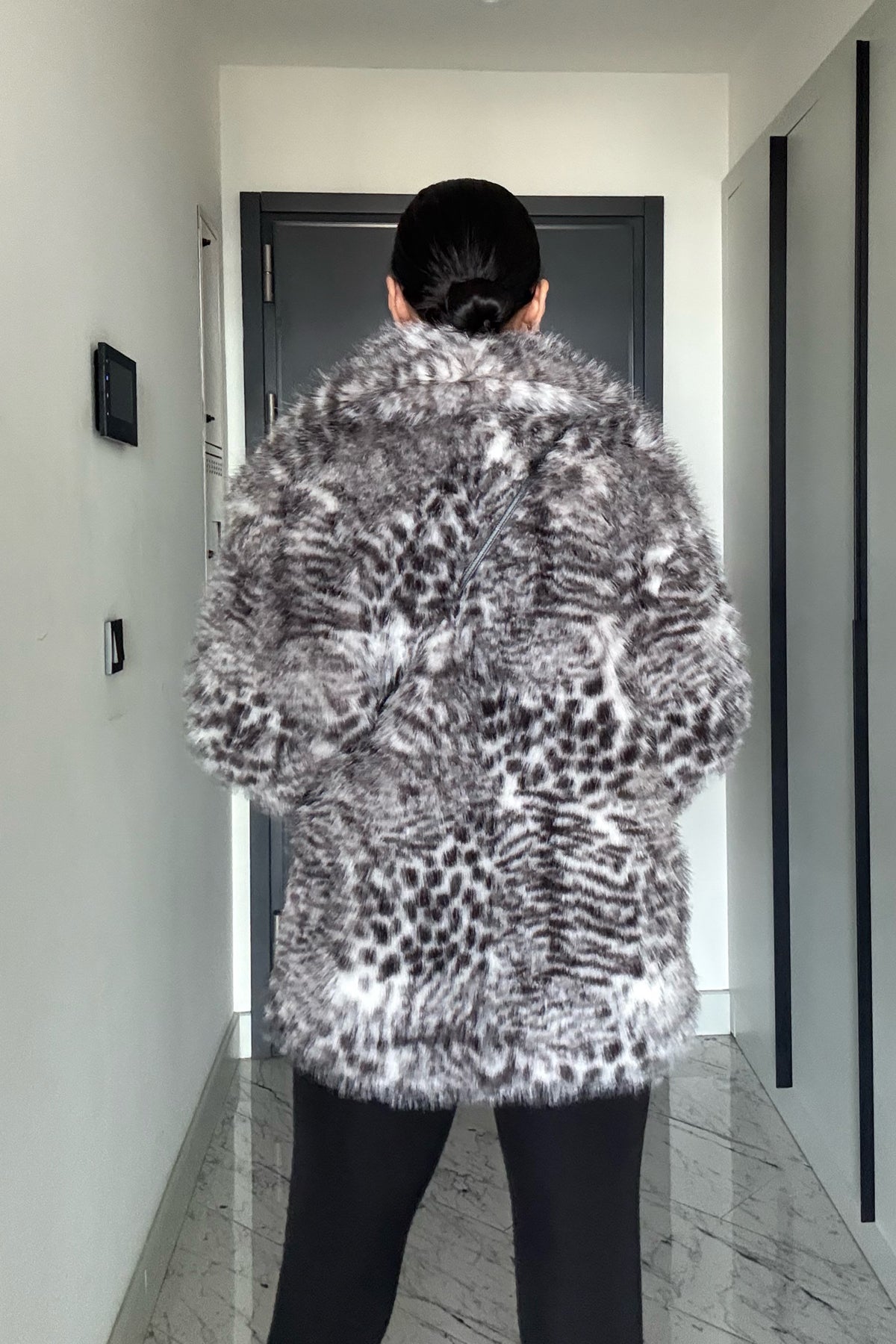 Ürün Detayları:Siyah Beyaz Desenli Suni Kürk-Önden 2 düğmeli-Cepli Kürk