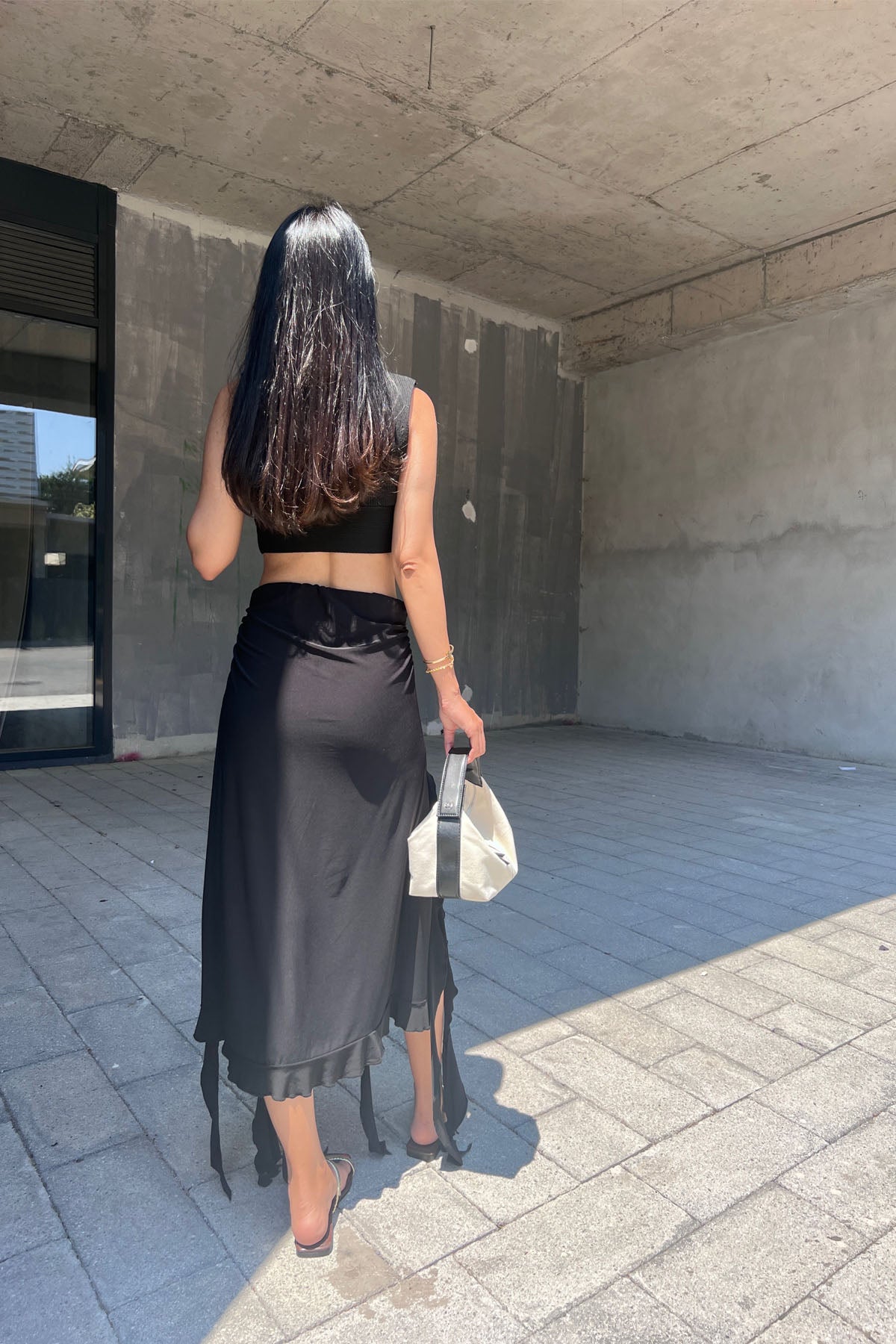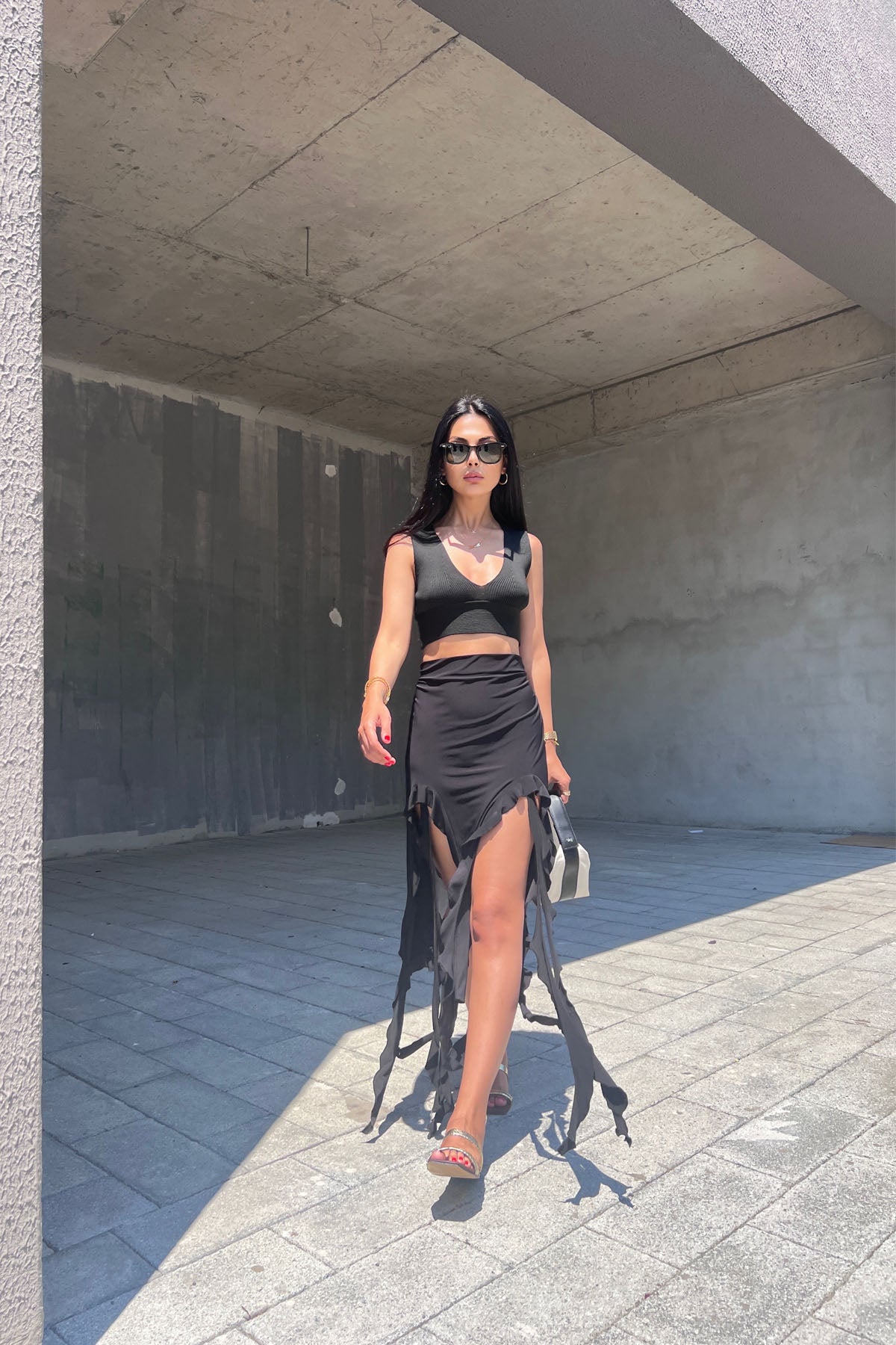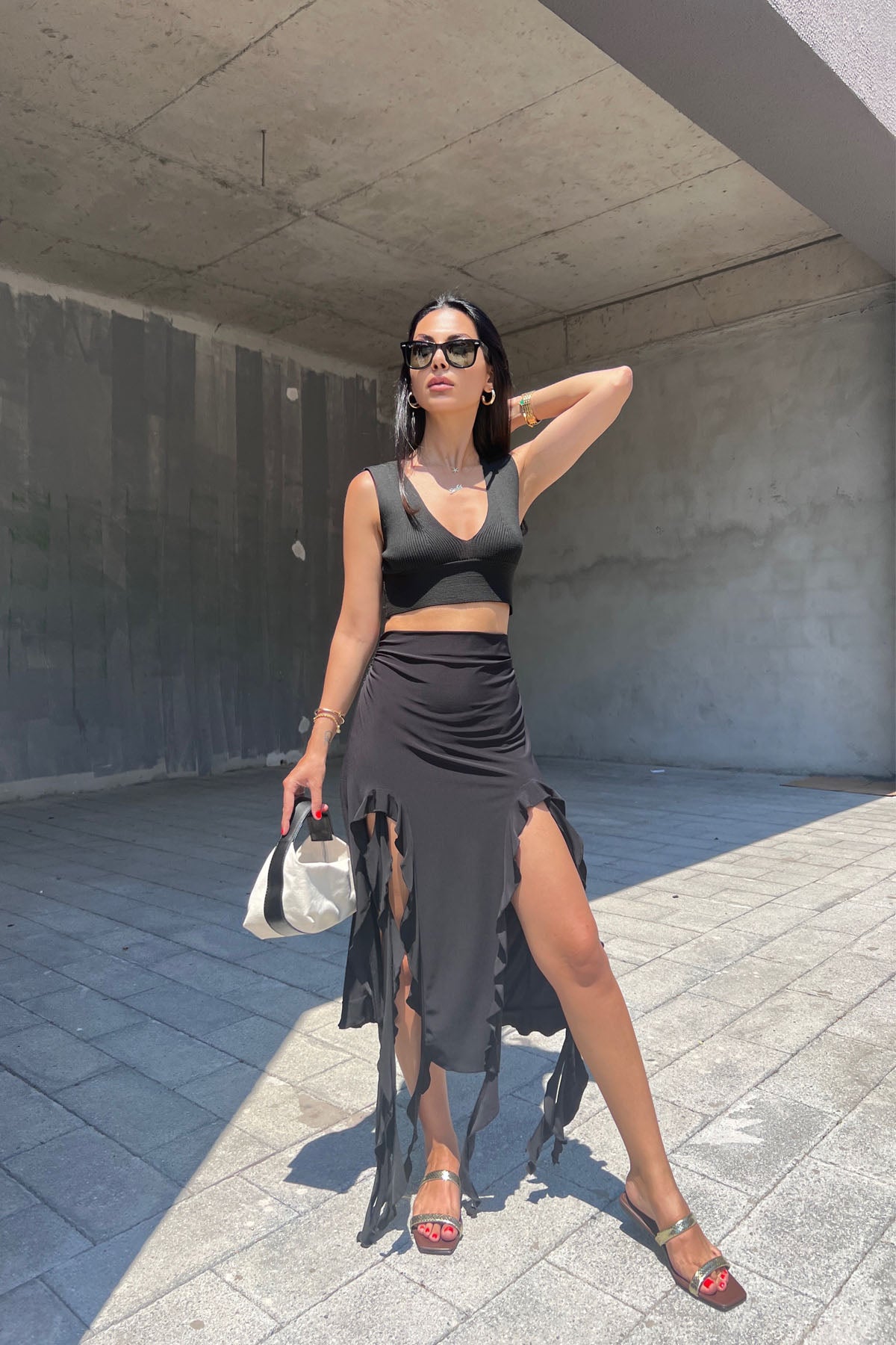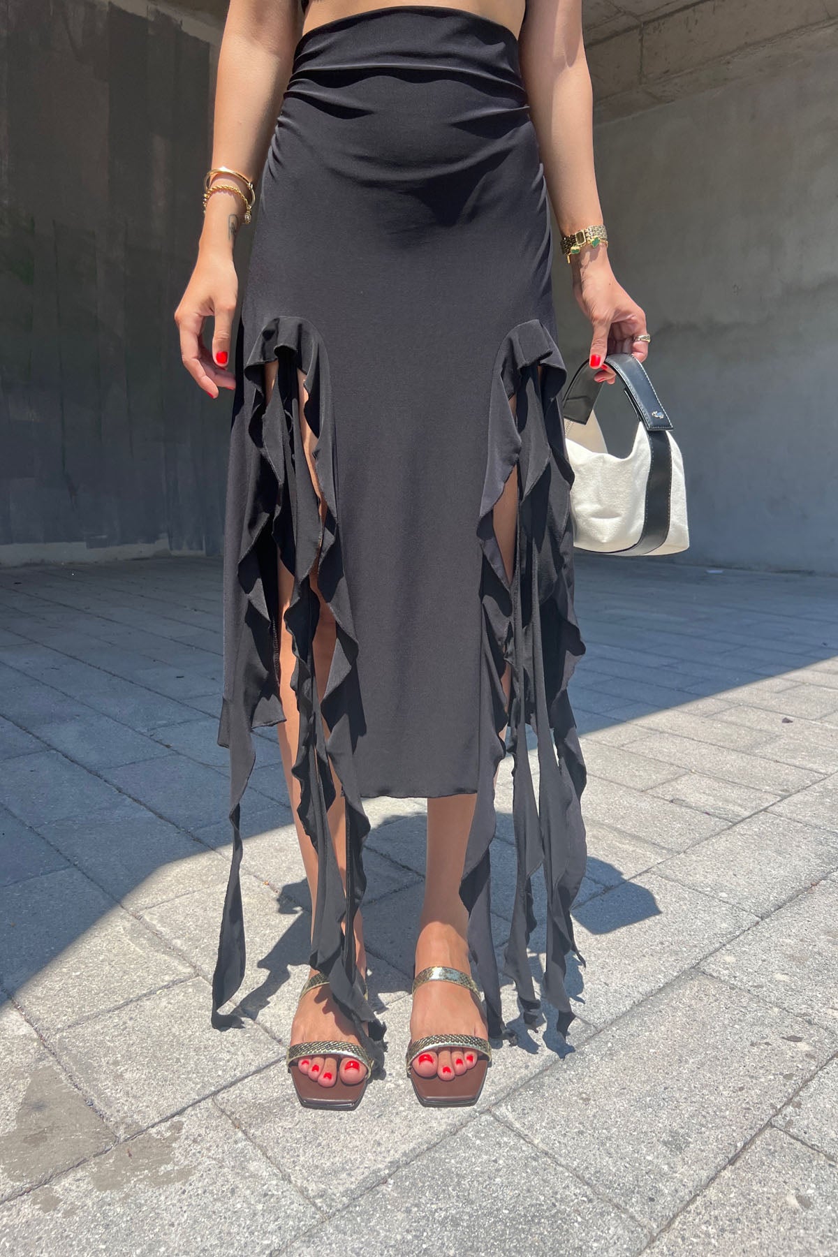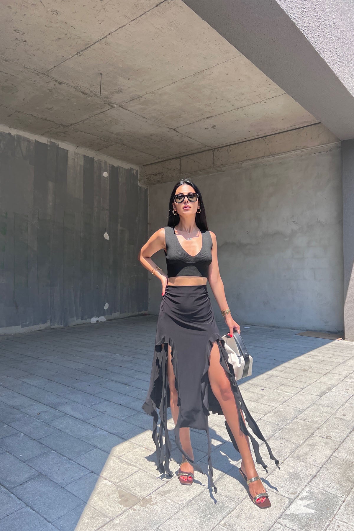 Siyah Derin Yırtmaçlı Fırfır Detay Etek SY-0702-Siyah