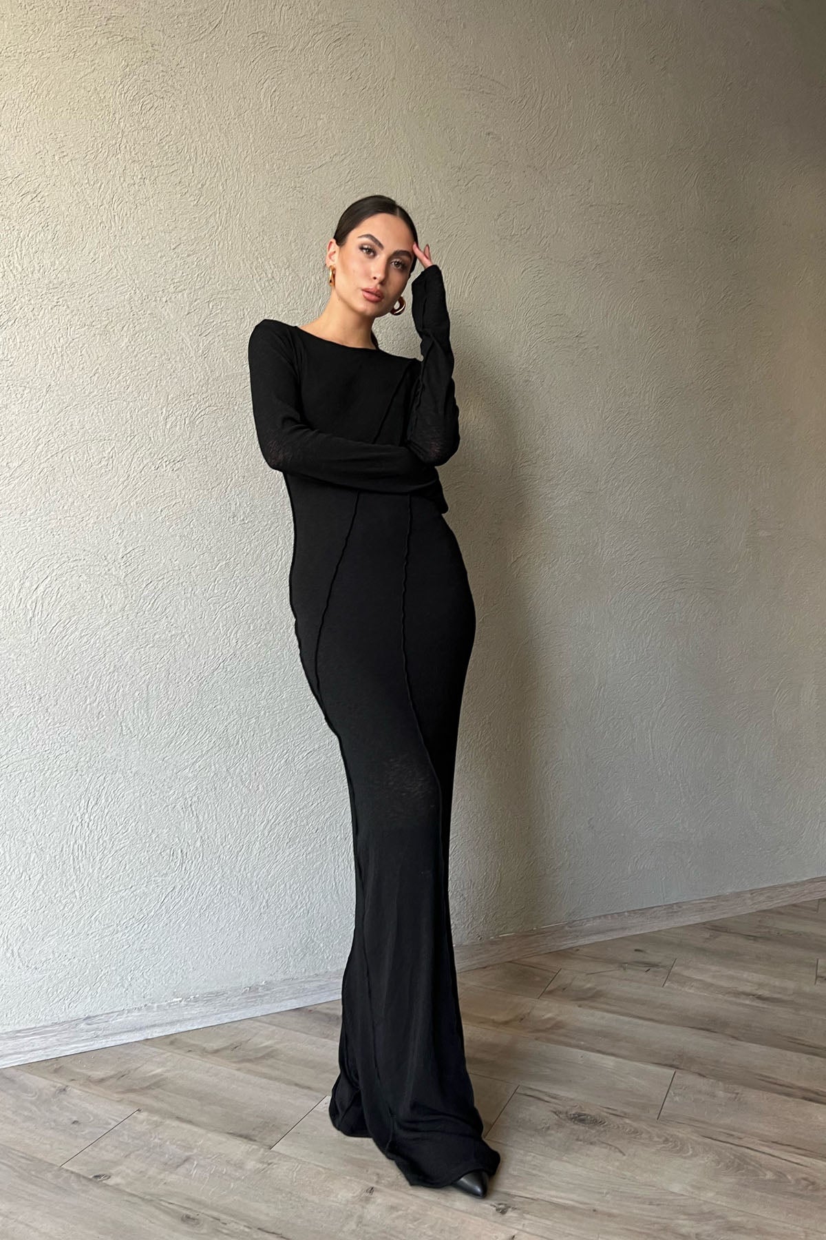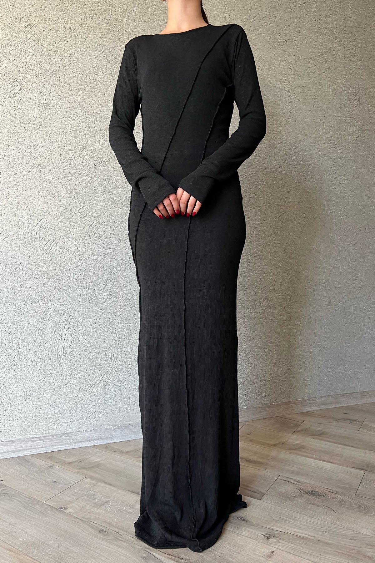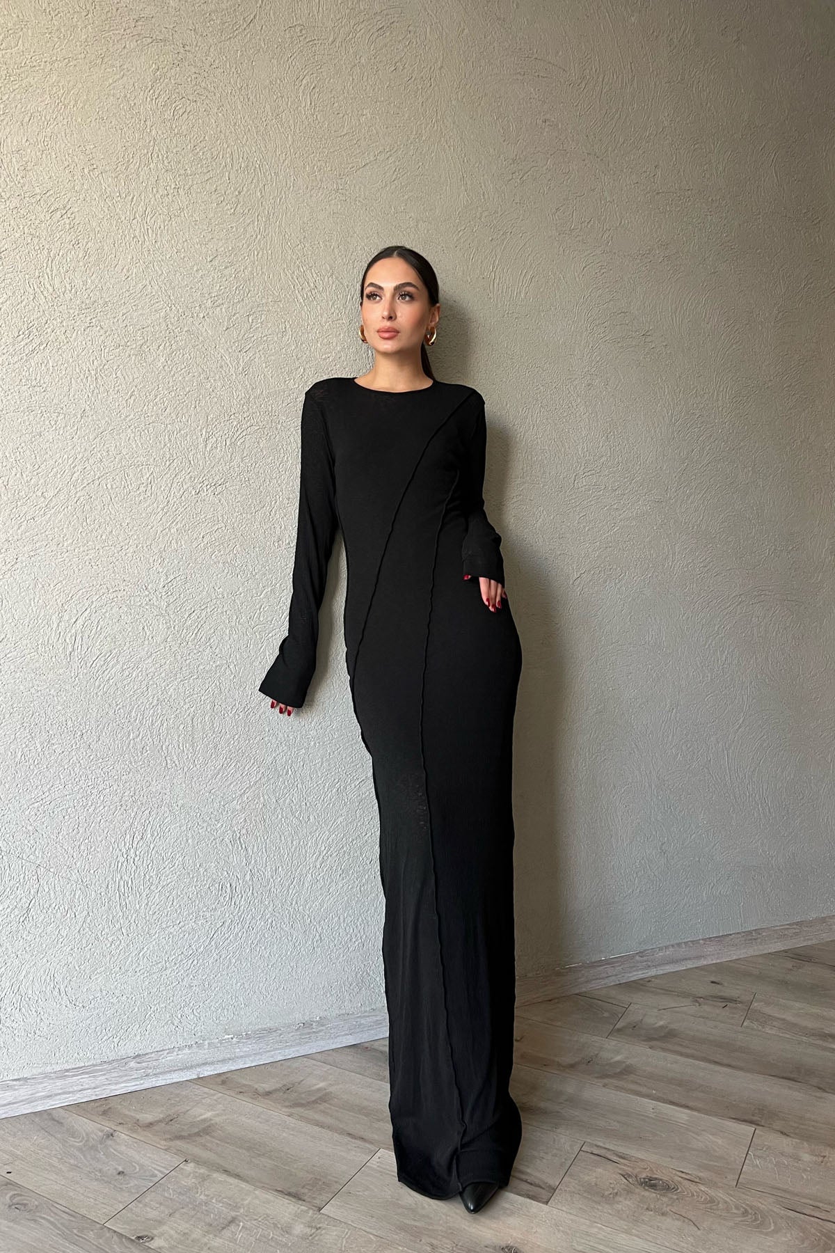 Siyah Dikiş Detaylı Sırt Dekolteli Astarlı Uzun Elbise SY-1658-Siyah