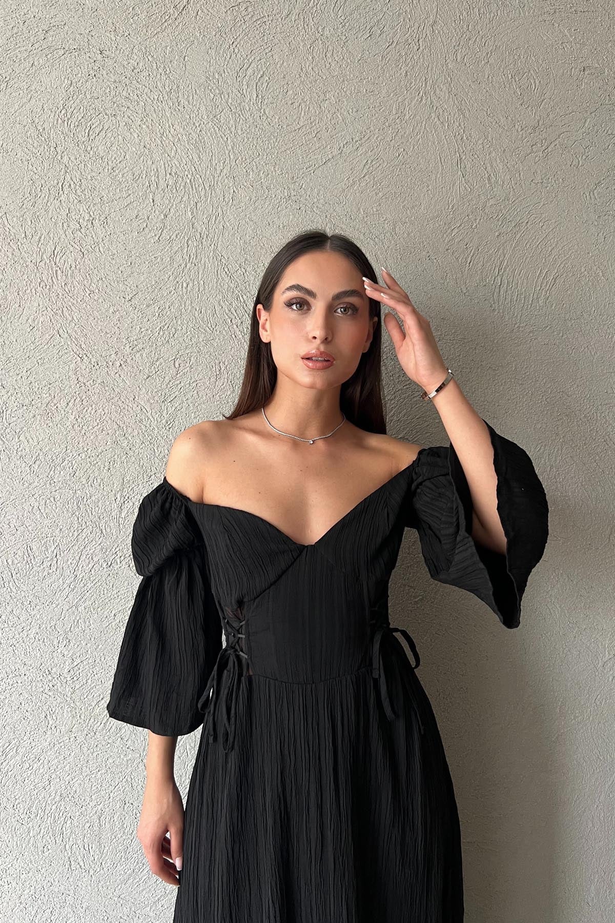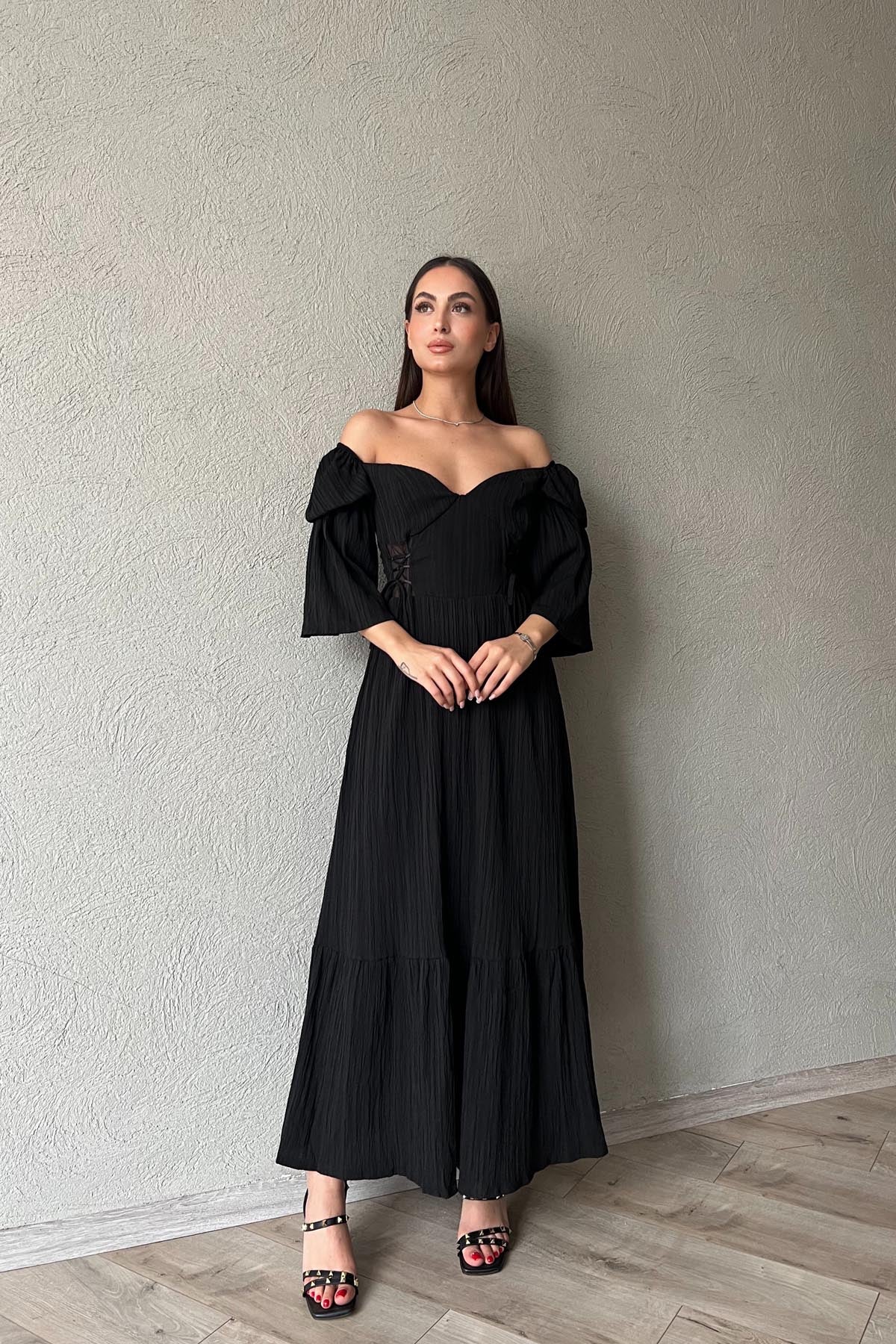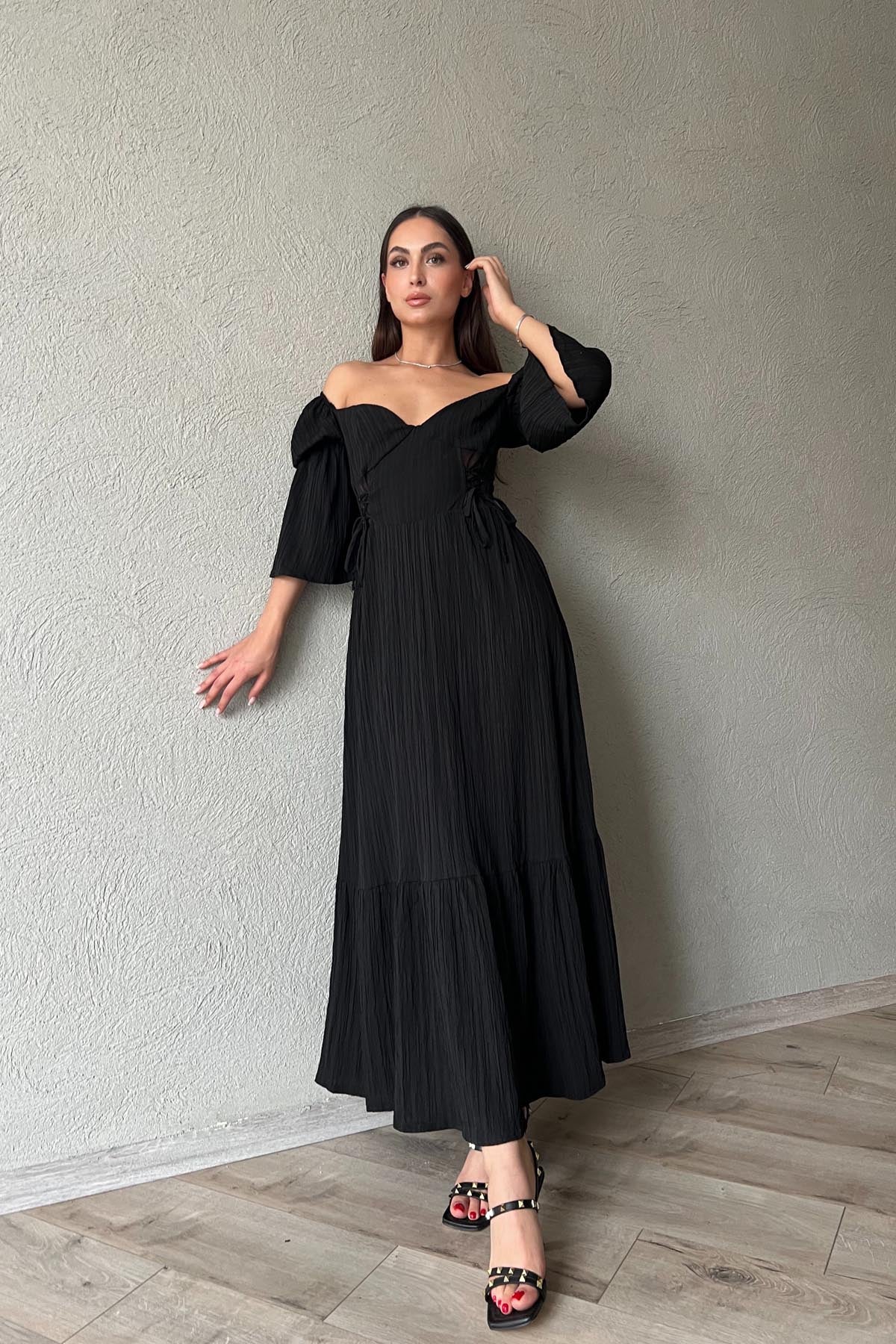 Siyah Düşük Kol Balenli Gofre Kumaş Uzun Elbise SY-1779-Siyah