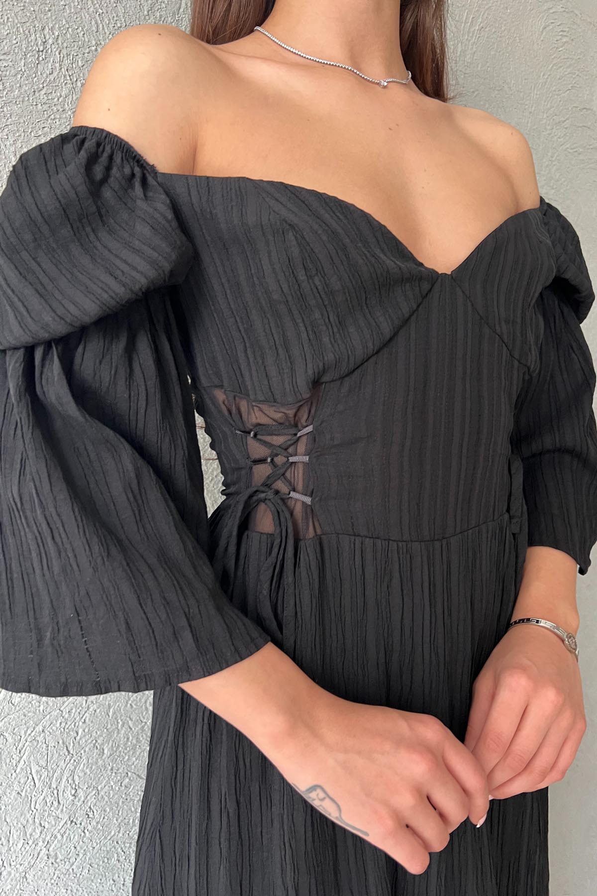 Ürün Detayları :Siyah Düşük Kol Balenli Gofre Kumaş Uzun Elbise