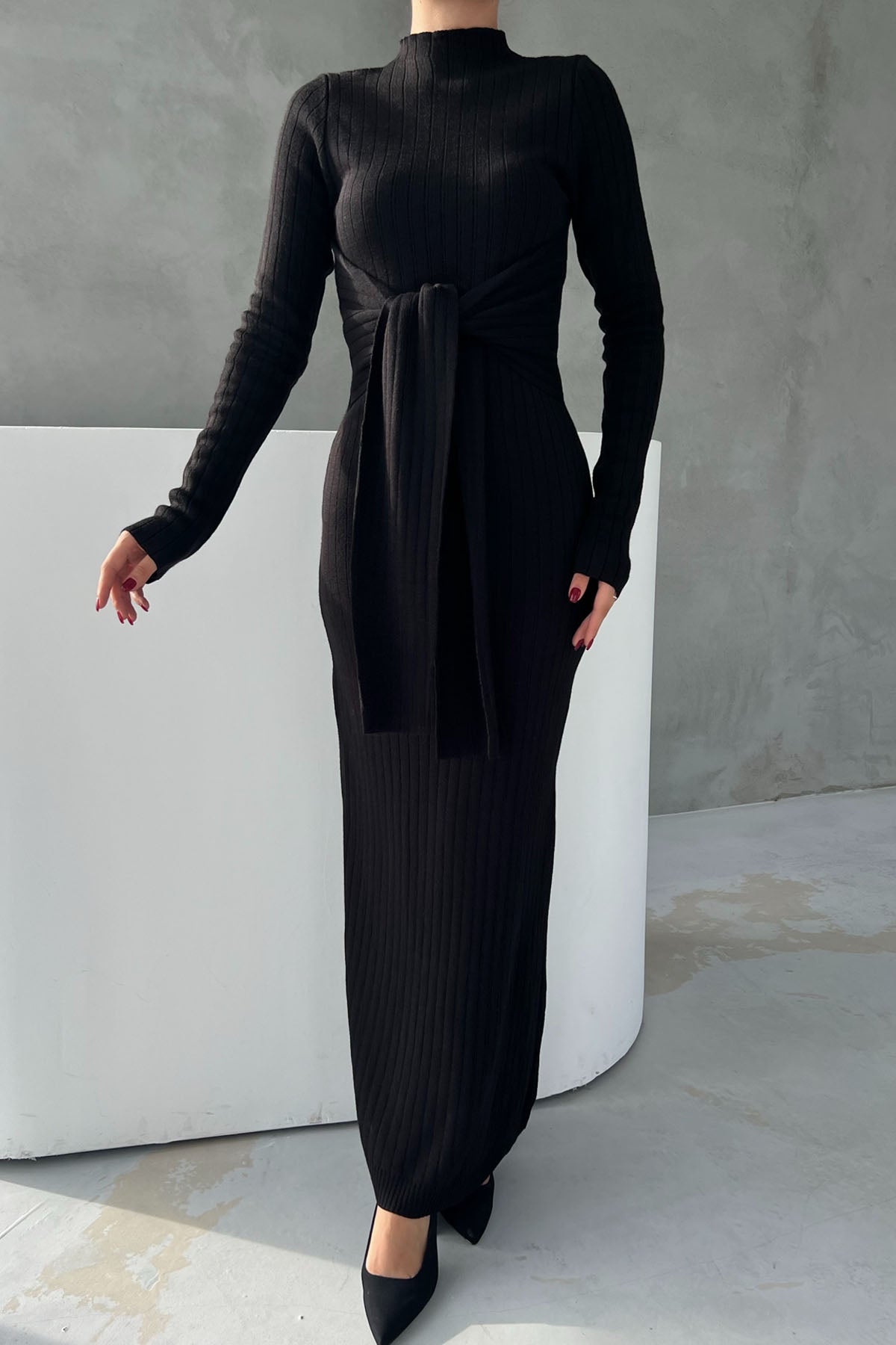 Siyah Fitilli Bağlama Detaylı Triko Elbise SY-2526-Siyah