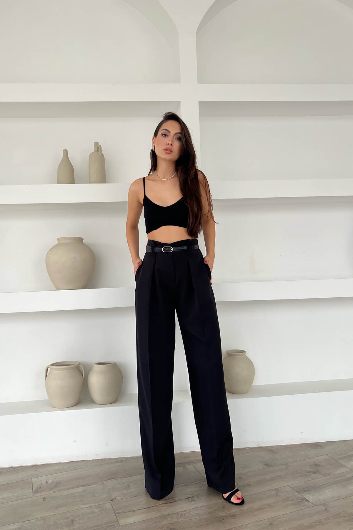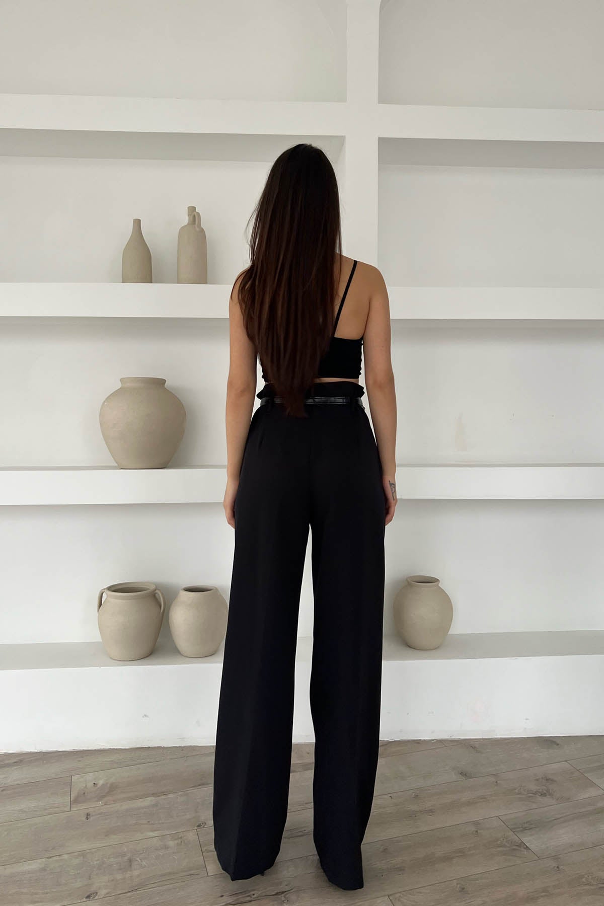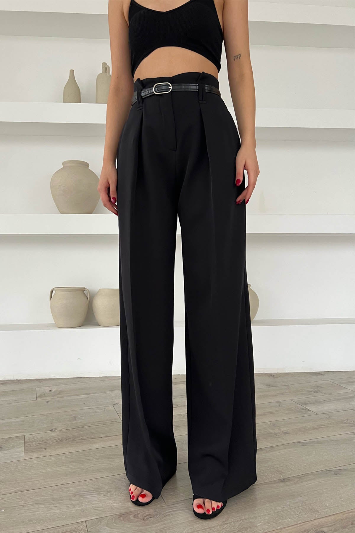 Ürün Detayları ; Siyah Kemer Detaylı Yüksek Bel Geniş Paça Pantolon
