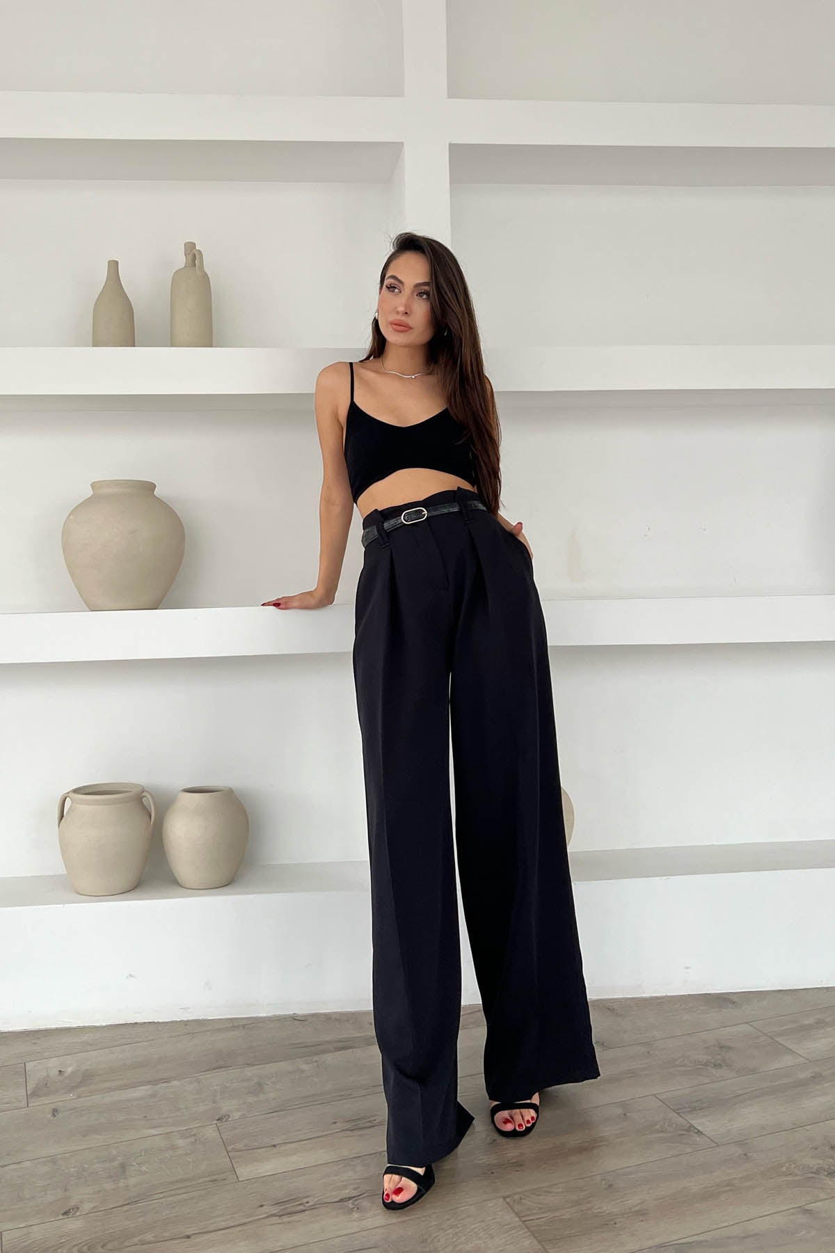 Siyah Kemer Detaylı Yüksek Bel Geniş Paça Pantolon SY-1681-Siyah
