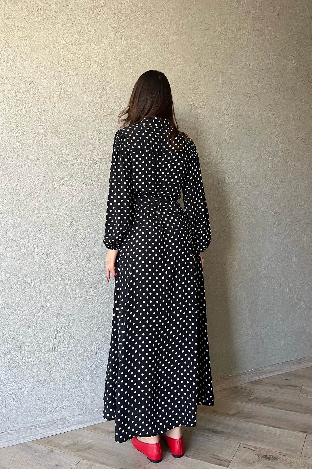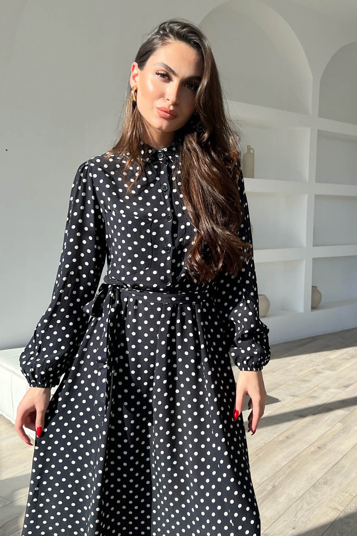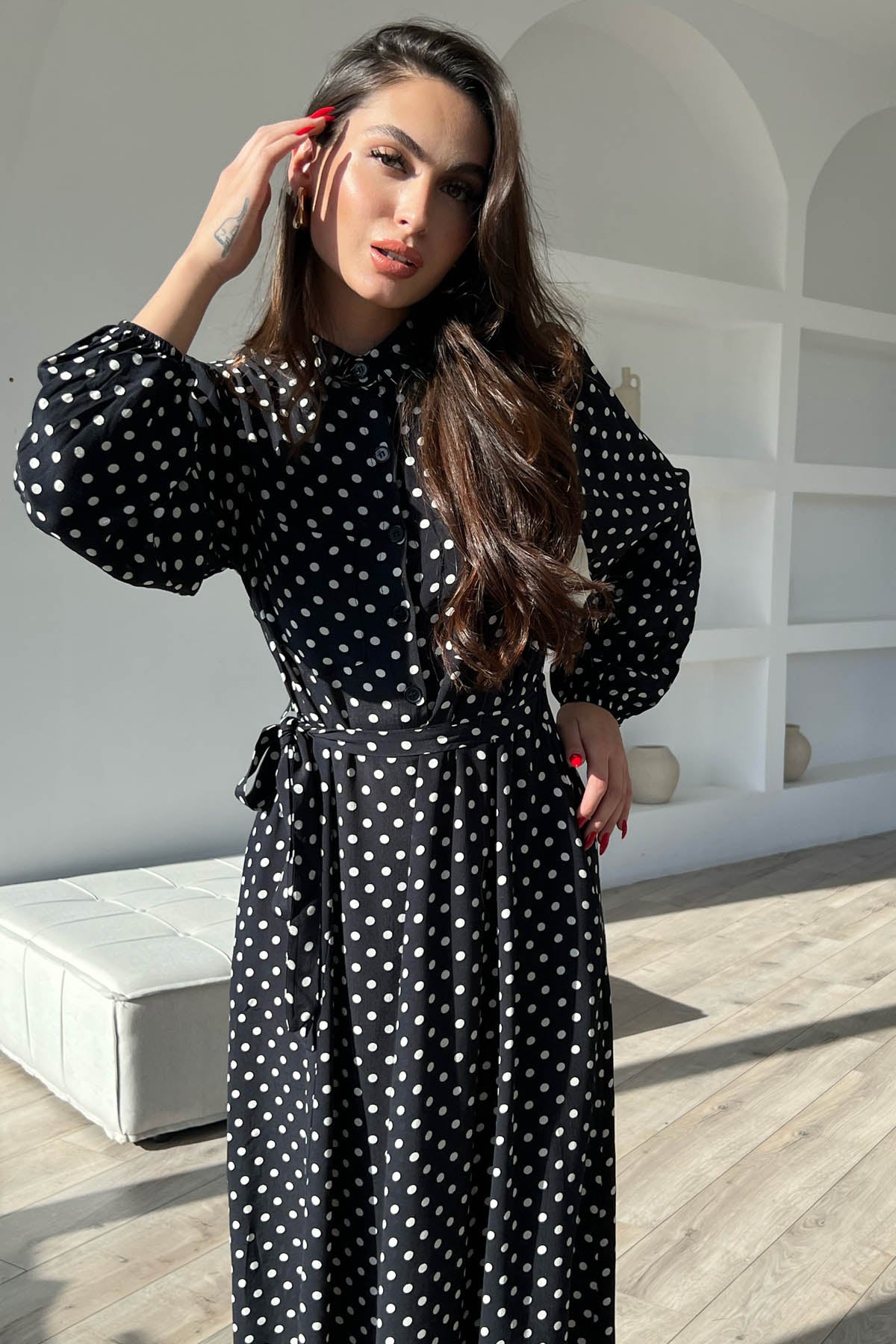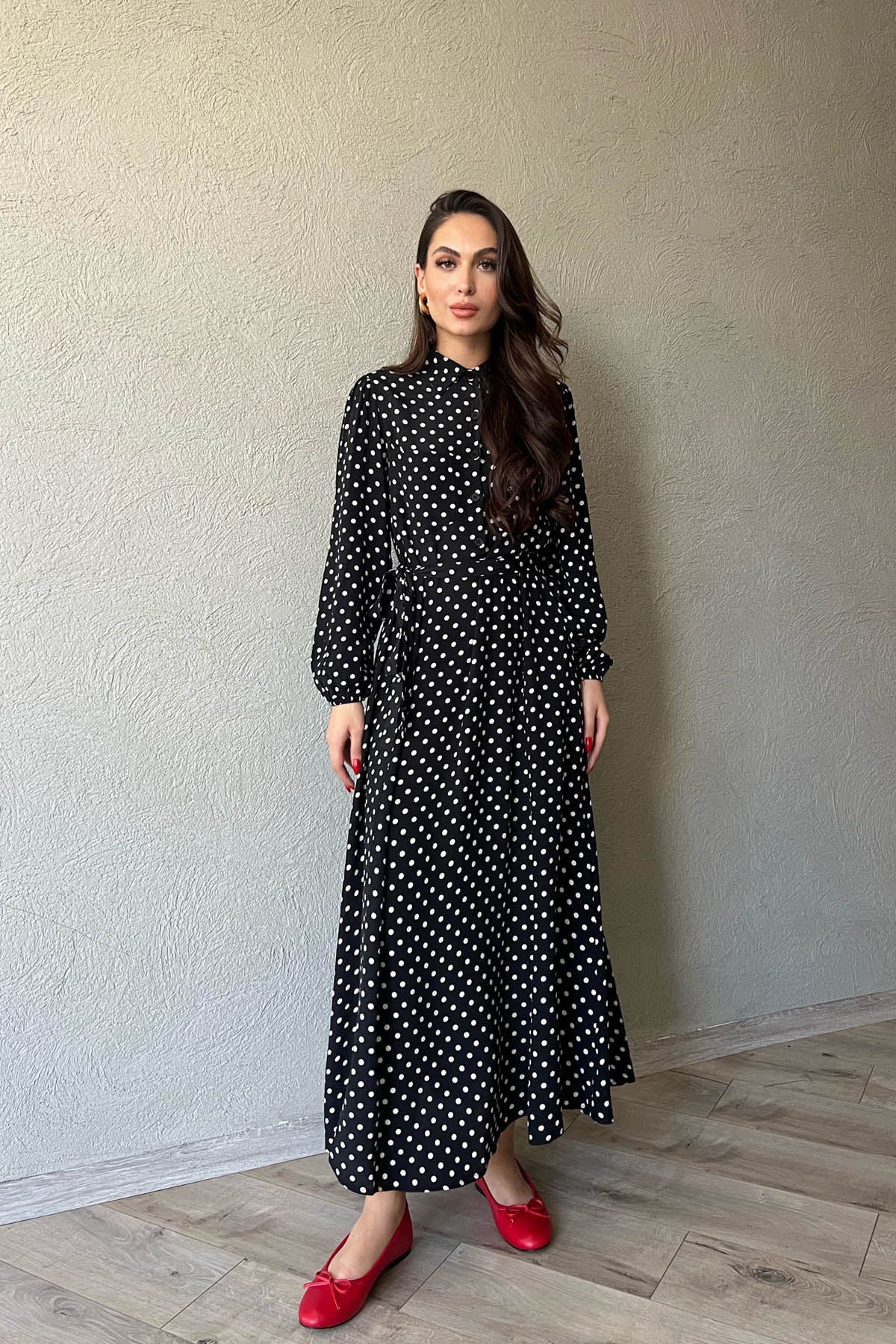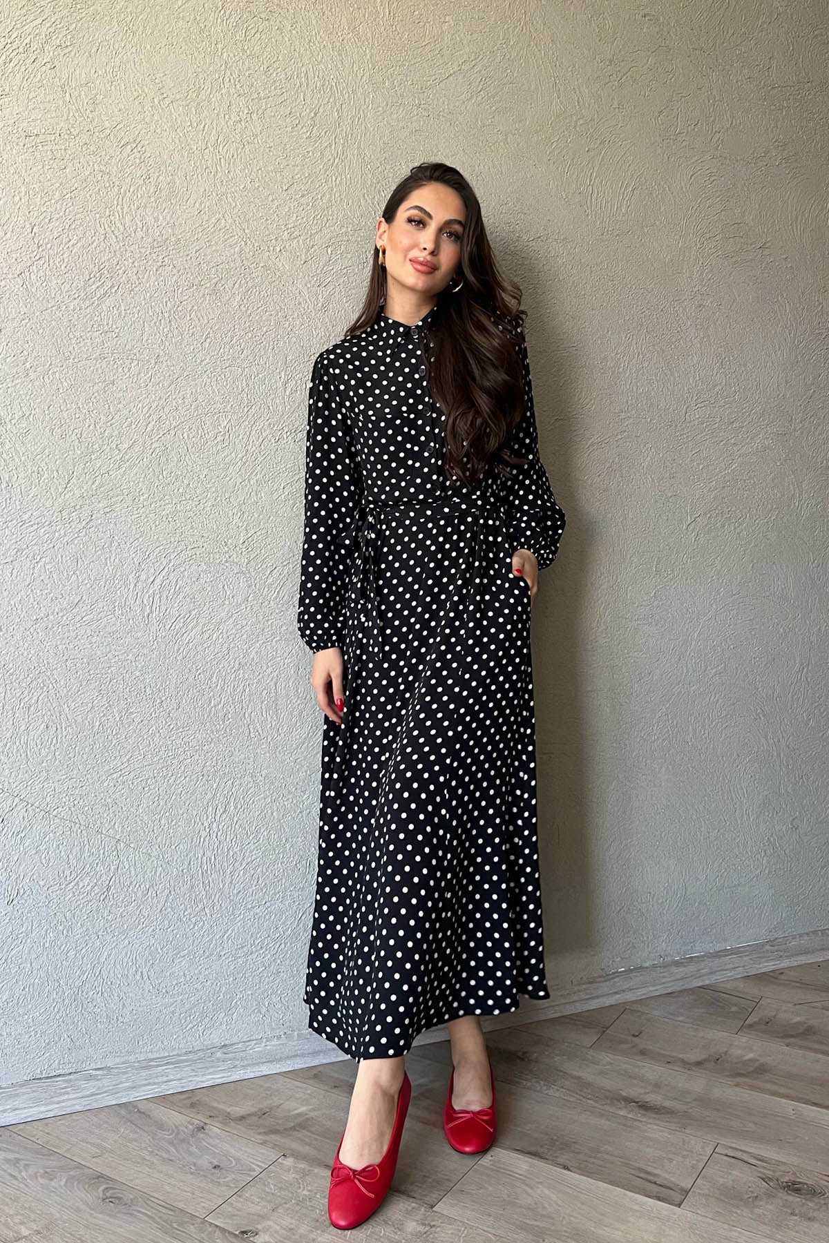 Ürün Detayları ;Siyah Puantiyeli Önü Düğmeli Kemer Detaylı Uzun Elbise