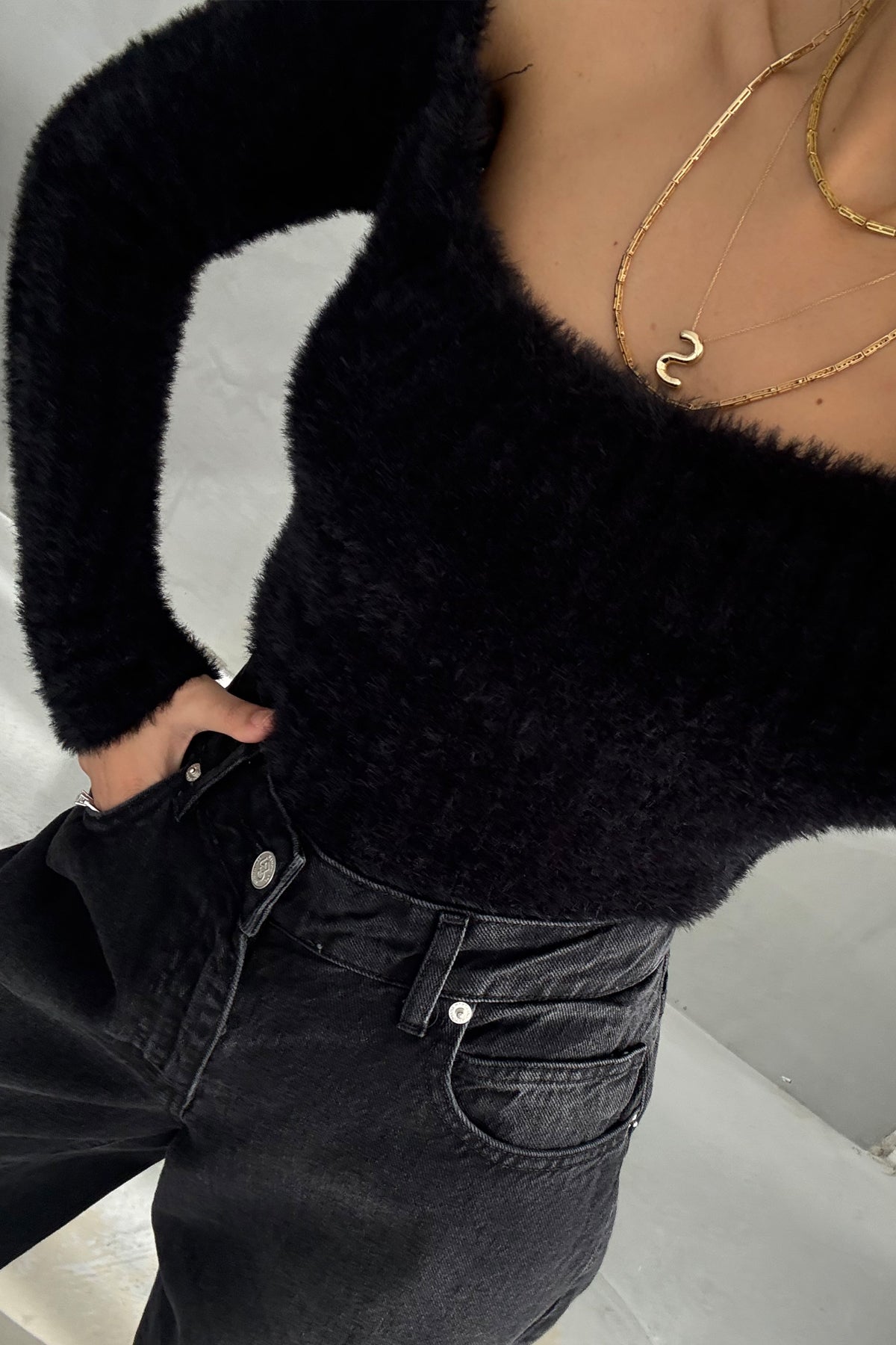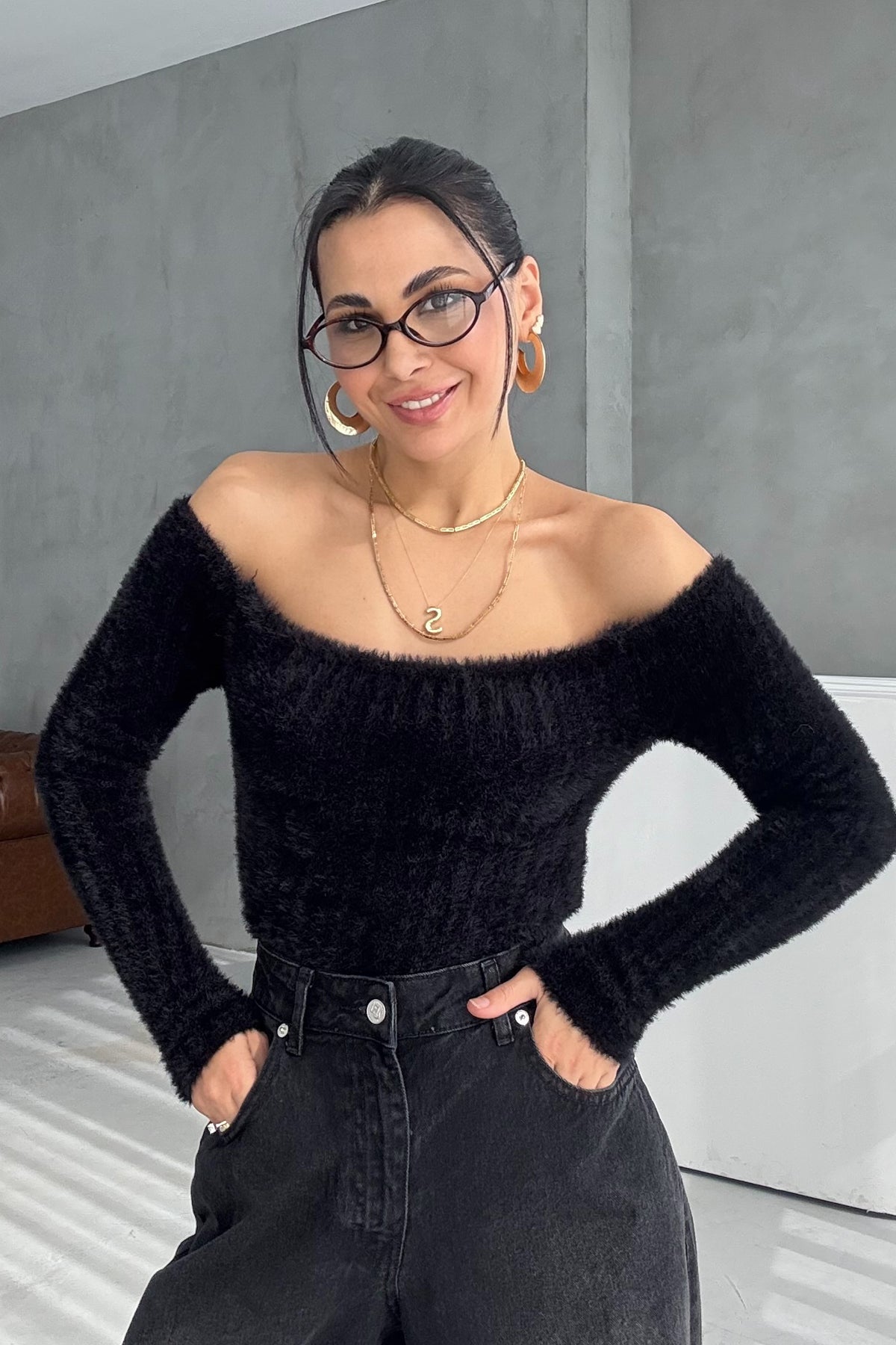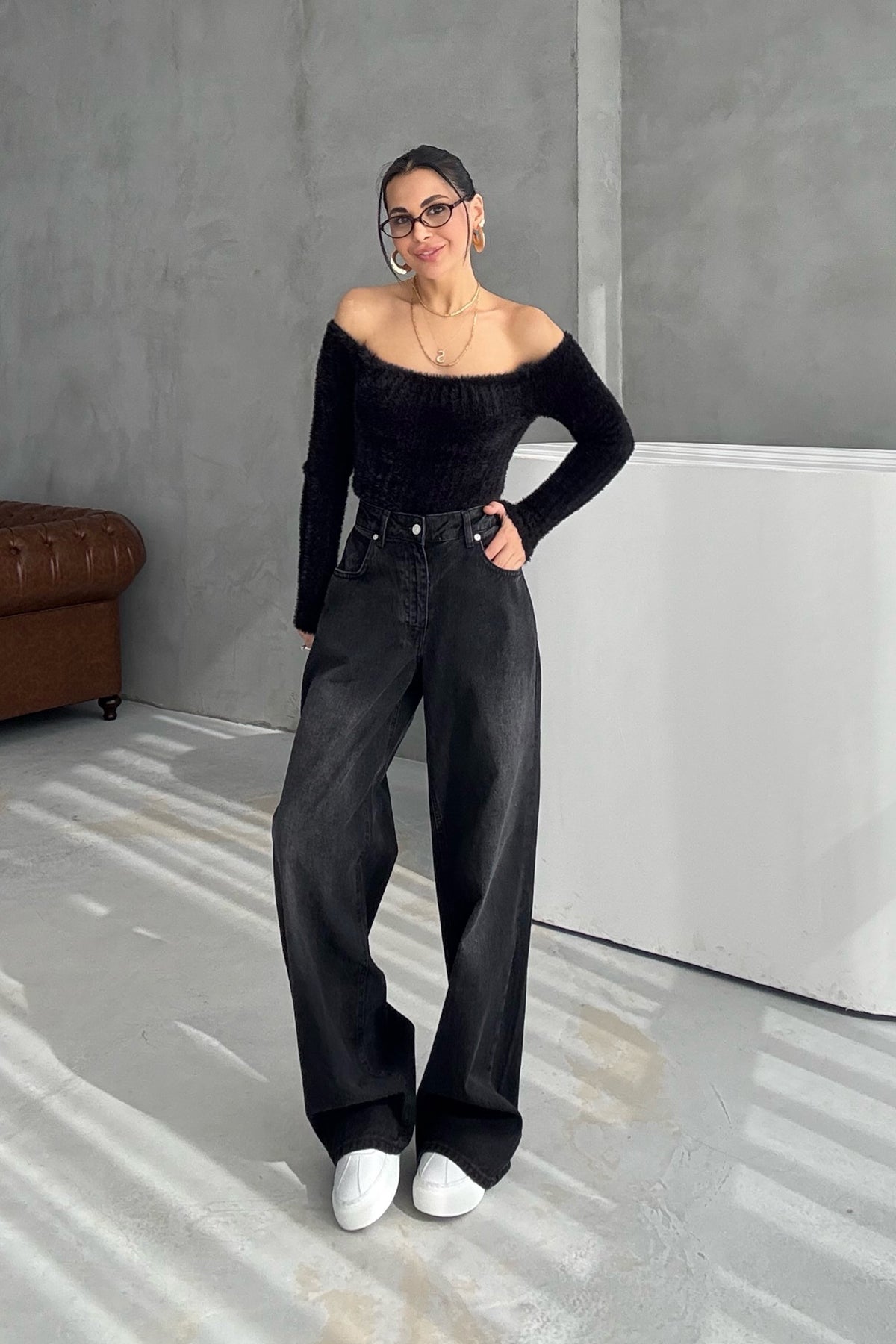 Ürün Detayları :Siyah Sakallı Kayık Yaka Triko Kazak