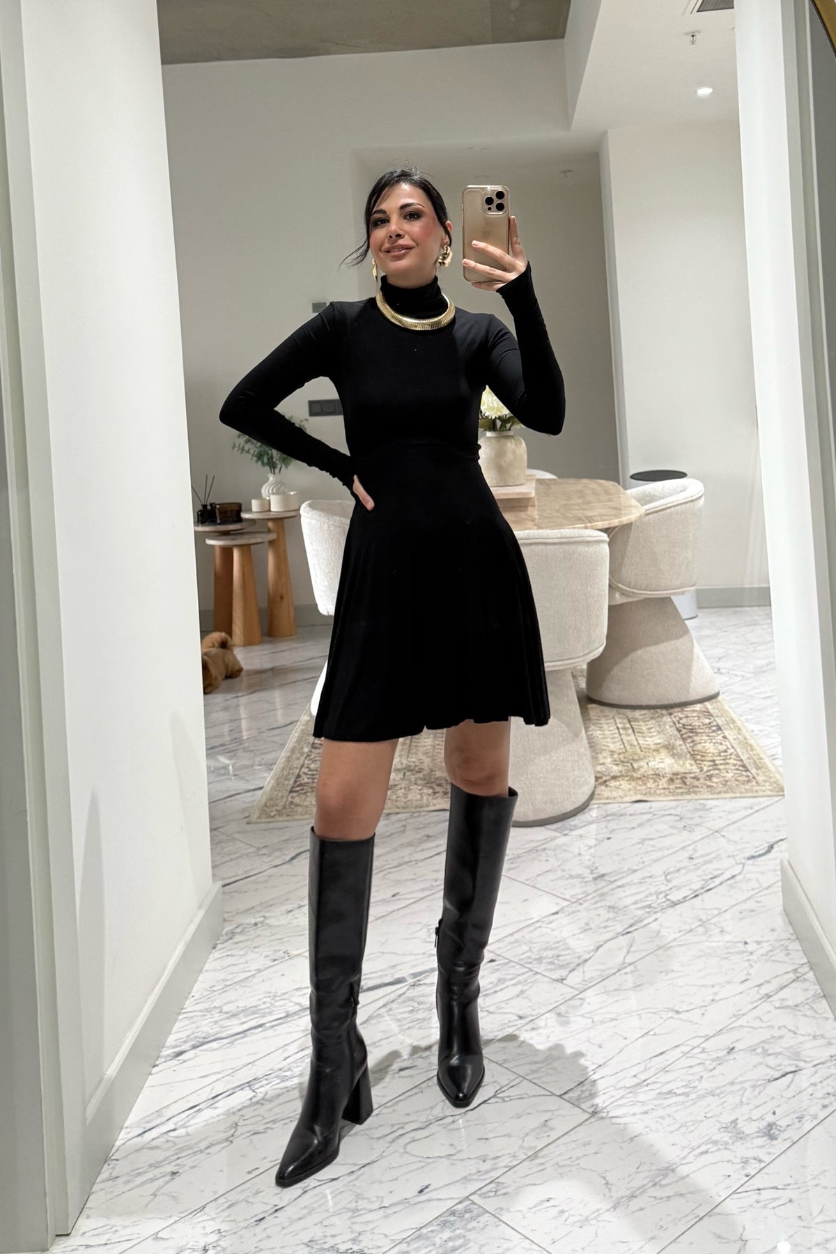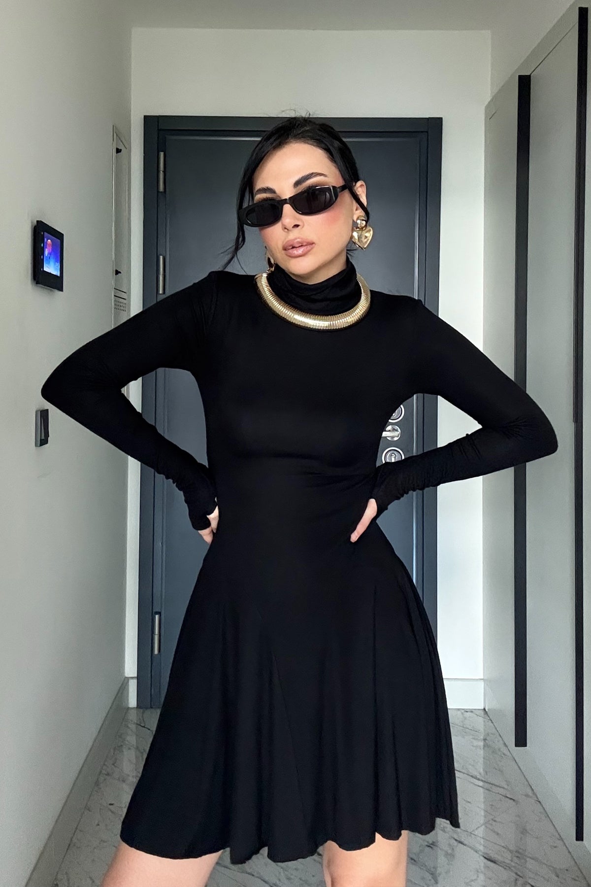 Uzun Kollu Eteği Volanlı Siyah Mini Elbise SY-3543-Siyah