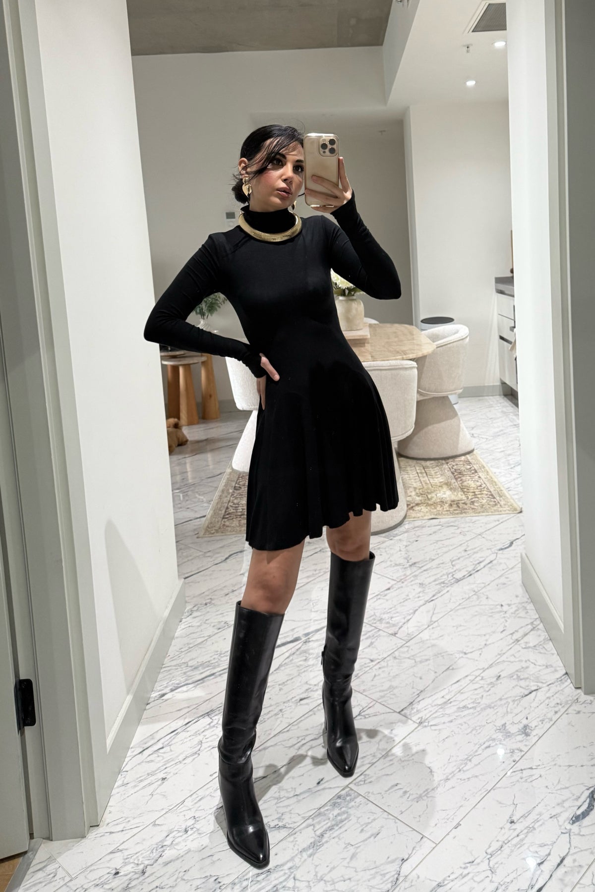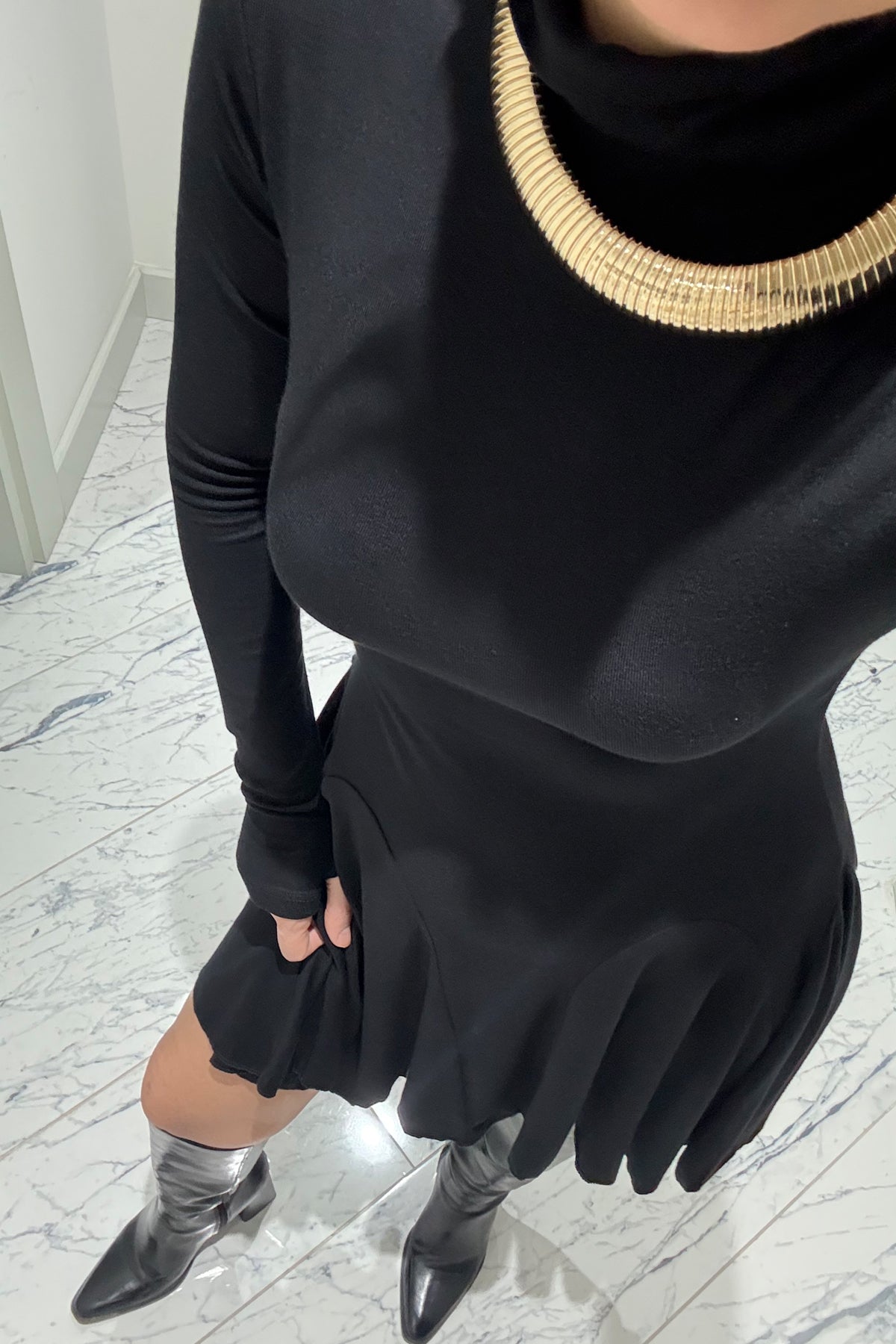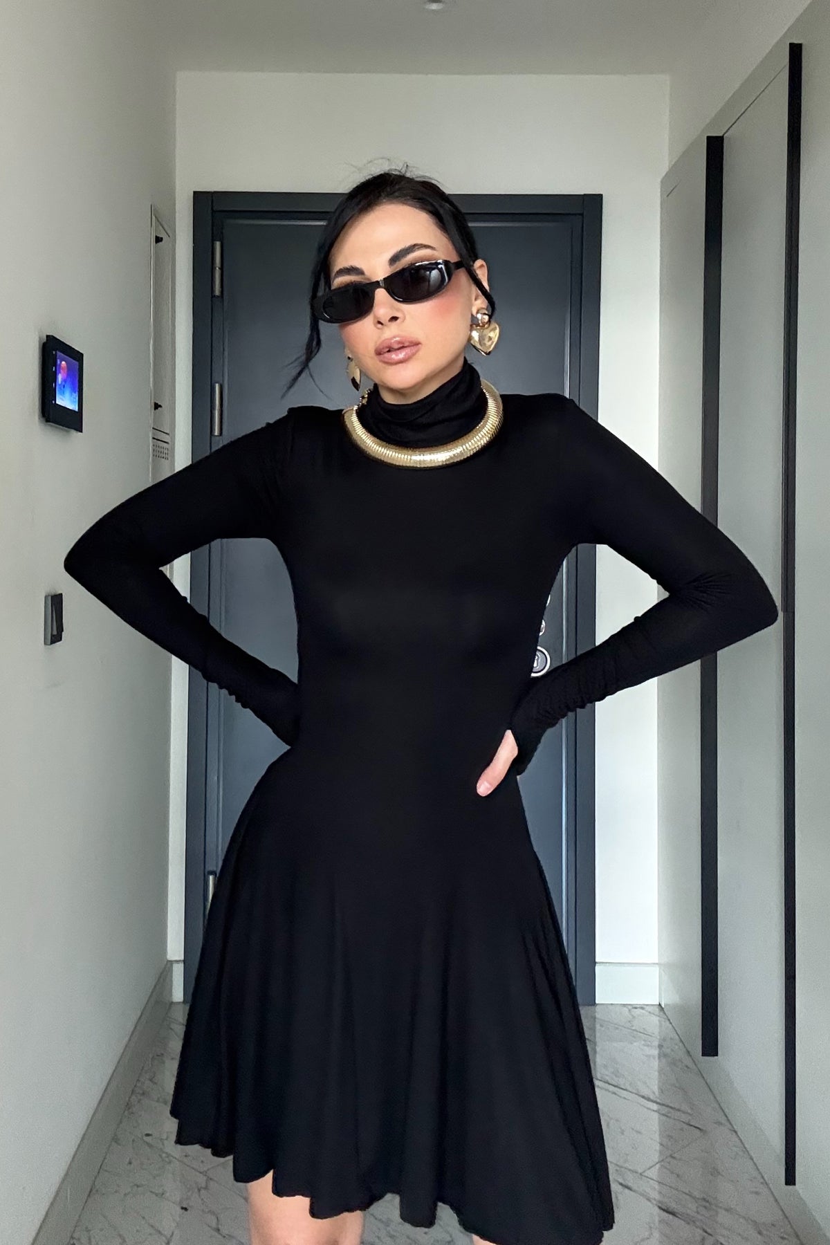 Ürün Detayları:Uzun Kollu Eteği Volanlı Siyah Mini Elbise
