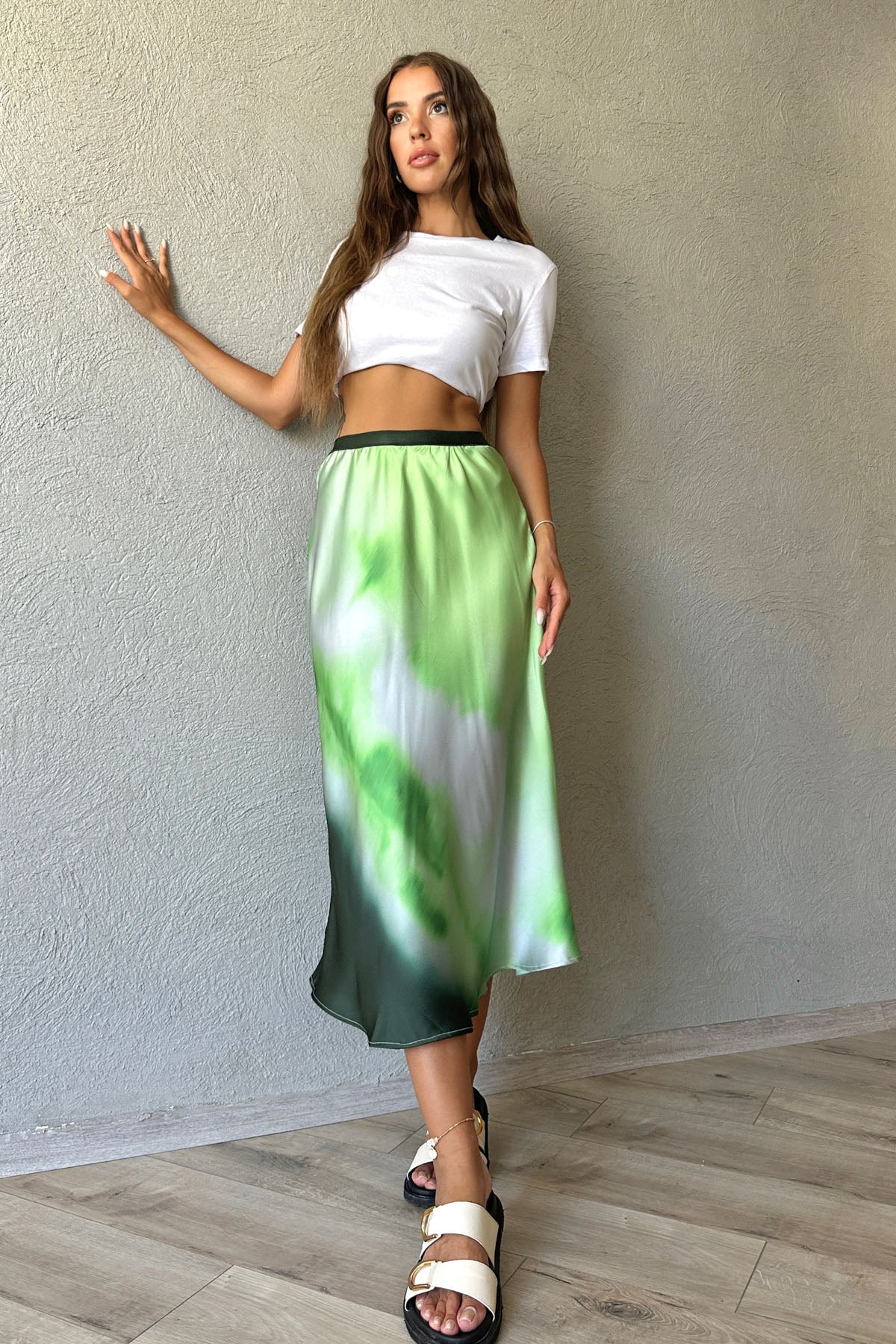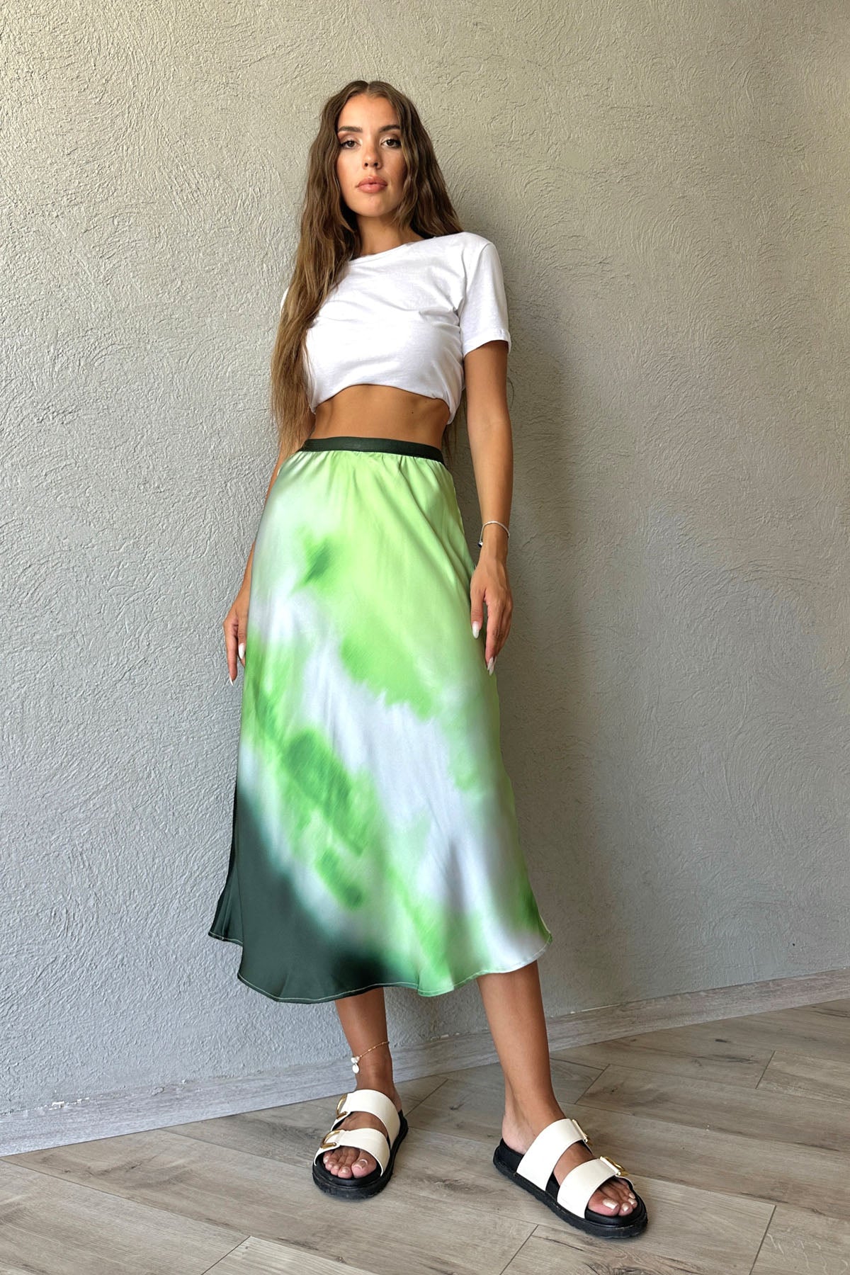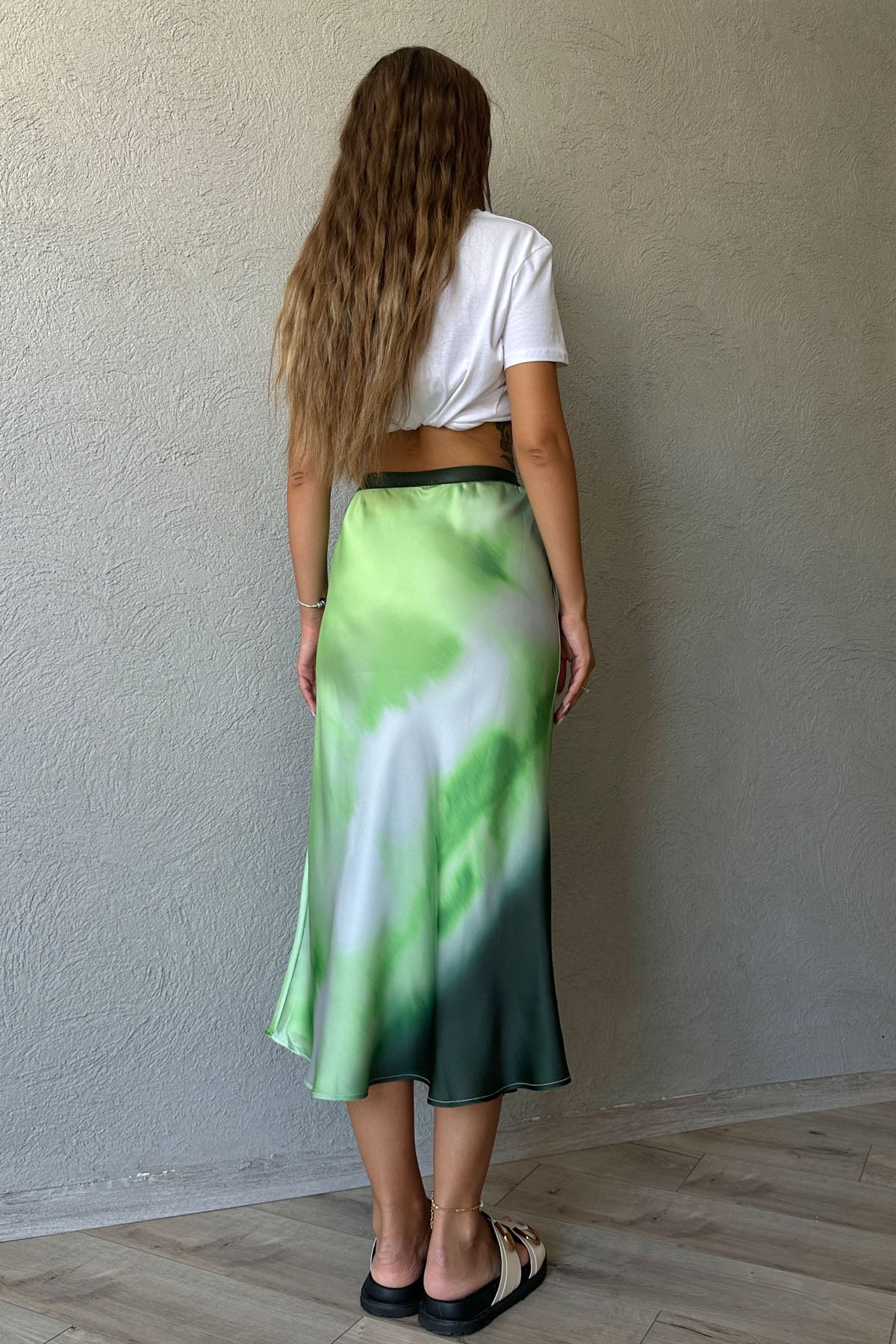 Yeşil Batik Desen Beli Lastikli Saten Etek SY-0892-Yeşil