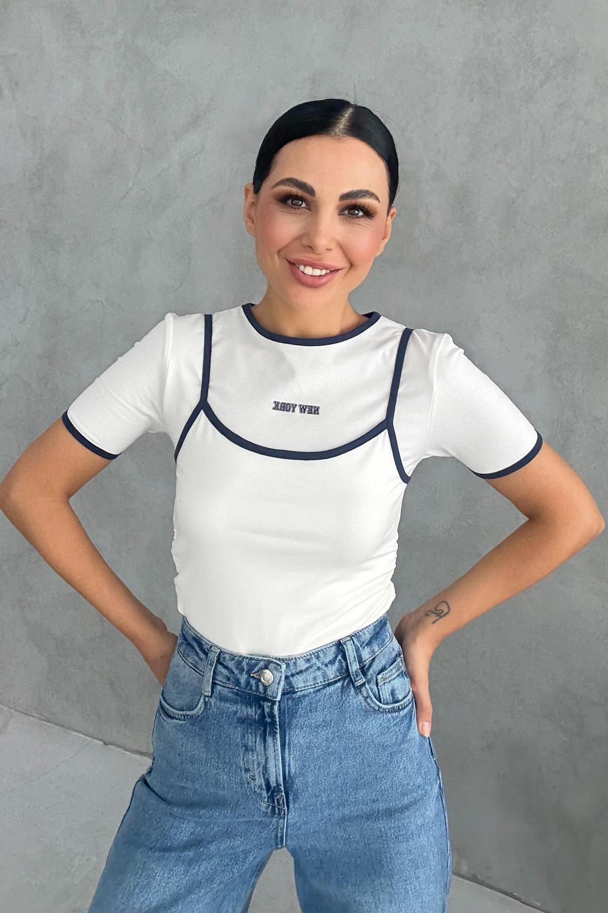 Ekru Atlet Detaylı Yan Büzgülü Bisiklet Yaka T-shirt (SY-3317-Ekru)