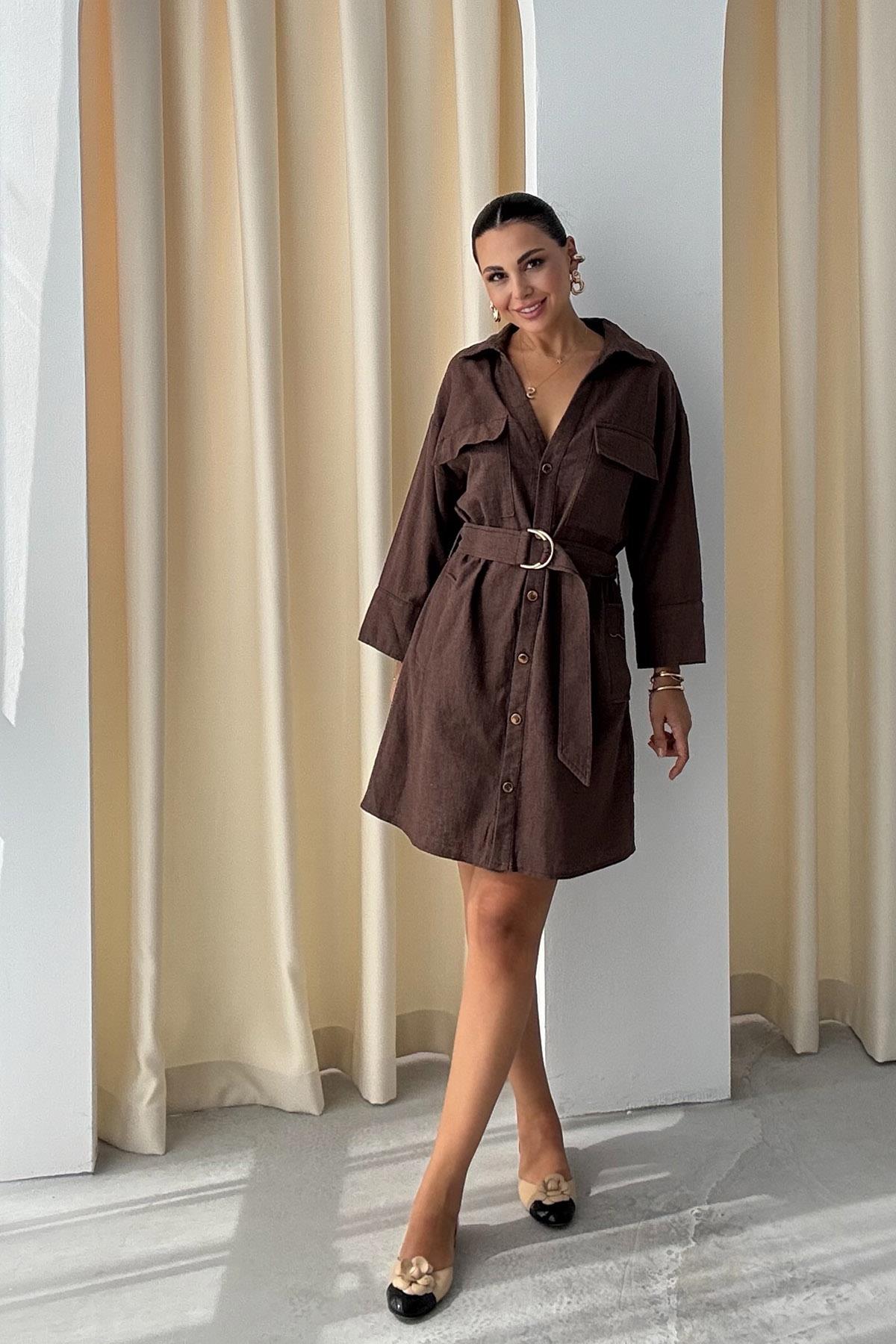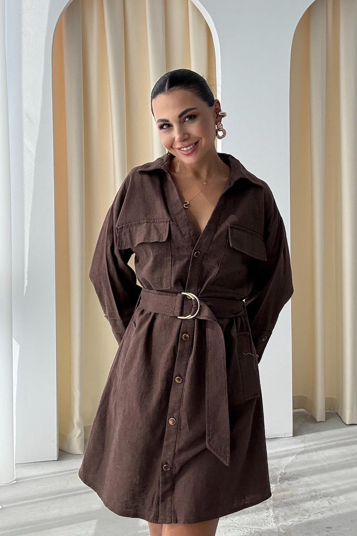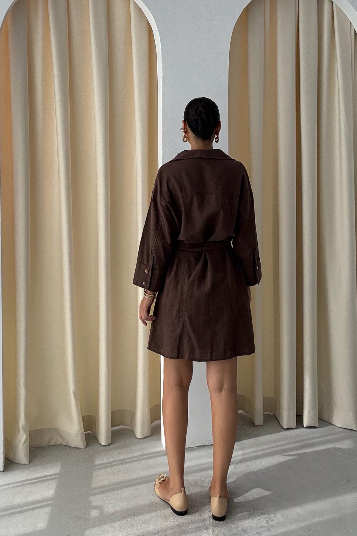 Kahve Keten Kuşaklı Gömlek Elbise (SY-3213-Kahve)
