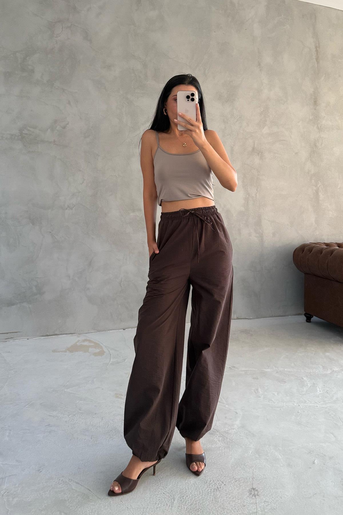 Kahve Paçası Lastikli Balon Pantolon (SY-3341-Kahve)