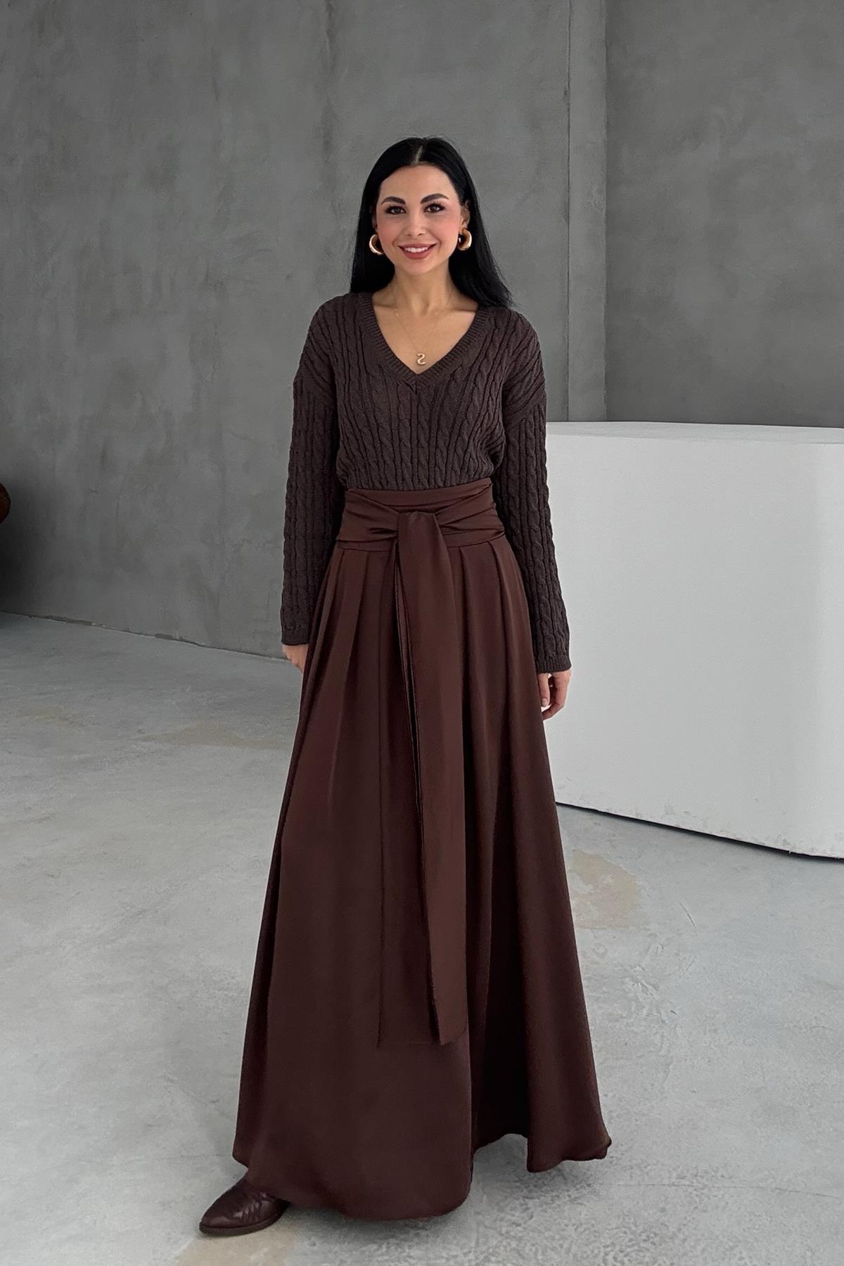 Ürün Detayları :Kahve Şal Detay Bağlamalı Maxi Etek Arka bel kısmı lastiklidir