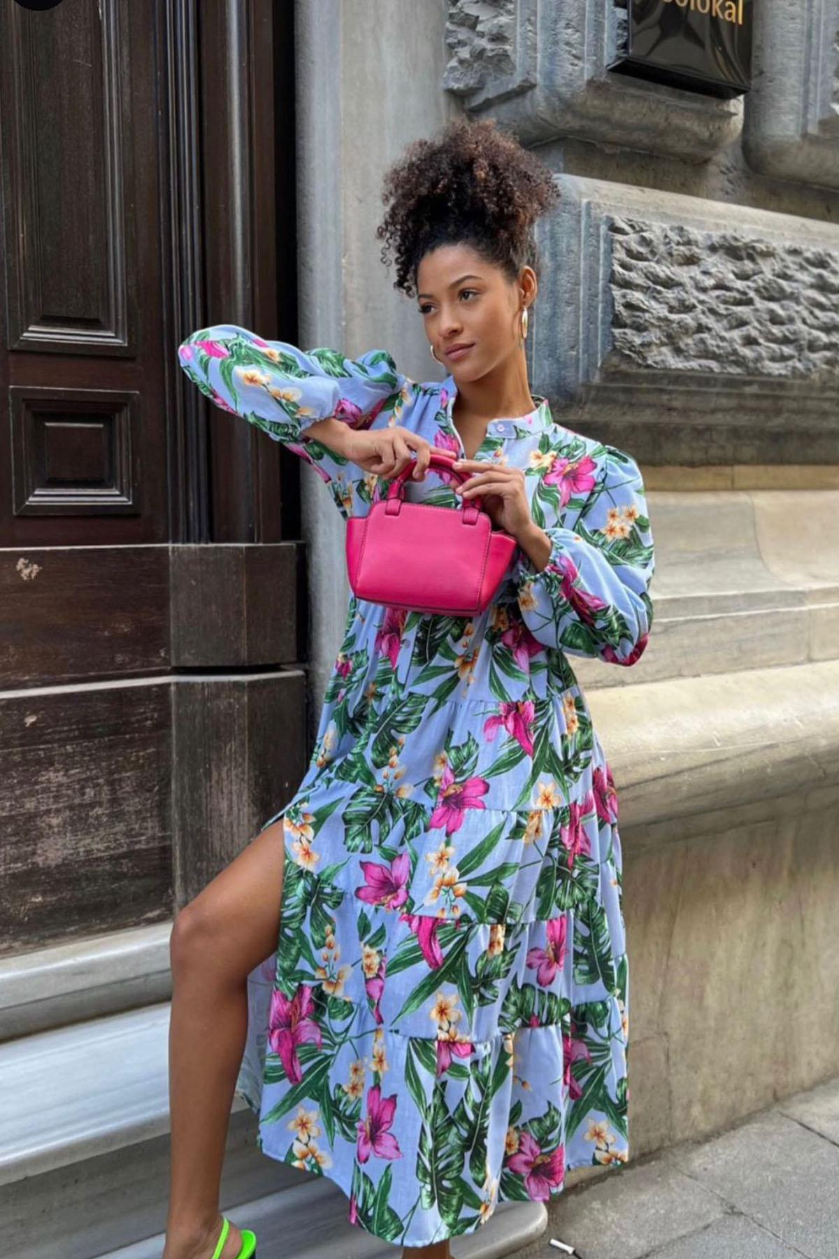 Pembe ve birçok renkleri barındıran deseni ile bu elbise kaçmaz !