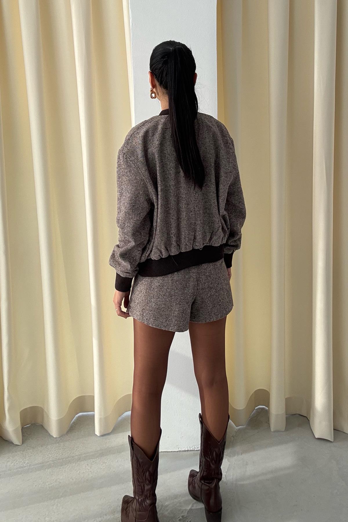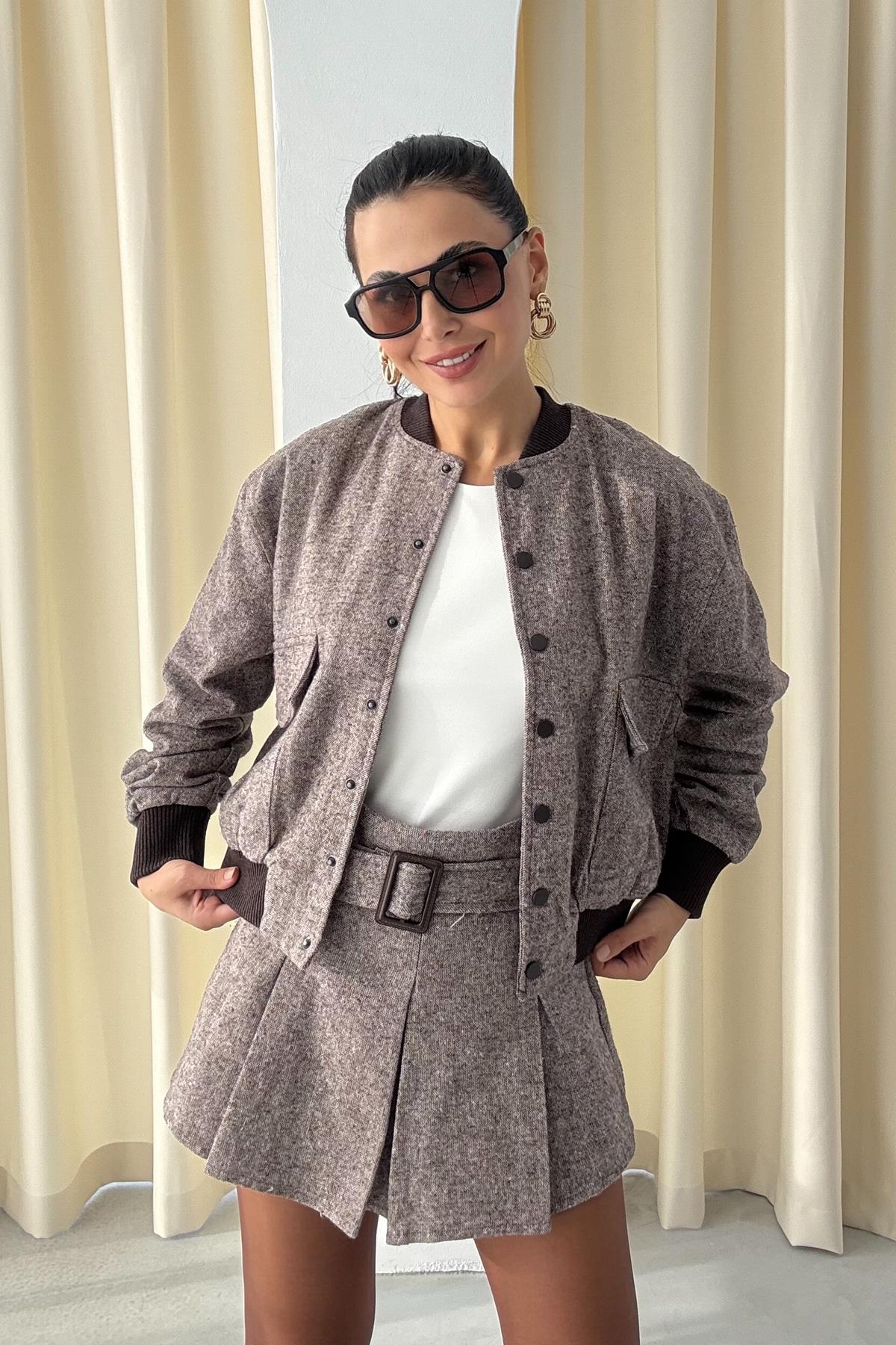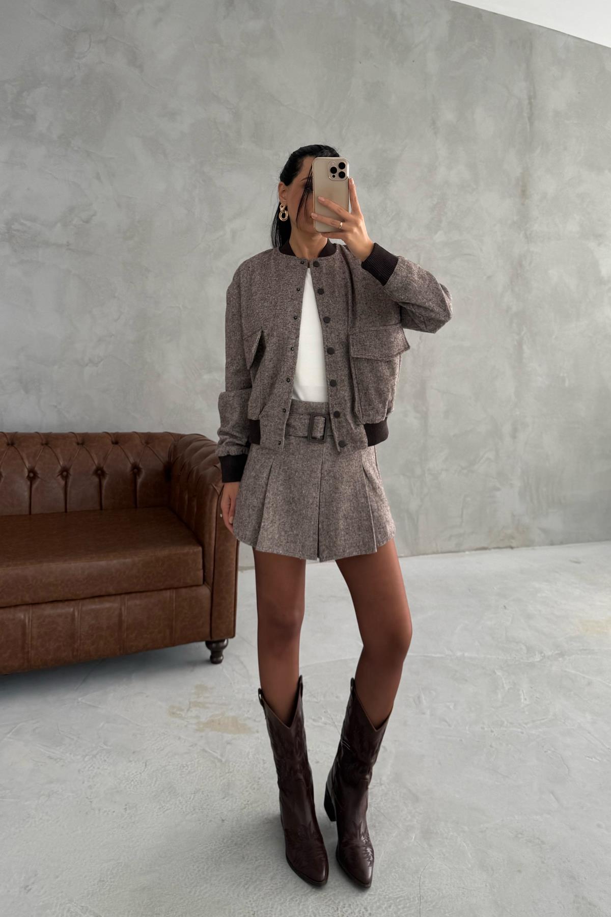 Ürün Detayları ; Vizon Bomber Ceket Kemerli Mini Şort Etek Takım